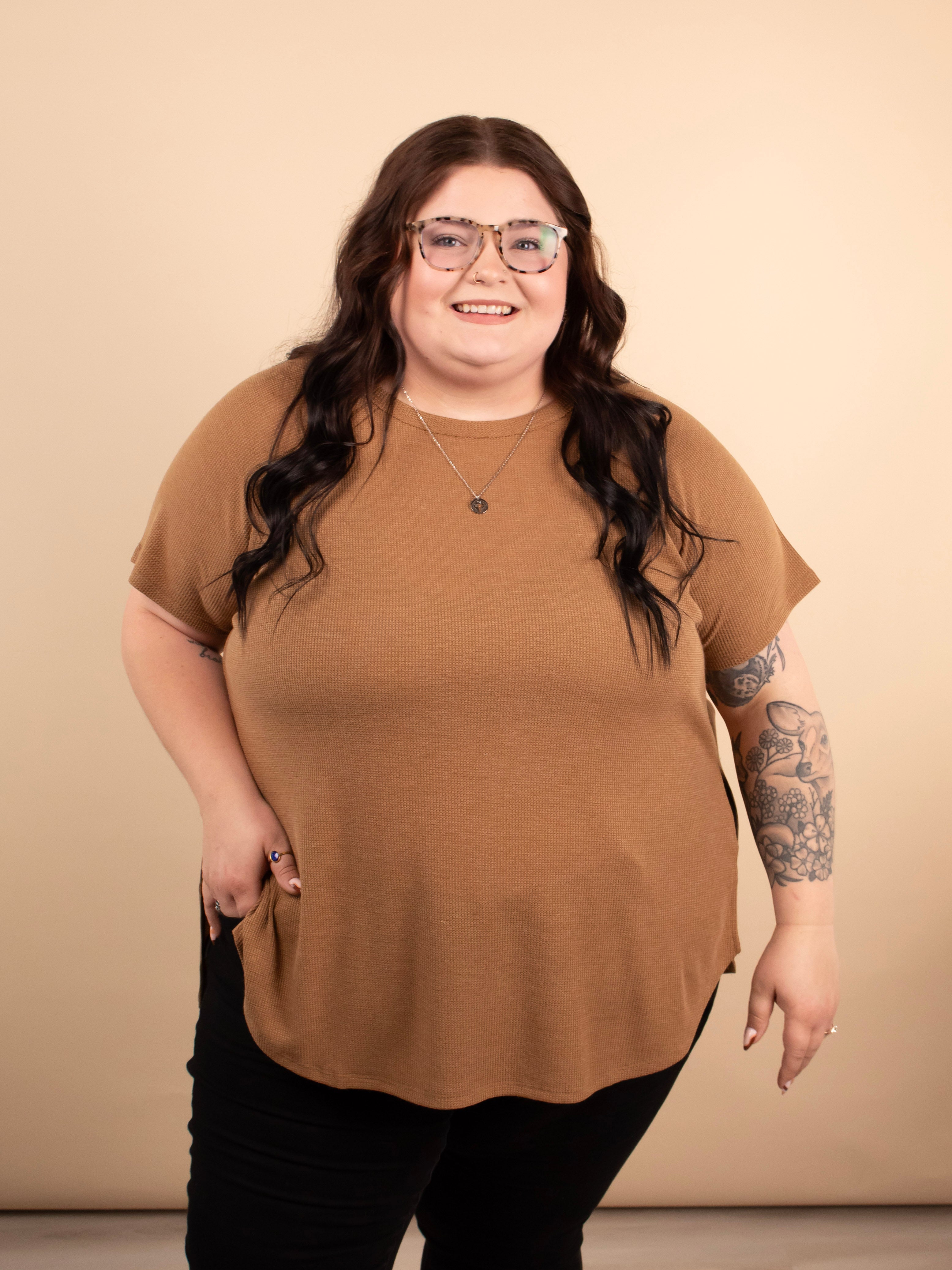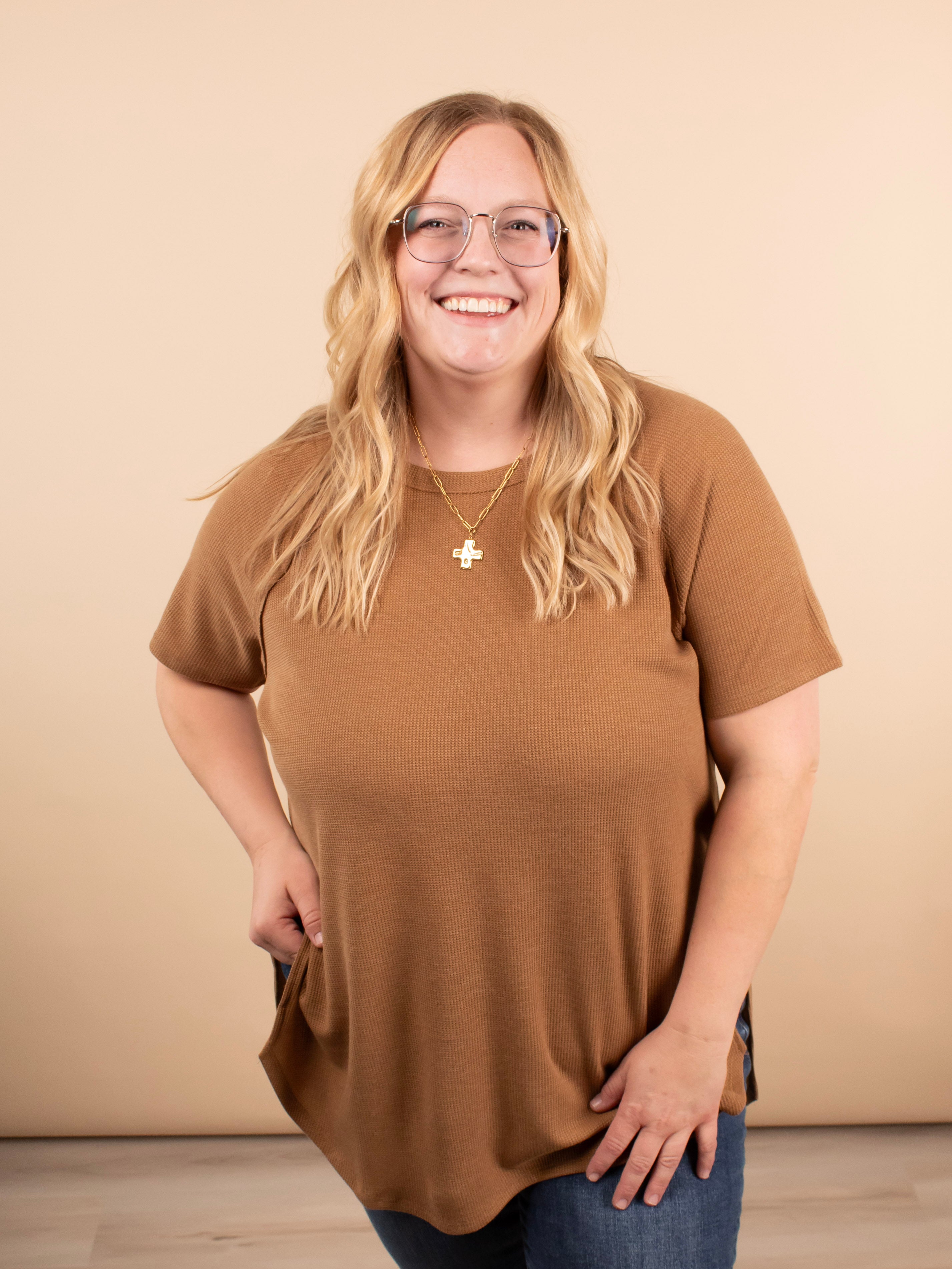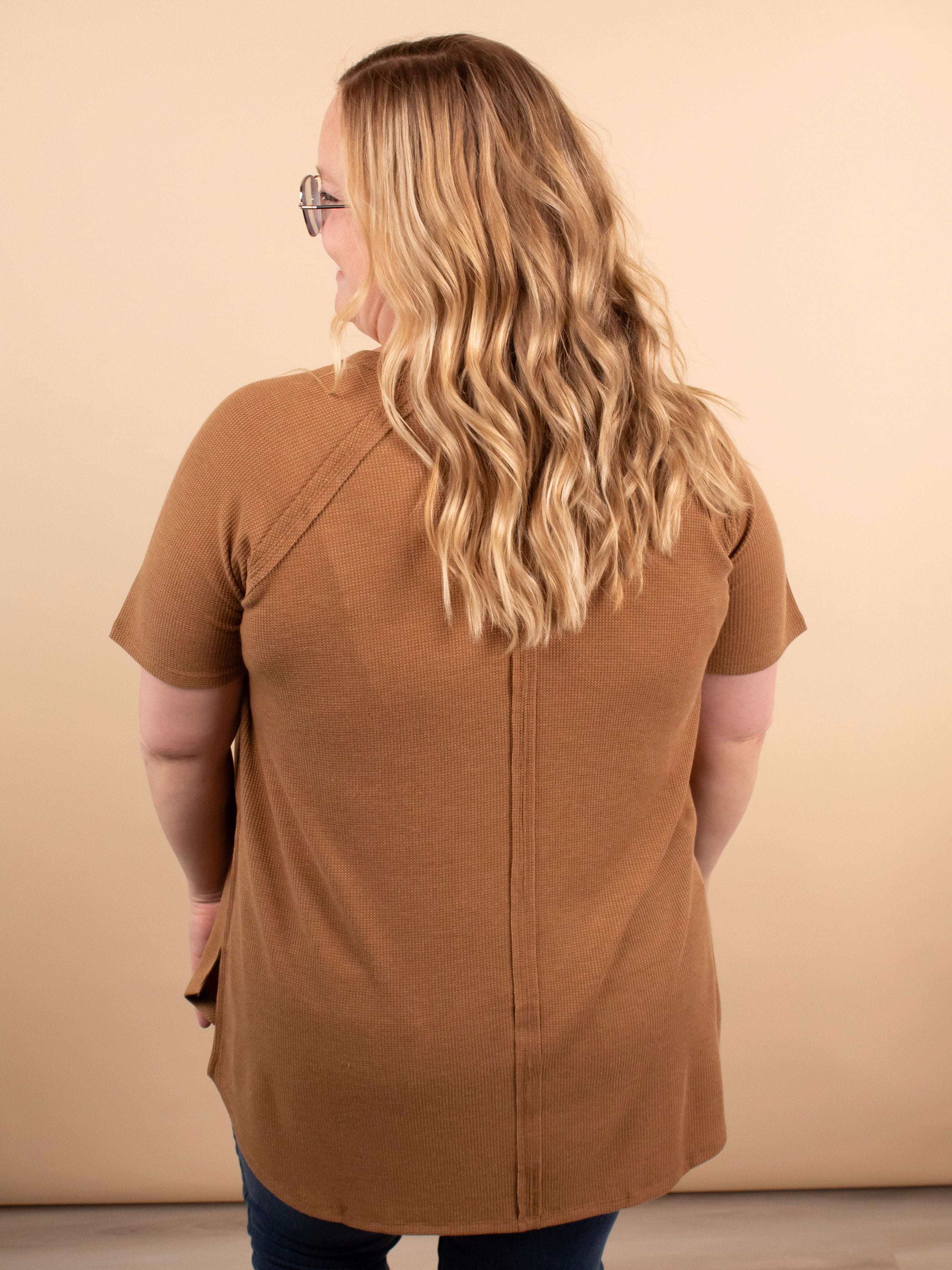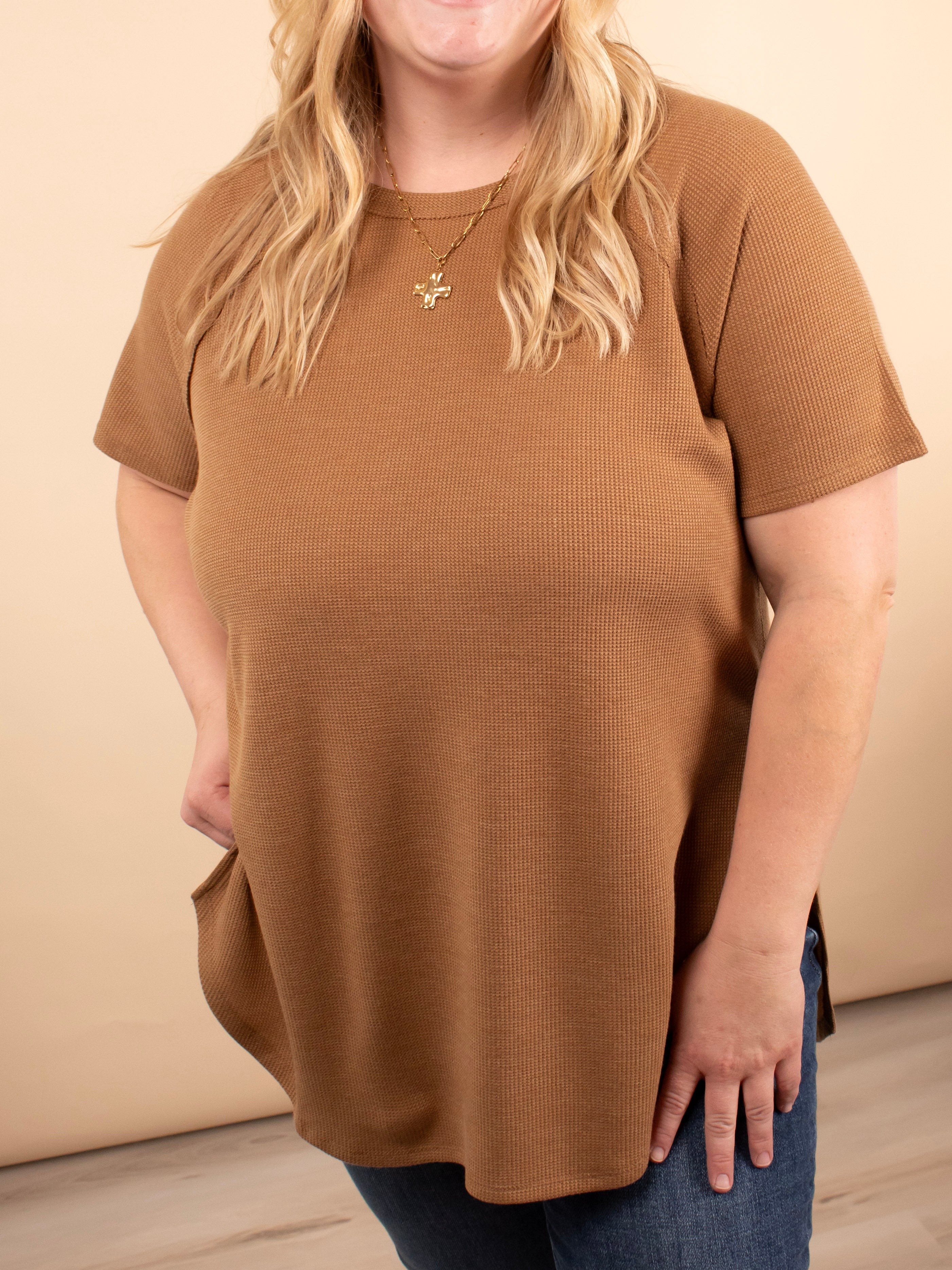 Simple, soft, and endlessly versatile. The Ada Waffle Knit Top in Caramel is crafted from a stretchy waffle knit that feels as good as it looks. With its relaxed fit, hi-low hem, and side slit detail, it’s the perfect everyday top for layering or wearing solo.