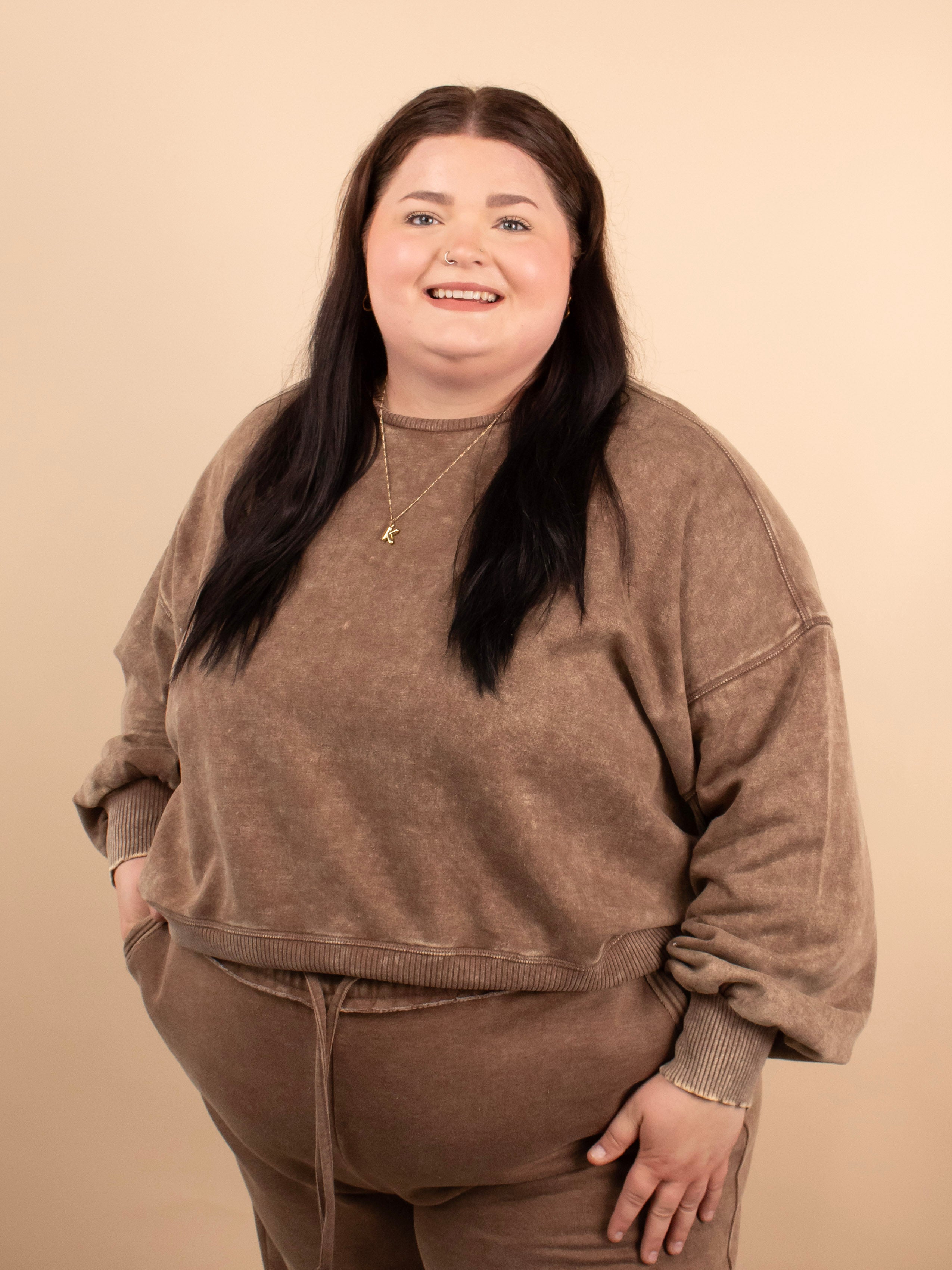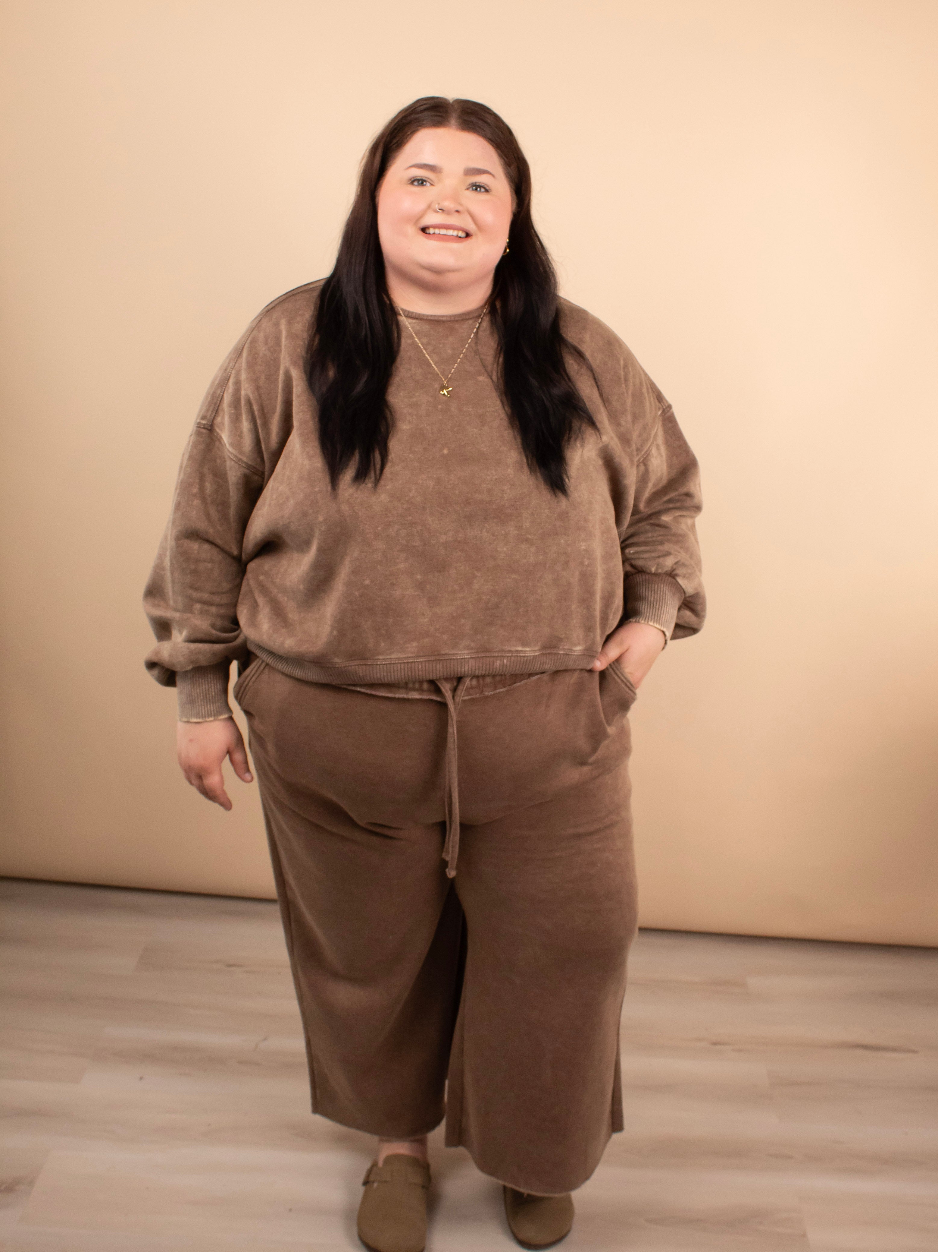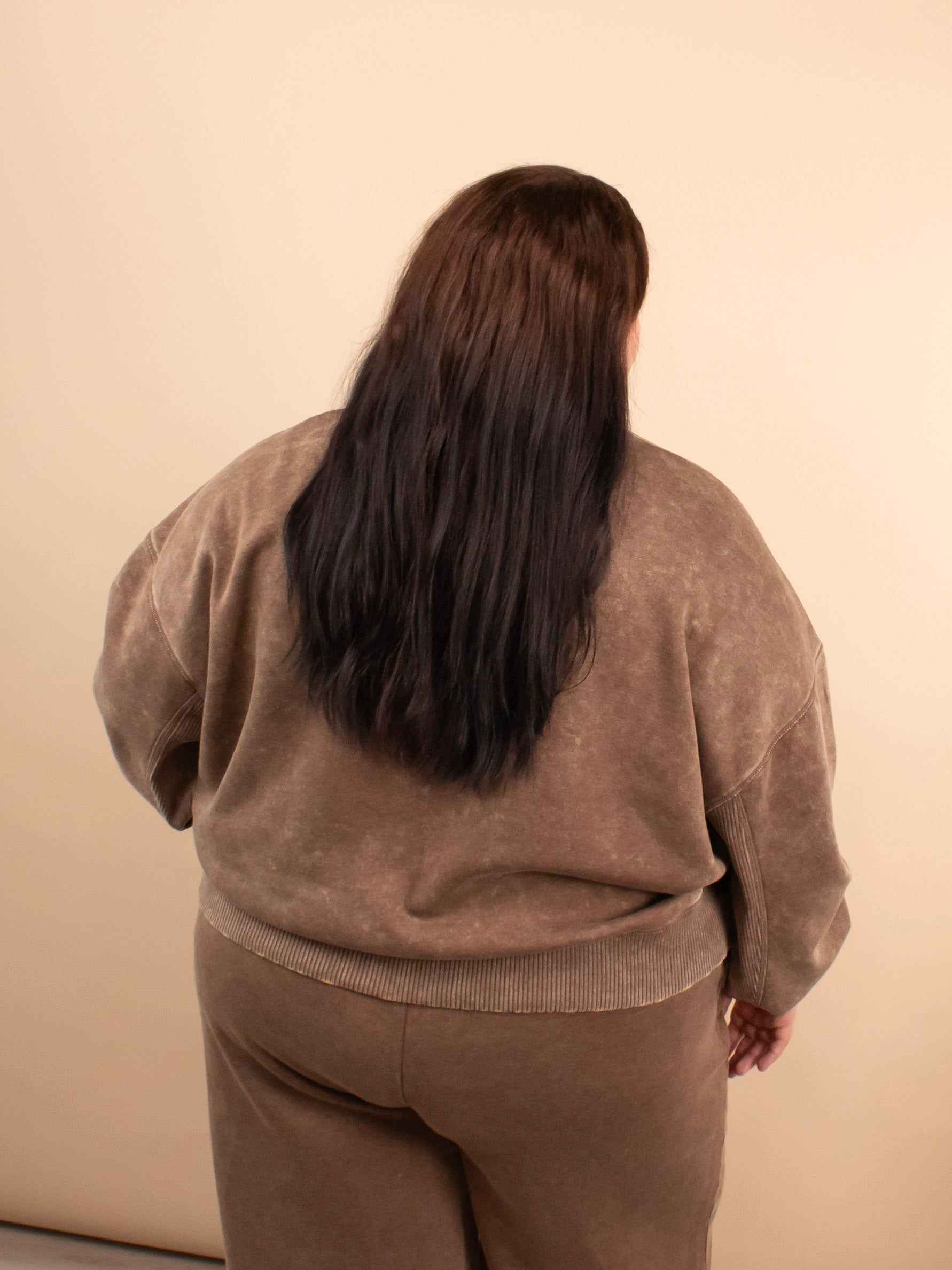 Super soft and effortlessly cozy, the All Day Comfort Oversized Pullover in Mocha is the ultimate fall essential. With its oversized fit, ribbed waistband and inner arm detail, and perfect autumn brown tone, this pullover is made for lounging, layering, or pairing with the matching cropped sweatpants (sold separately).