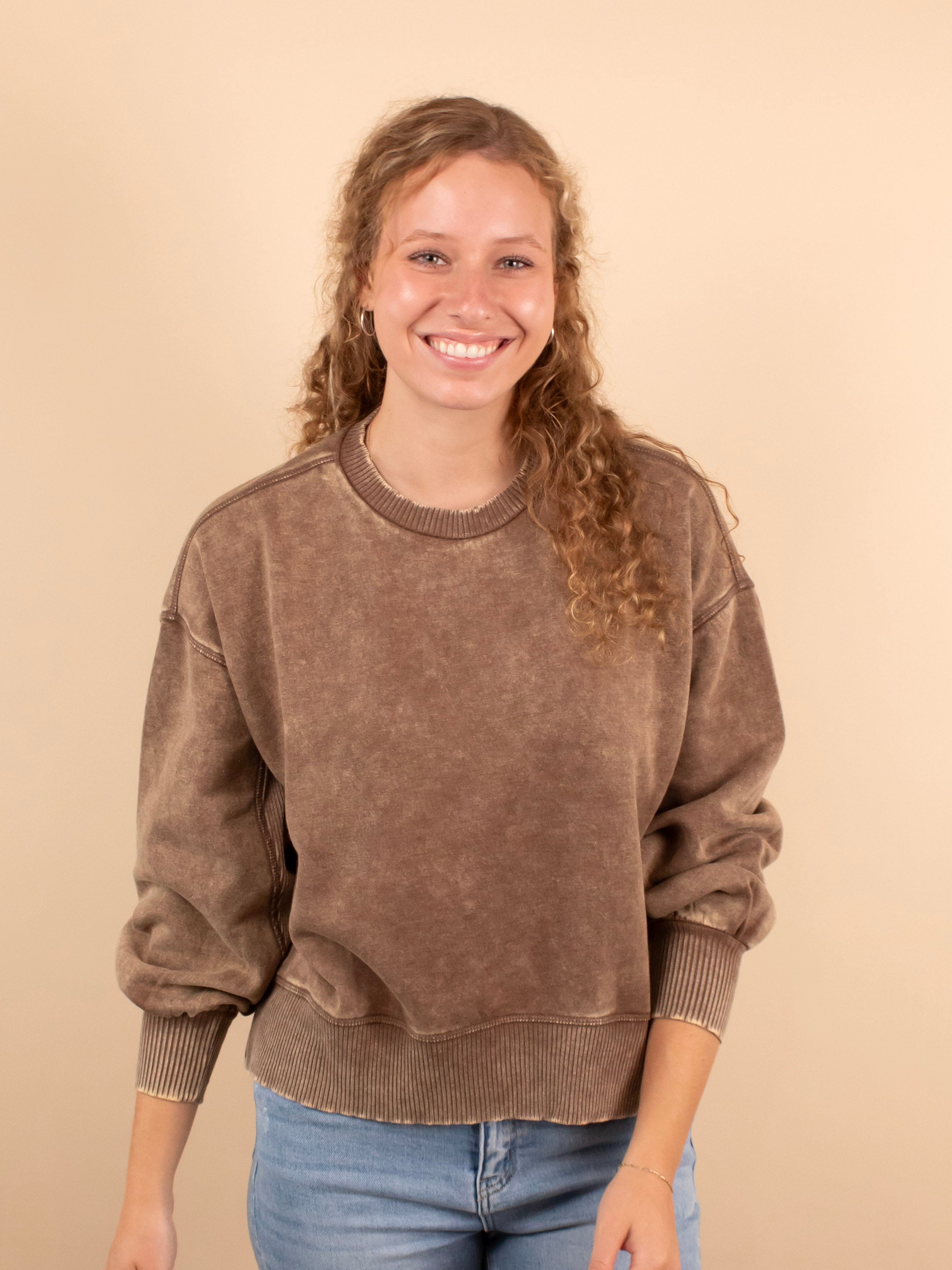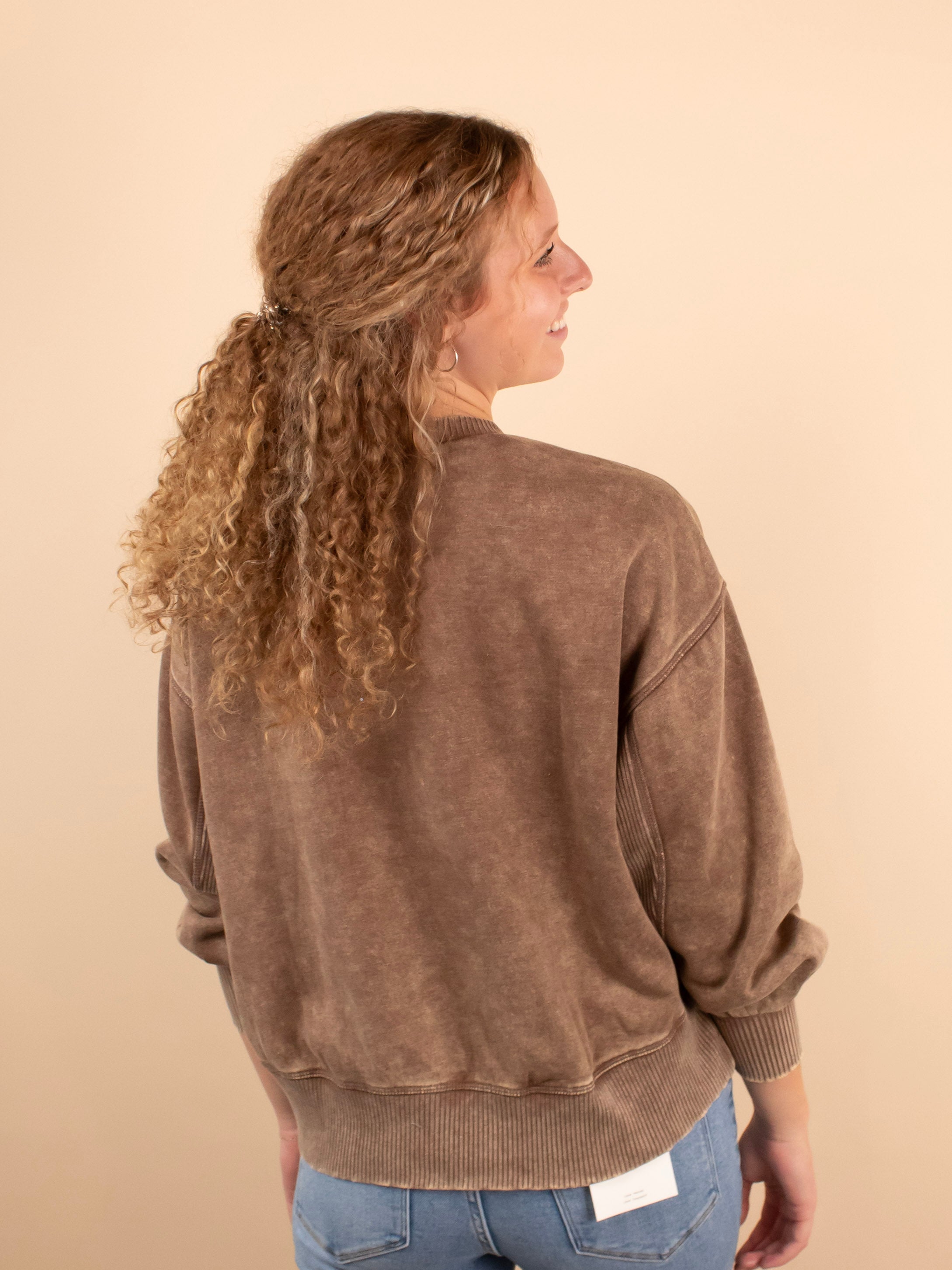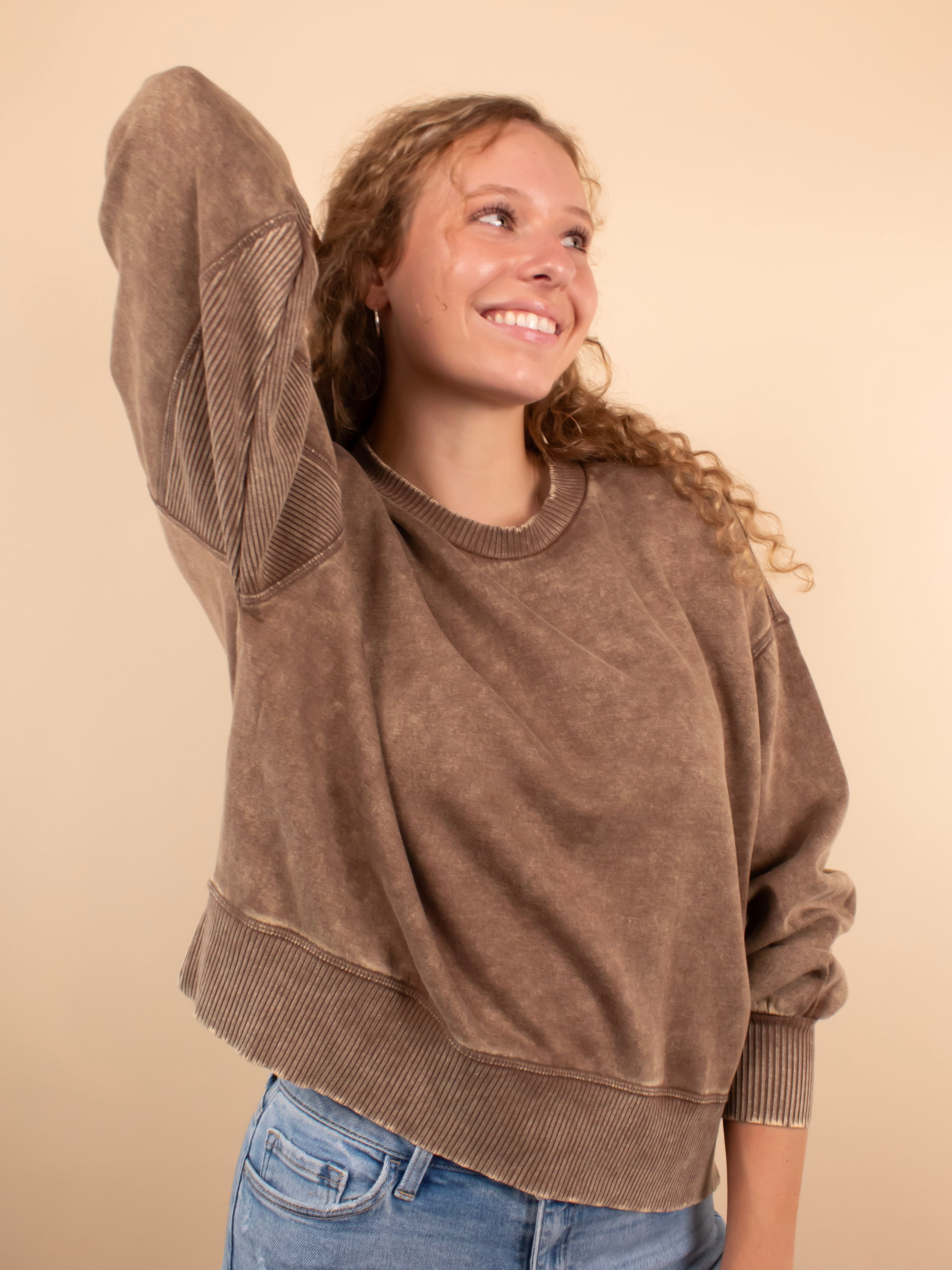 Super soft and effortlessly cozy, the All Day Comfort Oversized Pullover in Mocha is the ultimate fall essential. With its oversized fit, ribbed waistband and inner arm detail, and perfect autumn brown tone, this pullover is made for lounging, layering, or pairing with the matching cropped sweatpants (sold separately).