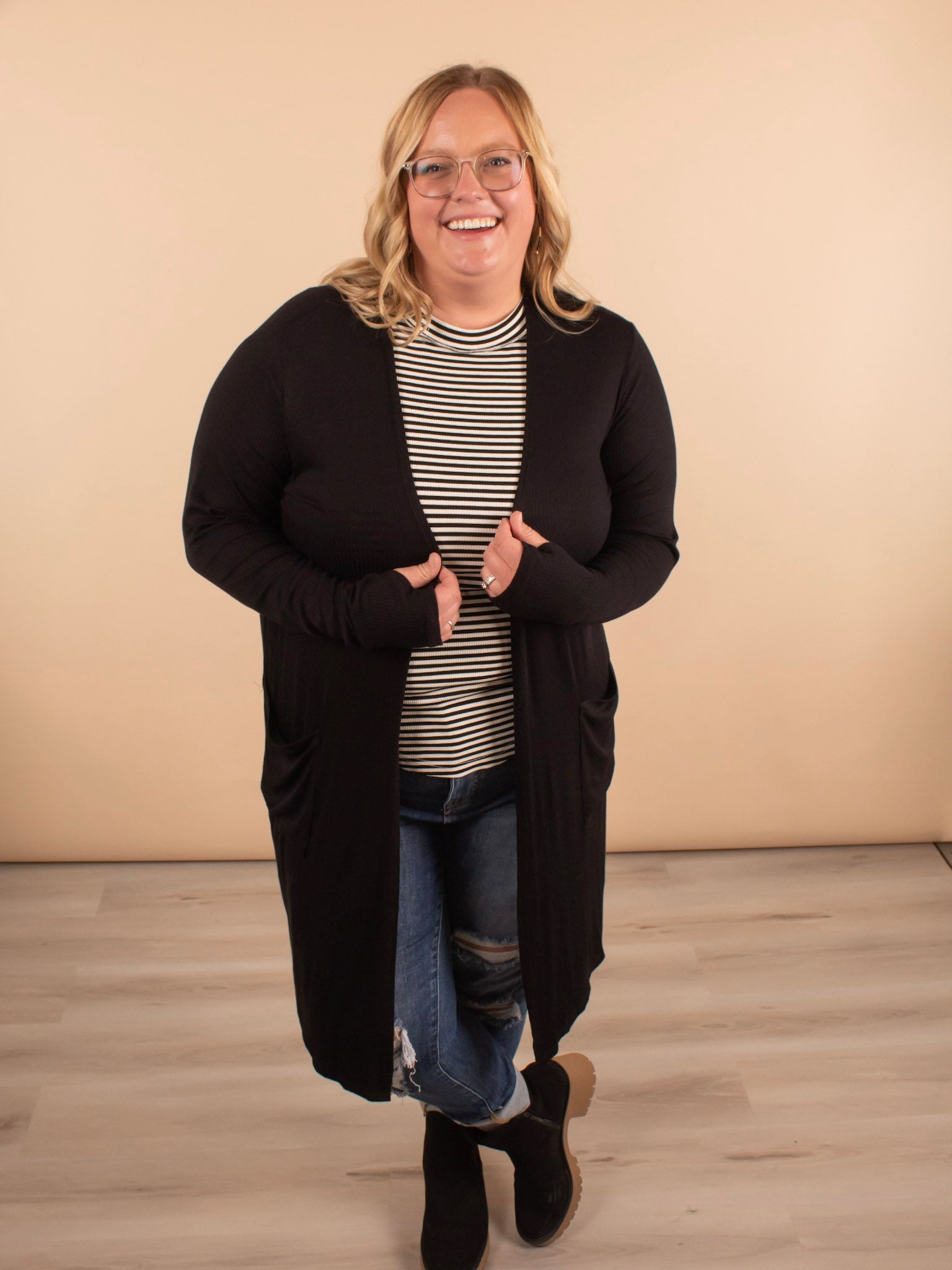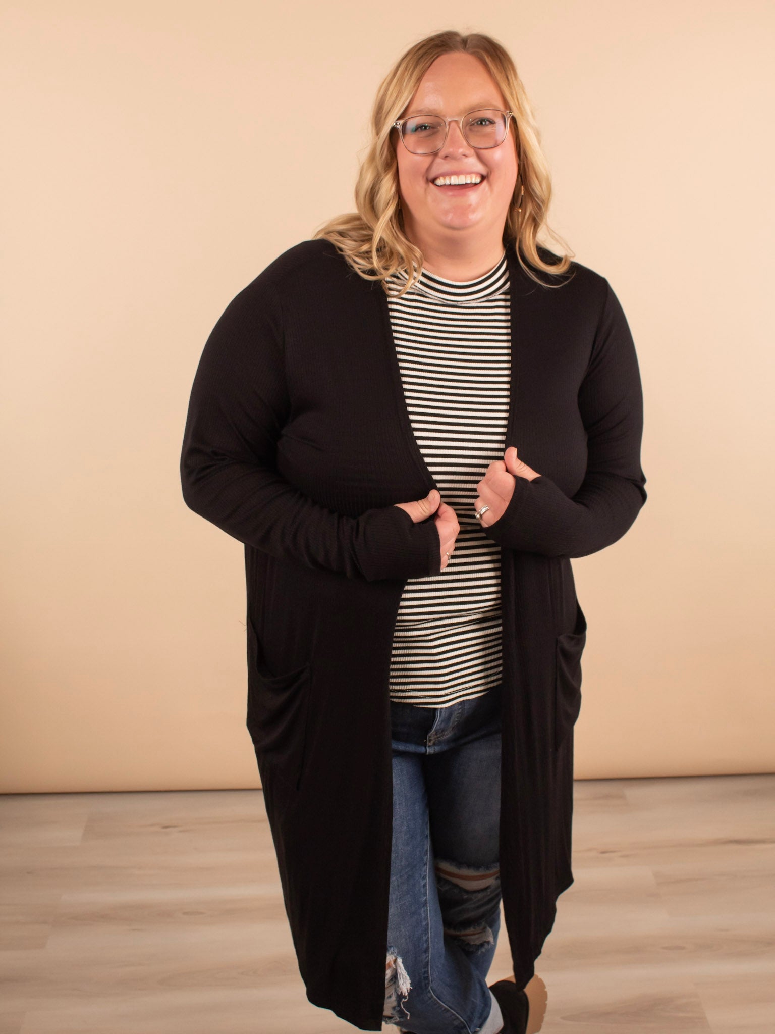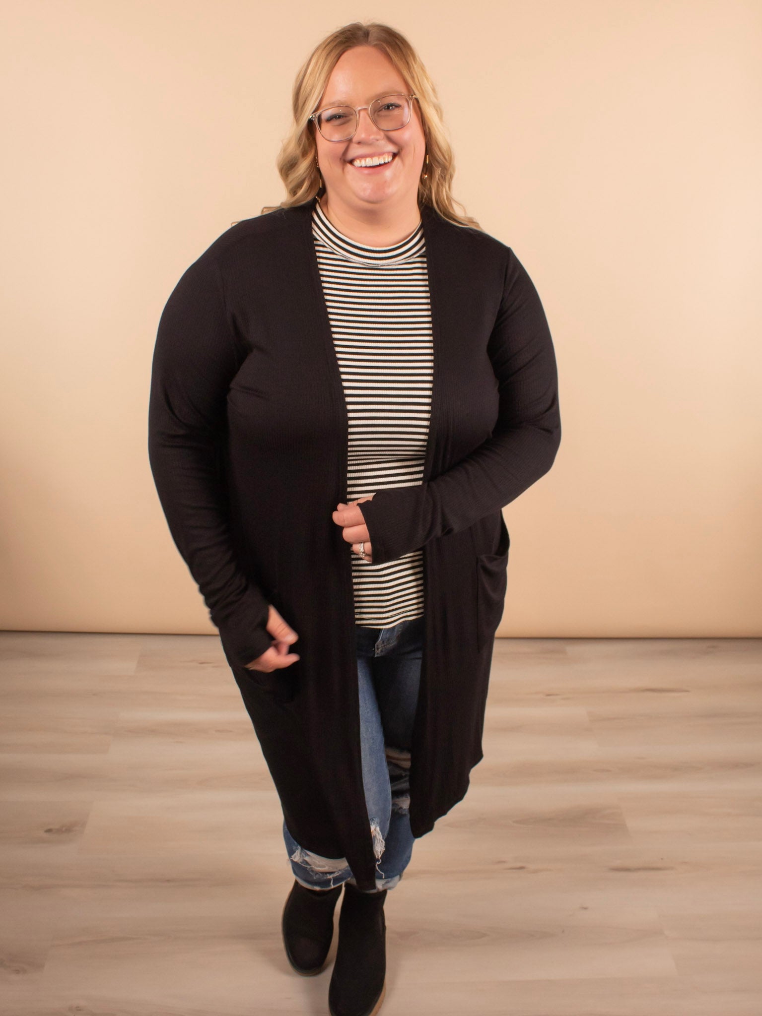 The Aspen Ribbed Cardigan is an absolute dream. Featuring lightweight, soft, and stretchy fabric with pockets and an optional thumb hole. This piece is a perfect layering must-have for any wardrobe. You will be grabbing for it on days where you want to wear long sleeves, but don't need something thick and overly warm! Pair with a tank, t-shirt, or over a long sleeve top to add additional warmth.
