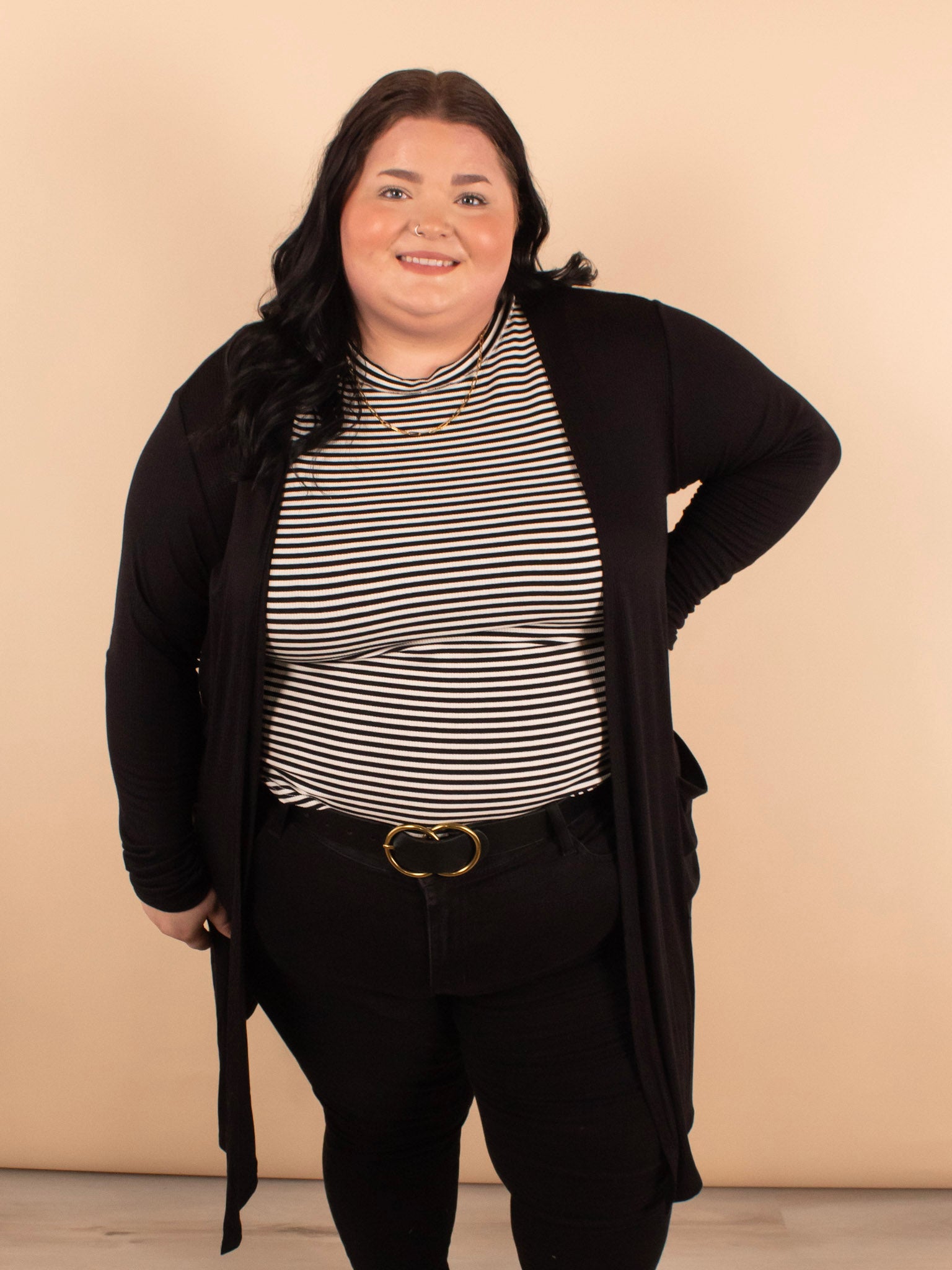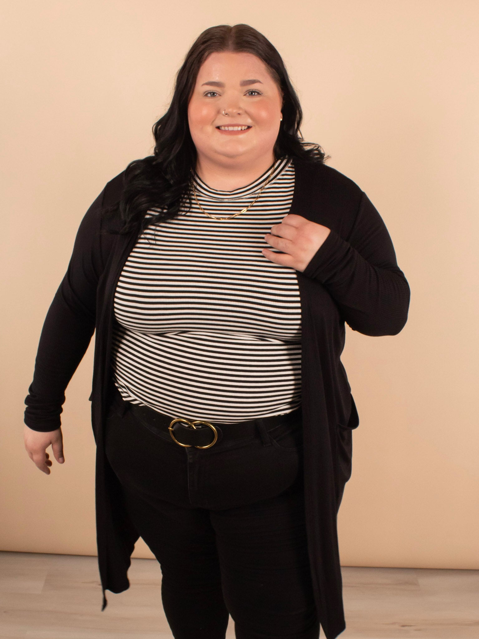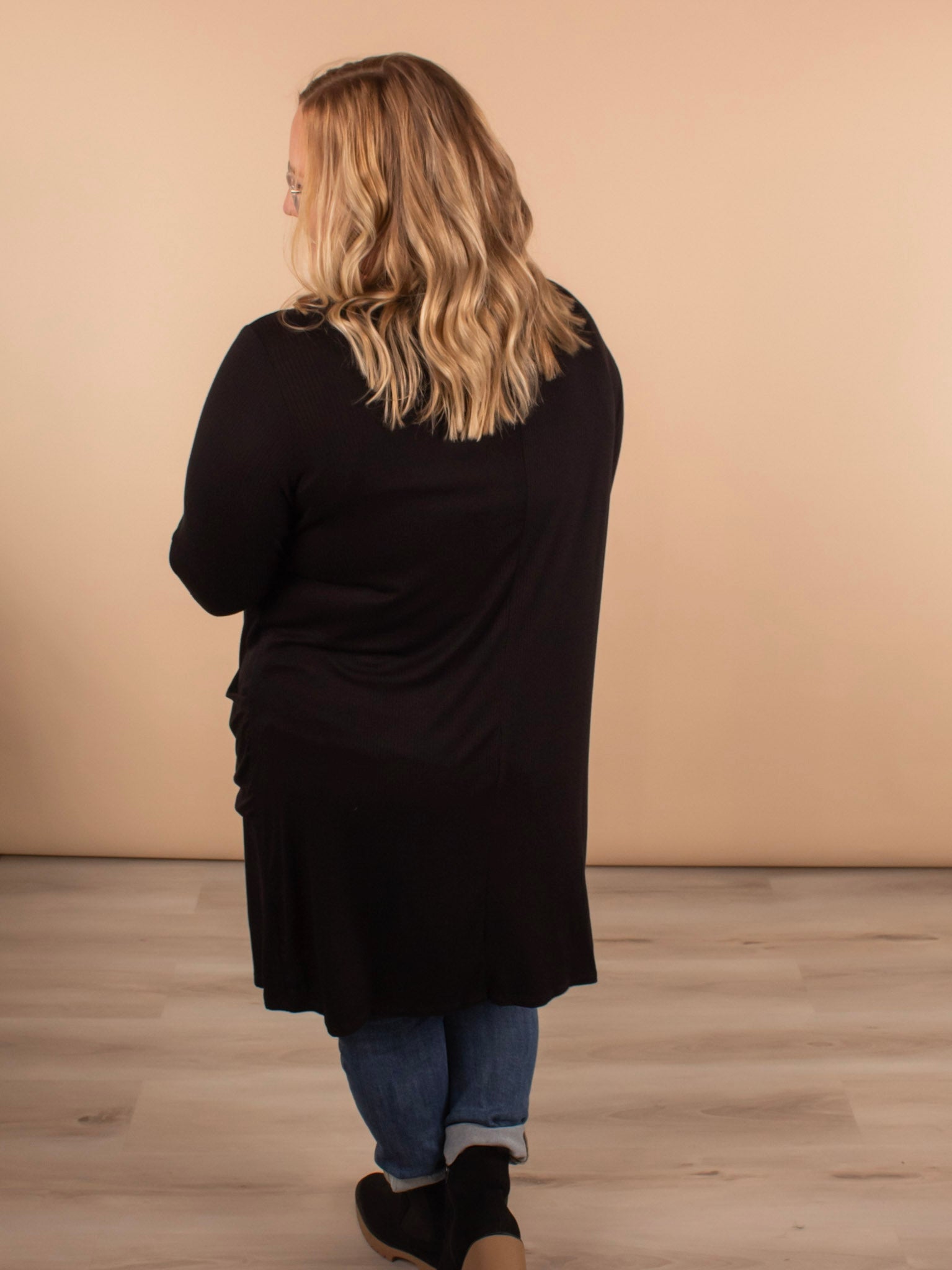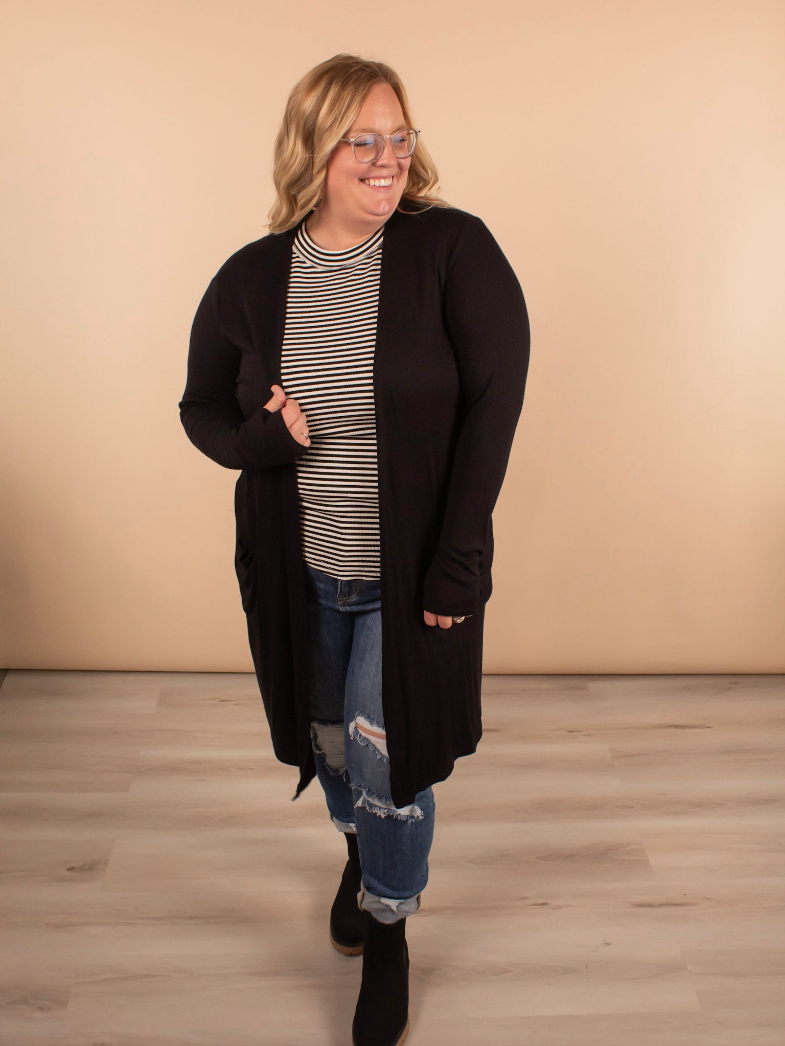 The Aspen Ribbed Cardigan is an absolute dream. Featuring lightweight, soft, and stretchy fabric with pockets and an optional thumb hole. This piece is a perfect layering must-have for any wardrobe. You will be grabbing for it on days where you want to wear long sleeves, but don't need something thick and overly warm! Pair with a tank, t-shirt, or over a long sleeve top to add additional warmth.