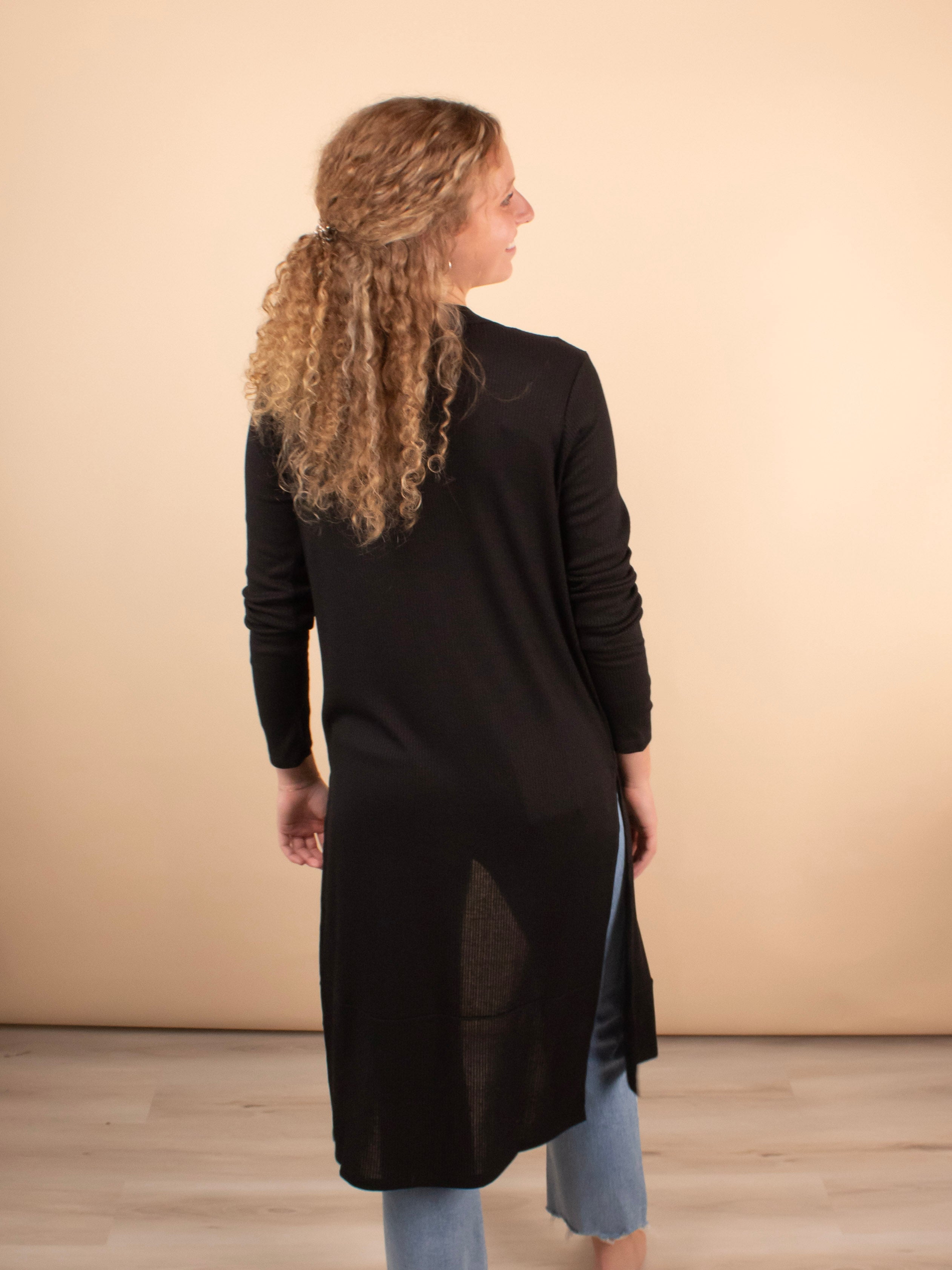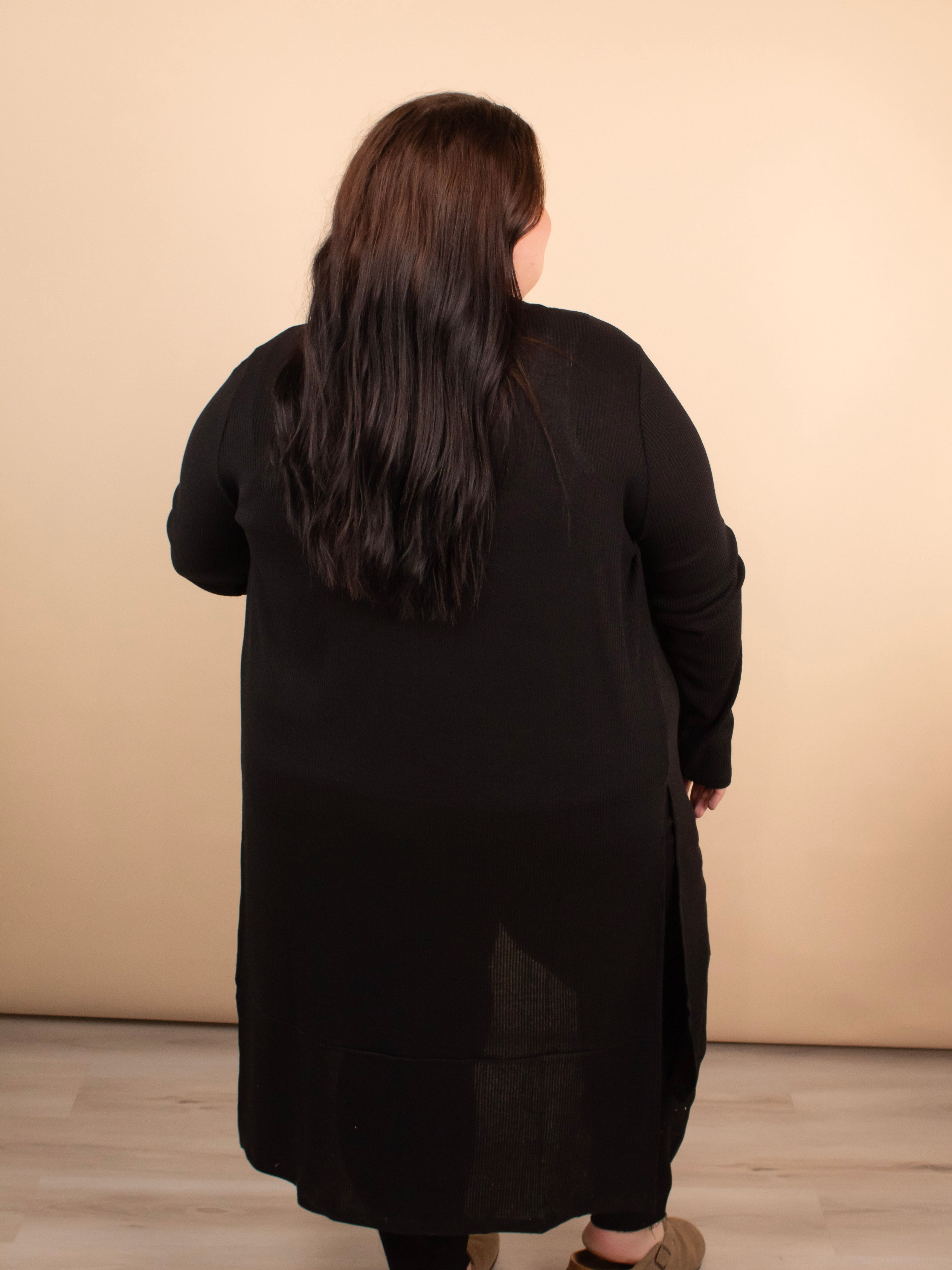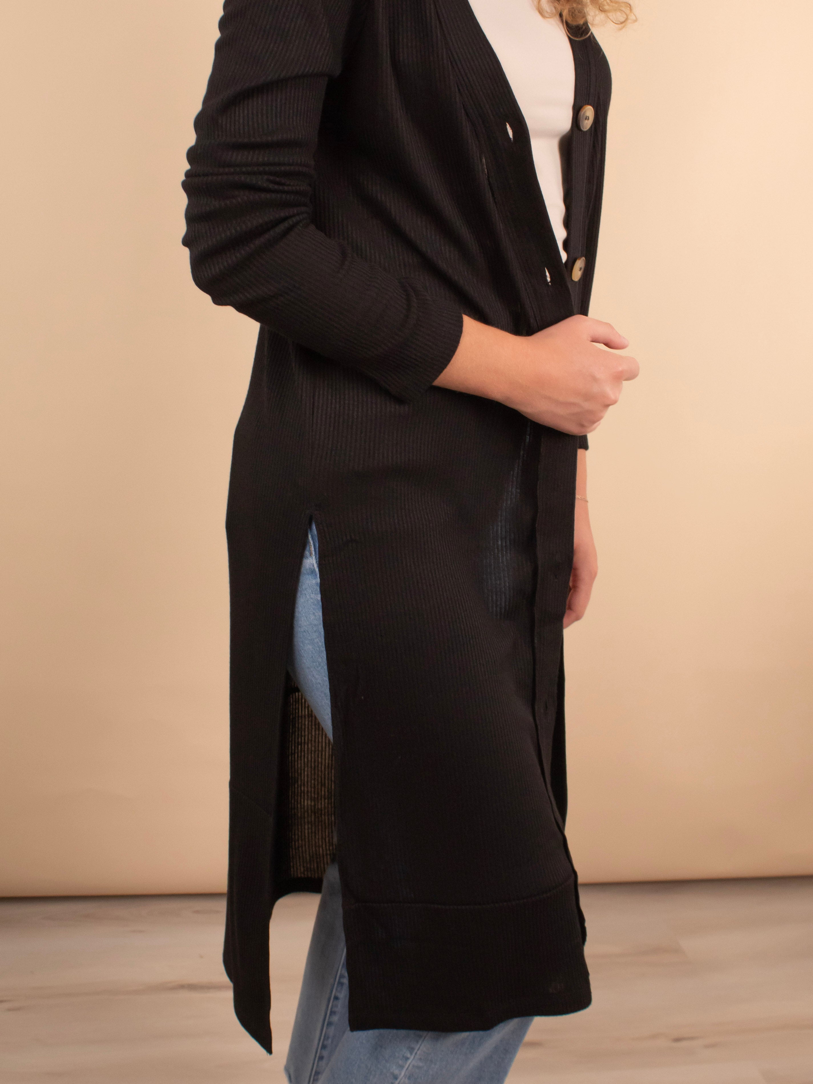 The Autumn Breeze Ribbed Long Cardigan in Black is the perfect layering piece for any season. With its soft ribbed fabric, lightweight feel, and long duster length, this cardigan brings effortless elegance to your everyday looks. Side slits add both movement and a chic detail, making it easy to style over everything from jeans to dresses.