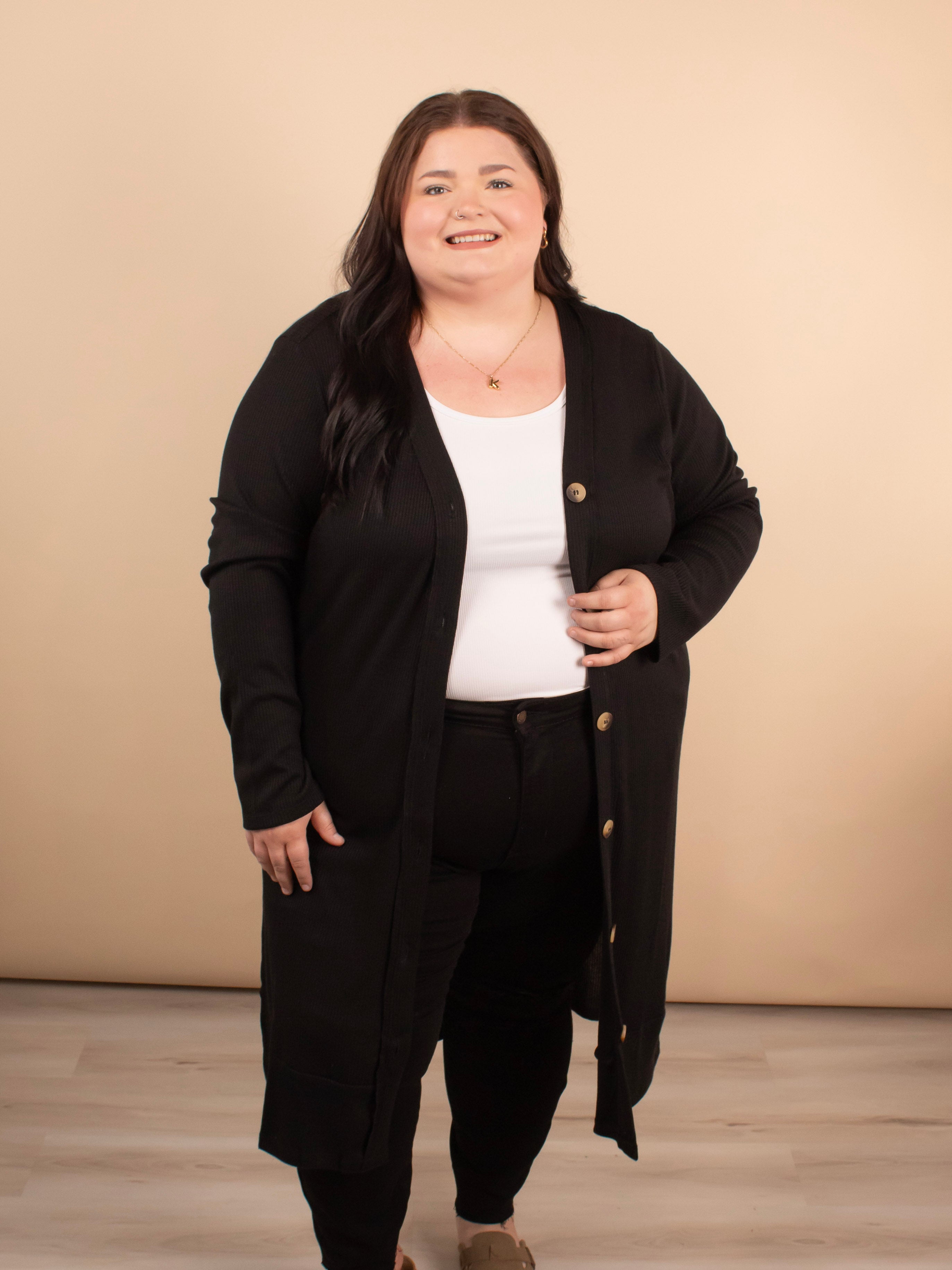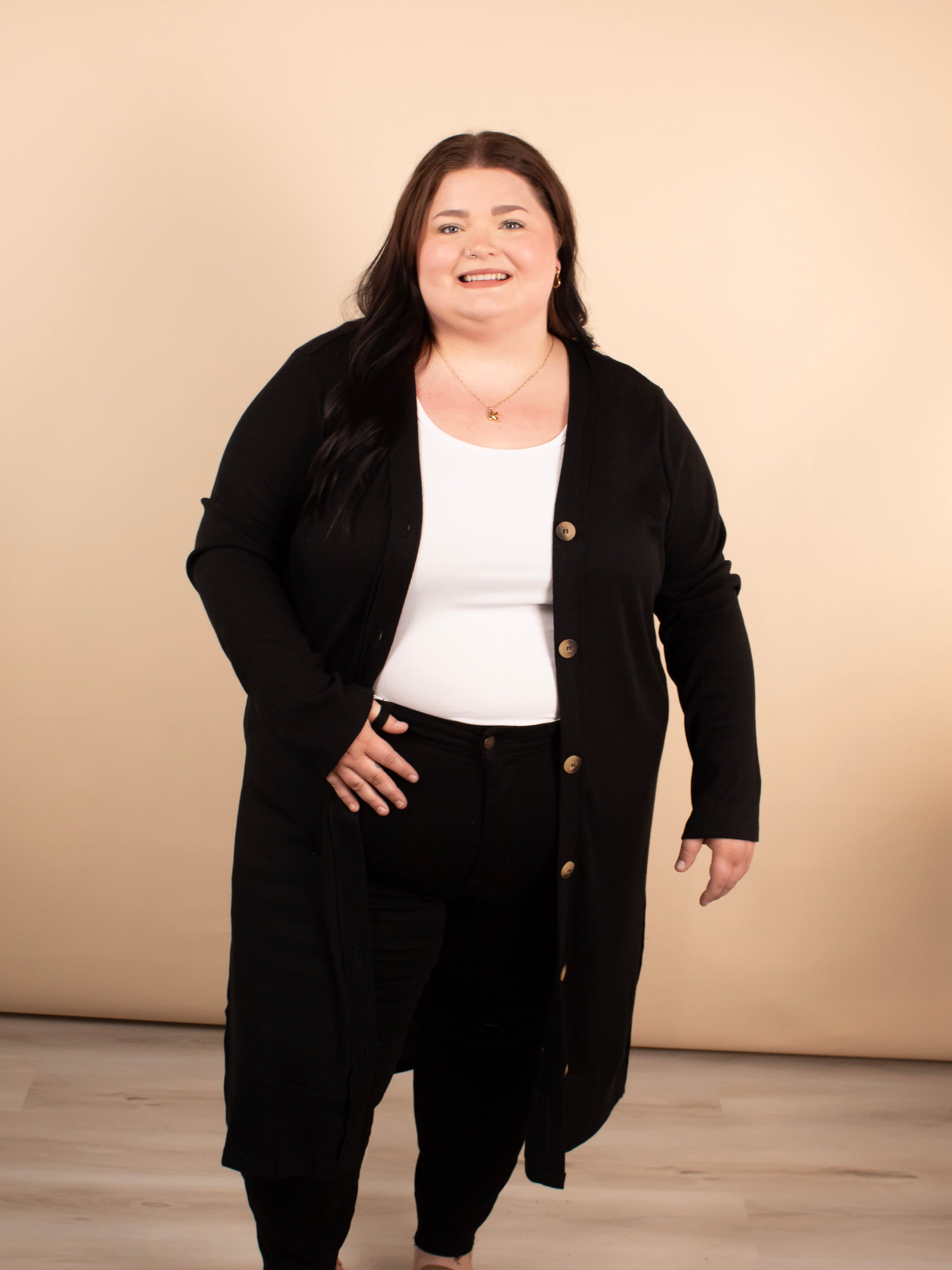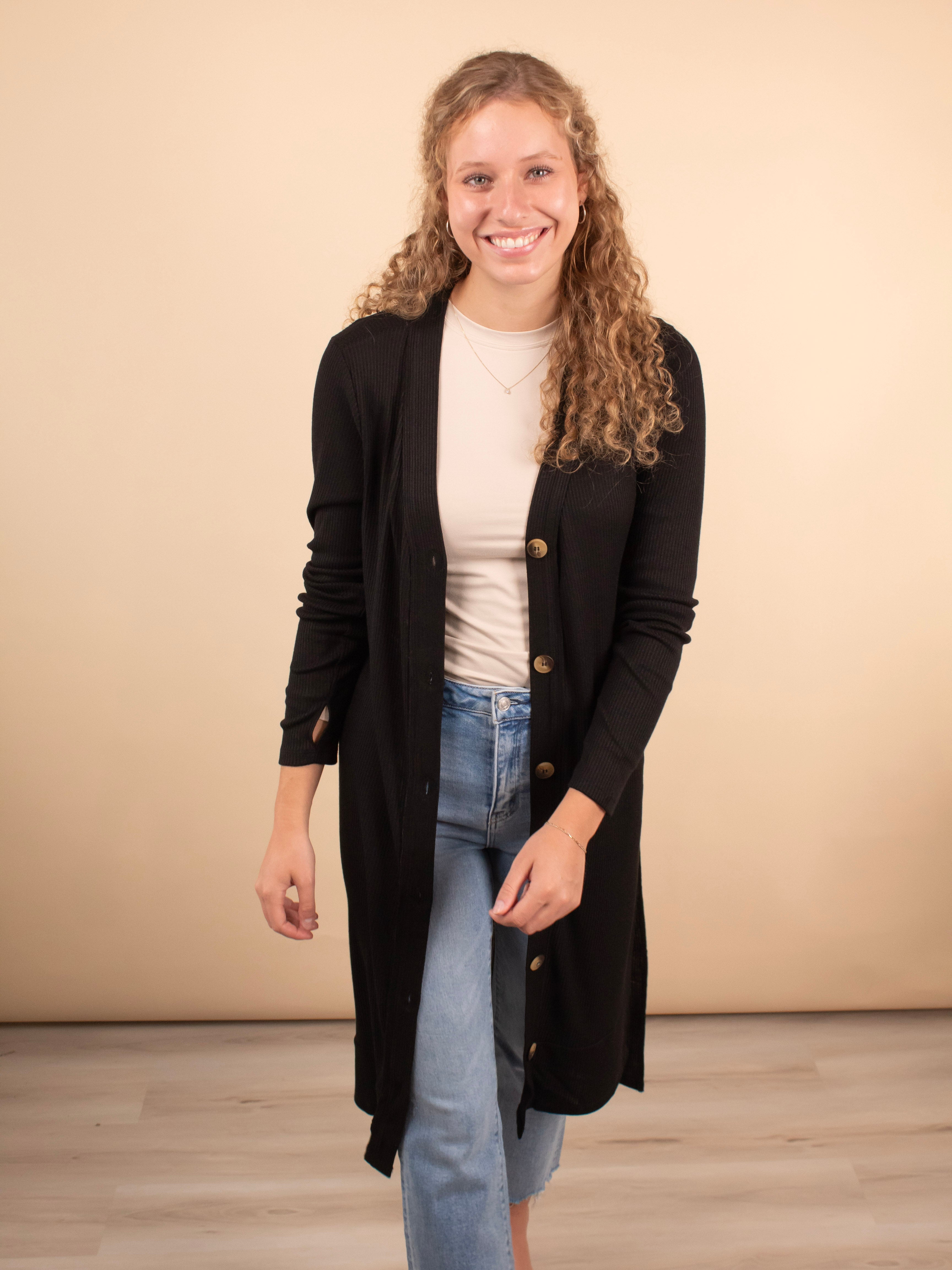 The Autumn Breeze Ribbed Long Cardigan in Black is the perfect layering piece for any season. With its soft ribbed fabric, lightweight feel, and long duster length, this cardigan brings effortless elegance to your everyday looks. Side slits add both movement and a chic detail, making it easy to style over everything from jeans to dresses.