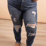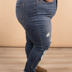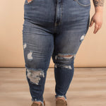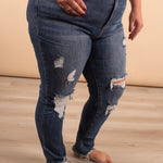 Introducing the Blakeley Dark Wash Distressed Skinny Jeans. With their dark wash and distressed look, these jeans elevate any outfit with a cool edge. The skinny jean style offers a slimming silhouette, while the mid rise and stretchy fabric provide comfort and flexibility. Upgrade your wardrobe with these must-have jeans.