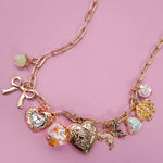 A little nostalgic, a little whimsical, and full of charm. The Keepsake Garden Charm Necklace features a sweet heart locket surrounded by delicate details — porcelain flowers, a butterfly, a bow, and a sparkling rhinestone heart. With its vintage-inspired feel and thoughtful design, this piece feels like a treasured keepsake you’ll reach for again and again.