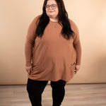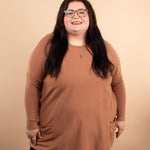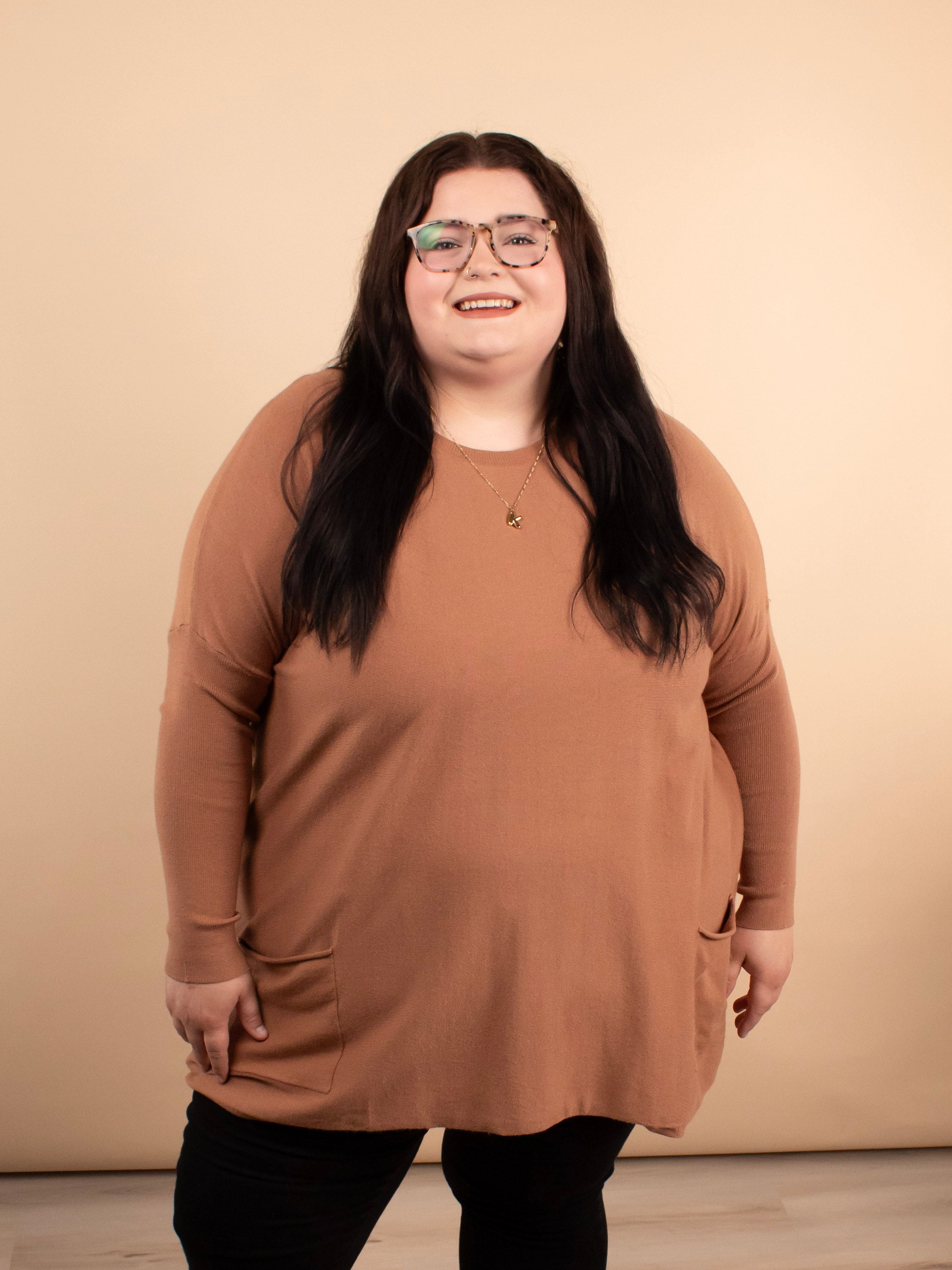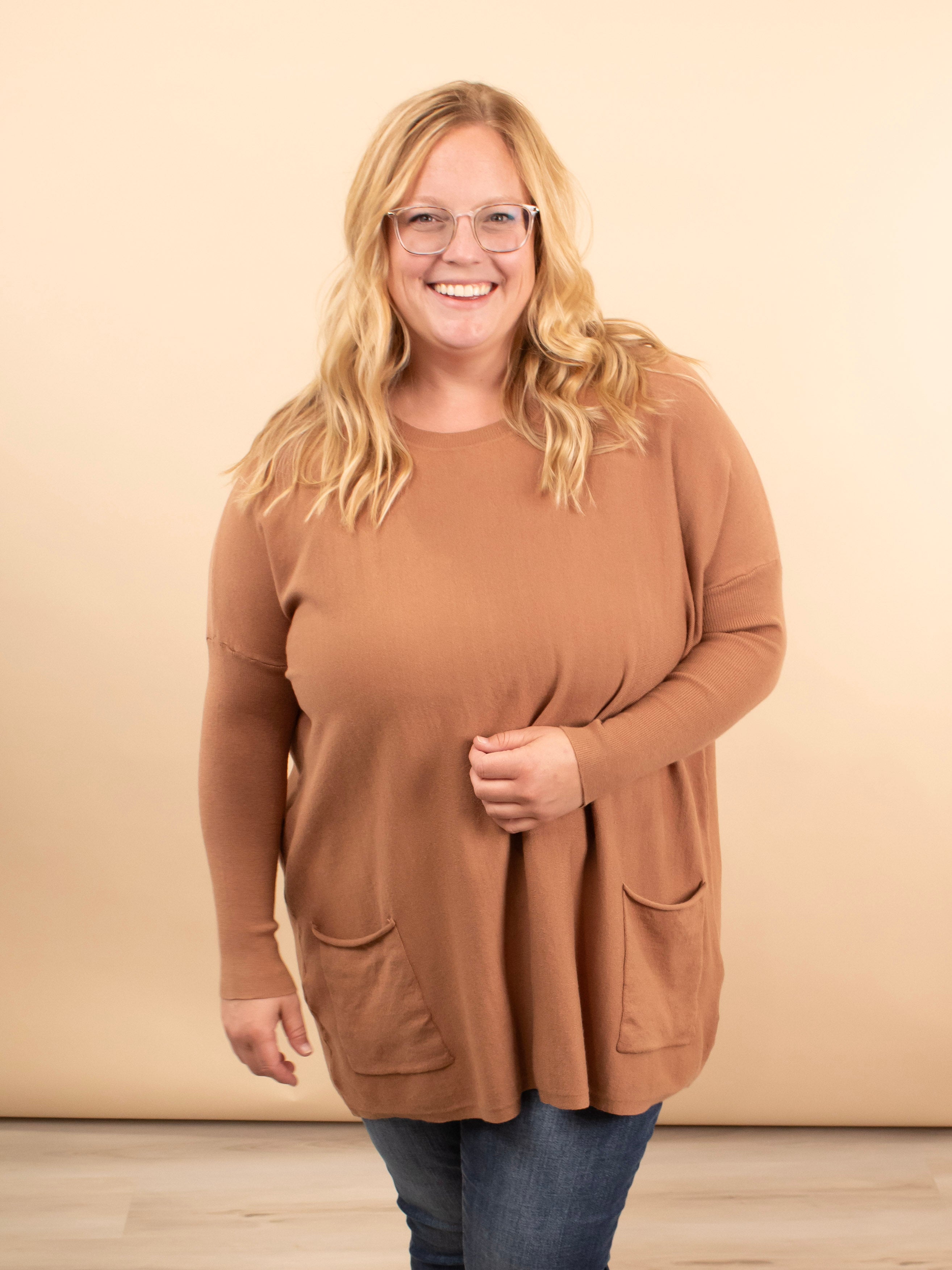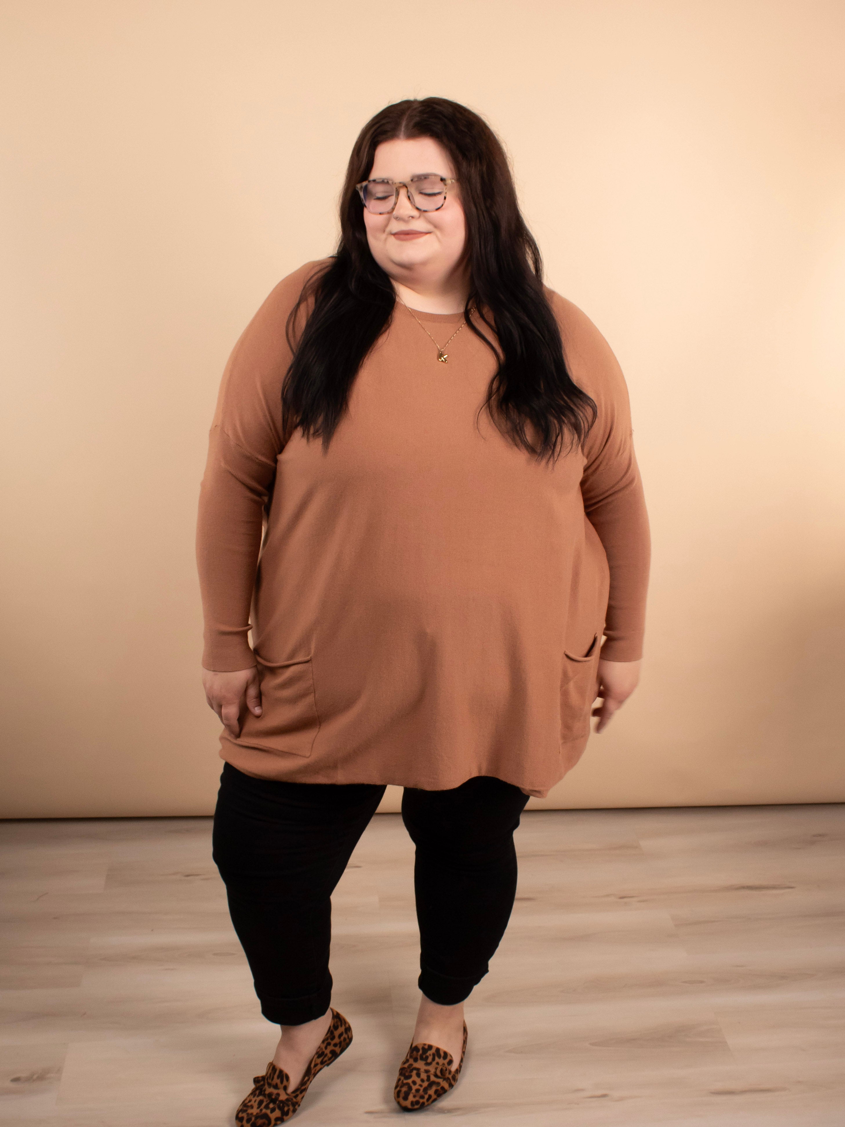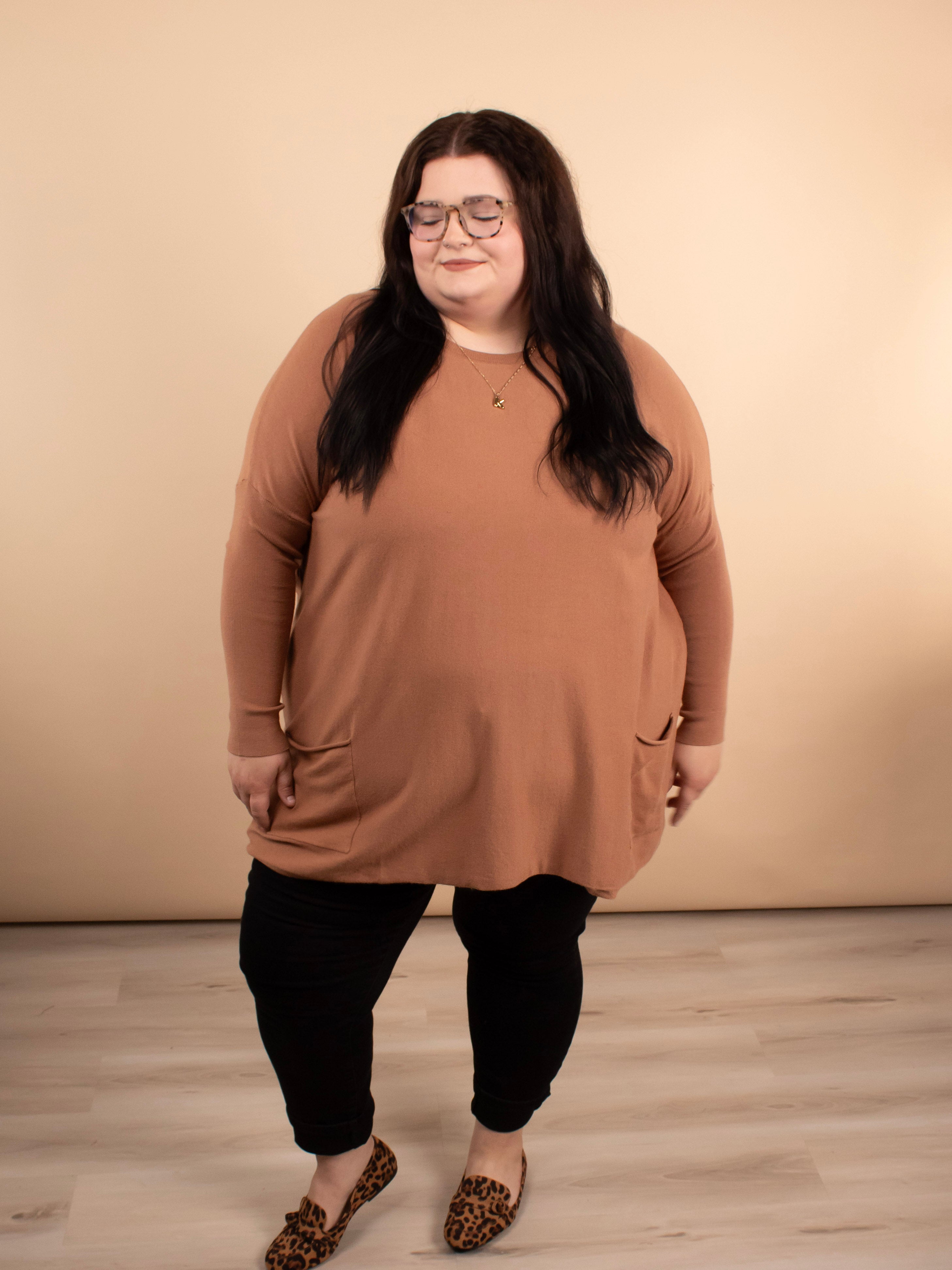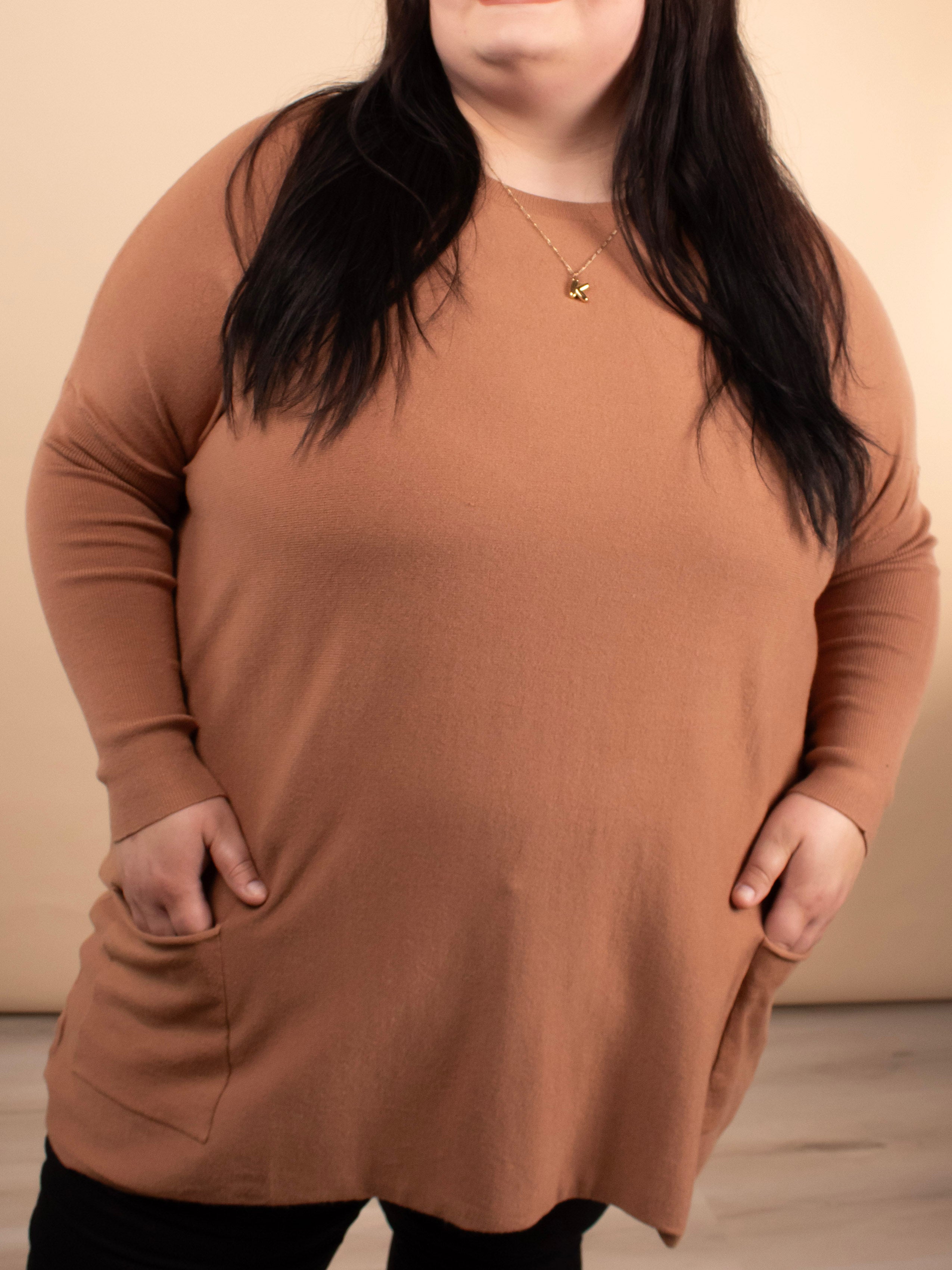 Meet your leggings’ new best friend. The Comfy Coverage Pocket Sweater in Latte is the perfect blend of cozy comfort and effortless style. With its oversized torso, fitted sleeves, full coverage length, and adorable front pockets, this sweater is a must-have for pairing with skinnies, leggings, or layered looks all season long.