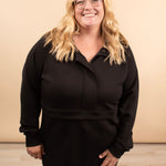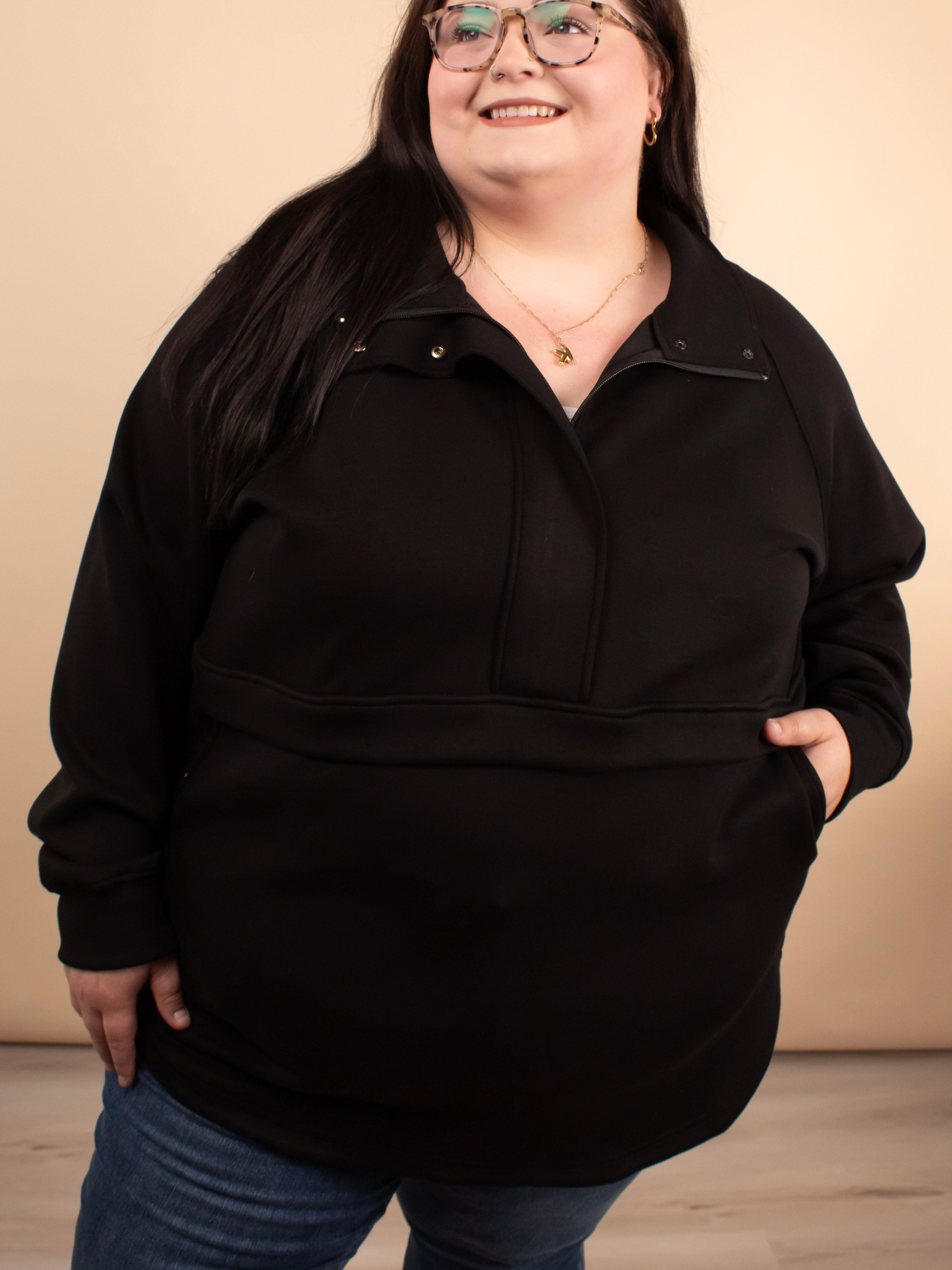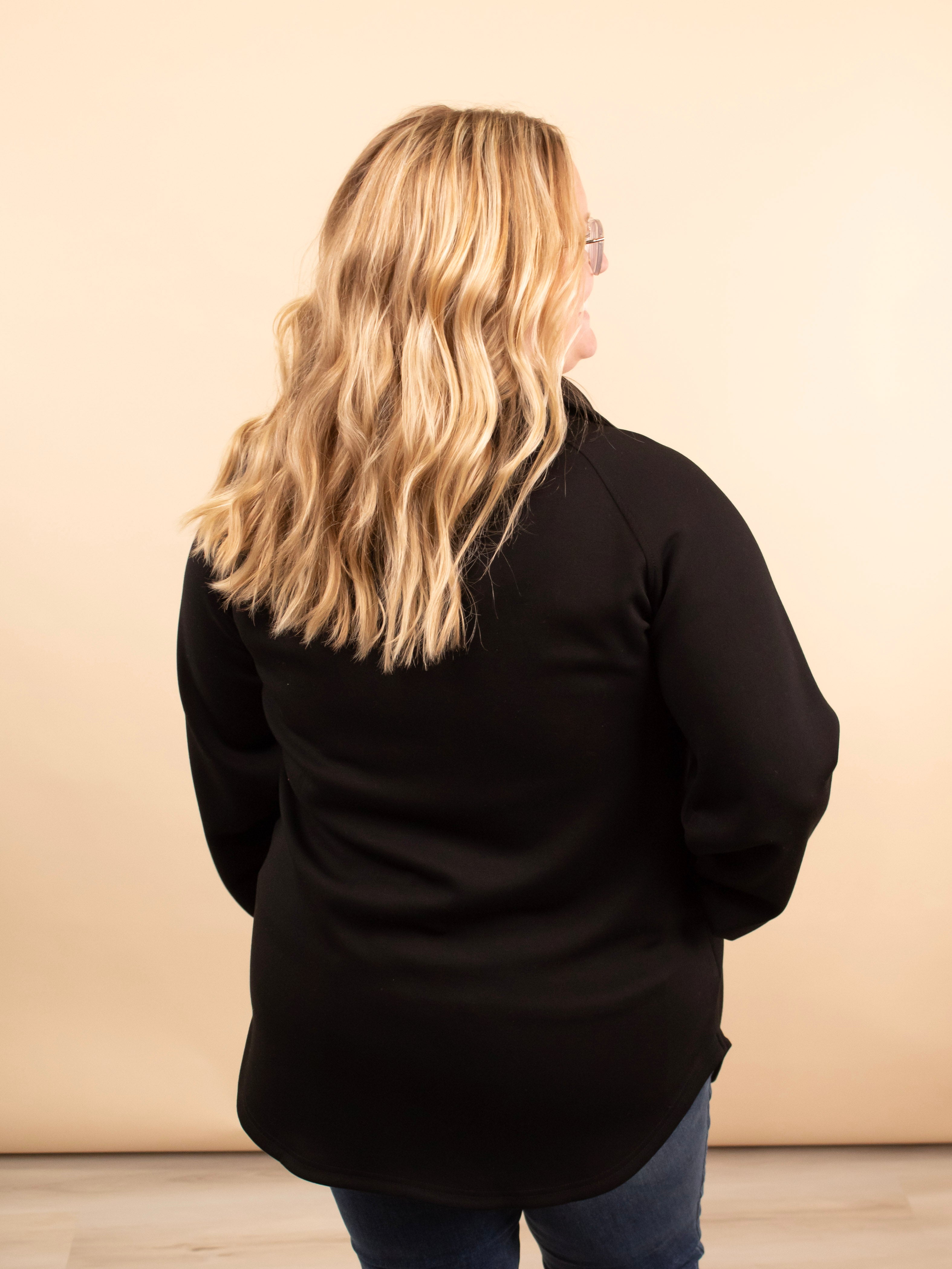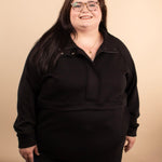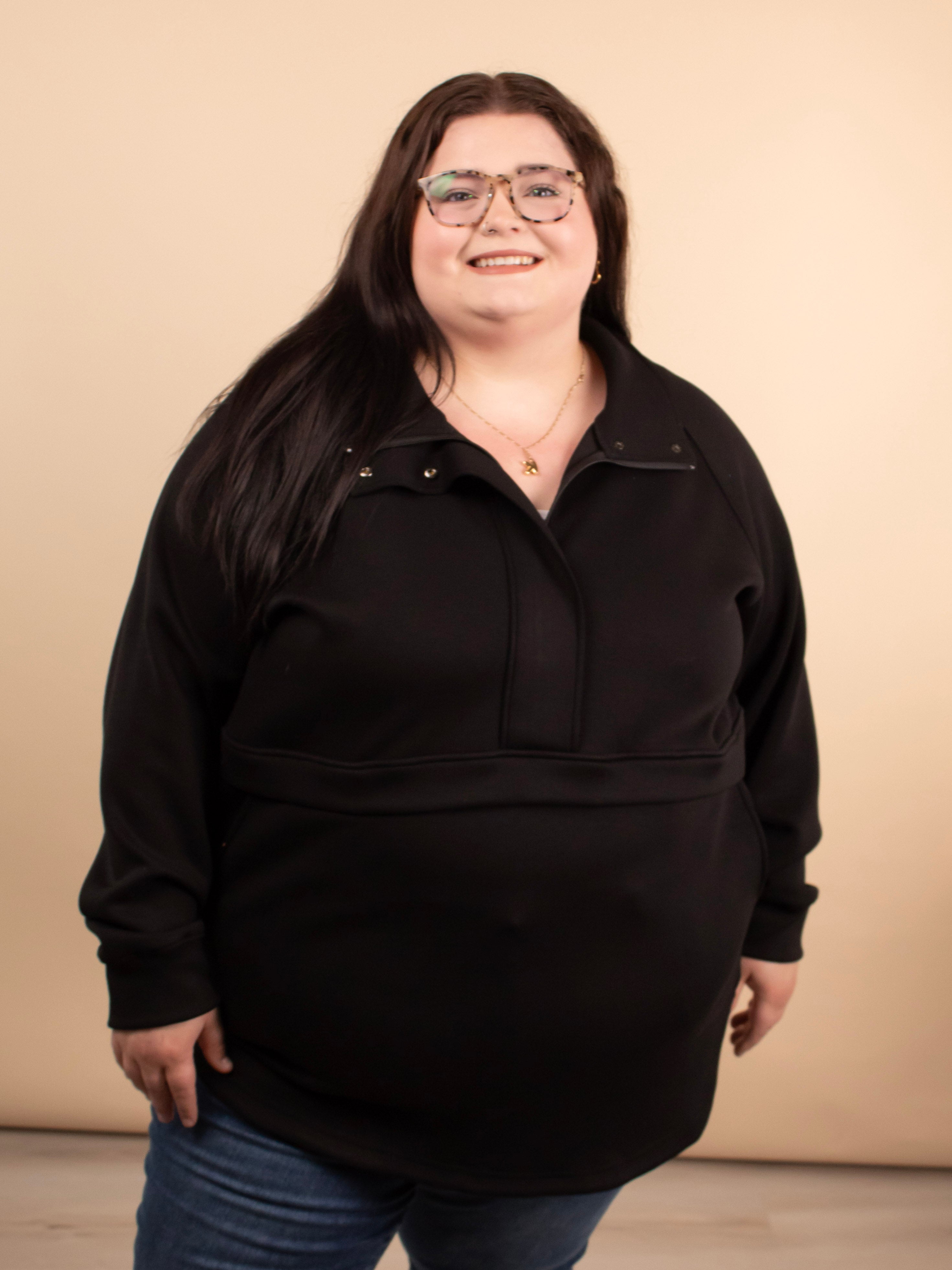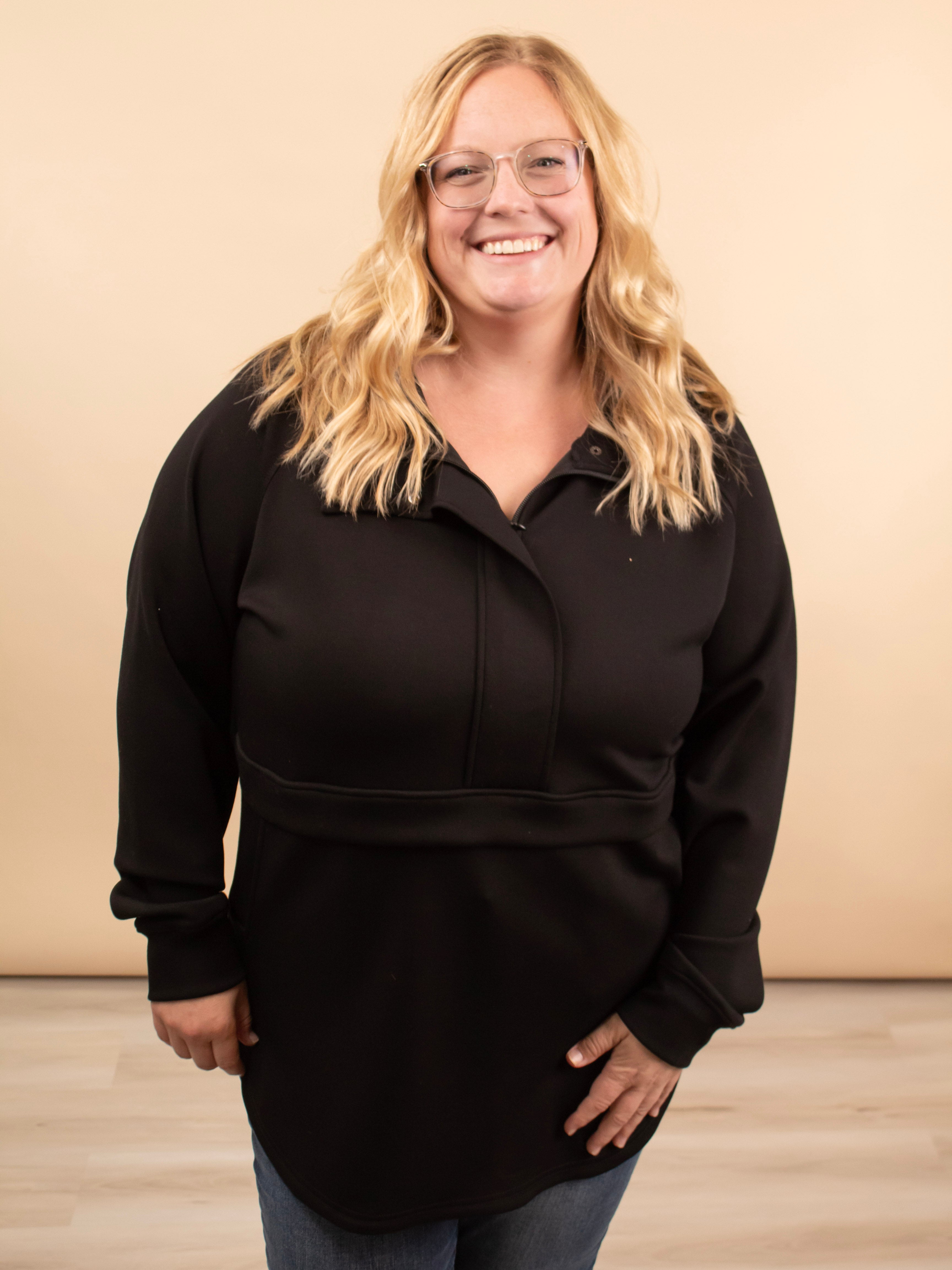 Meet your new cold-weather favorite, the Crisp Air Scuba Halfzip now in Black. This pillowy-soft pullover feels like a warm hug yet looks elevated enough to wear beyond the couch. Featuring a sleek half zip with functional buttons on the collar, it’s designed to shield you from brisk winds when you need it. The front kangaroo pocket keeps your hands cozy, while the dusty blue shade brings year-round versatility. With a longer length for front and rear coverage, it’s the perfect blend of comfort and style.