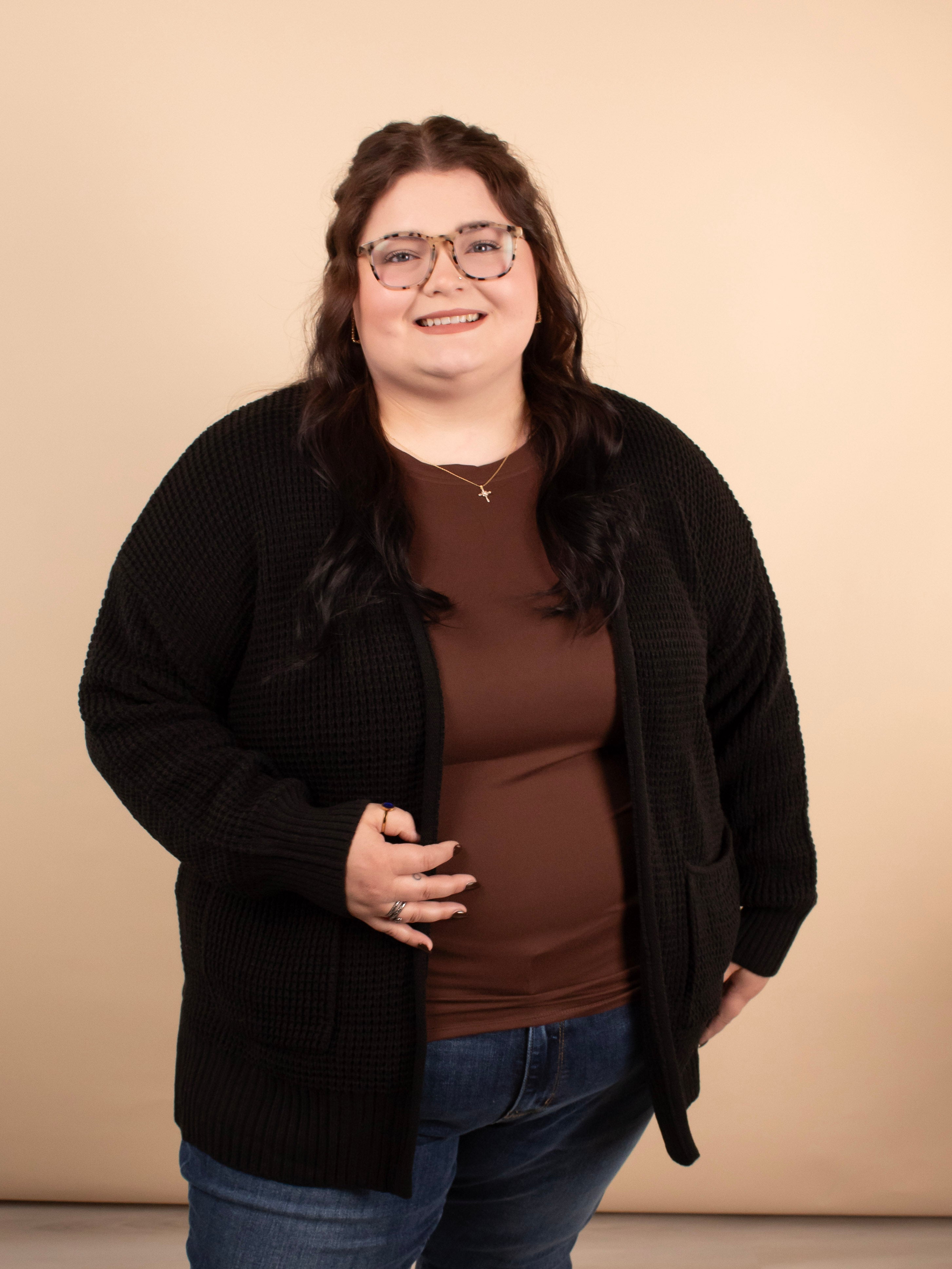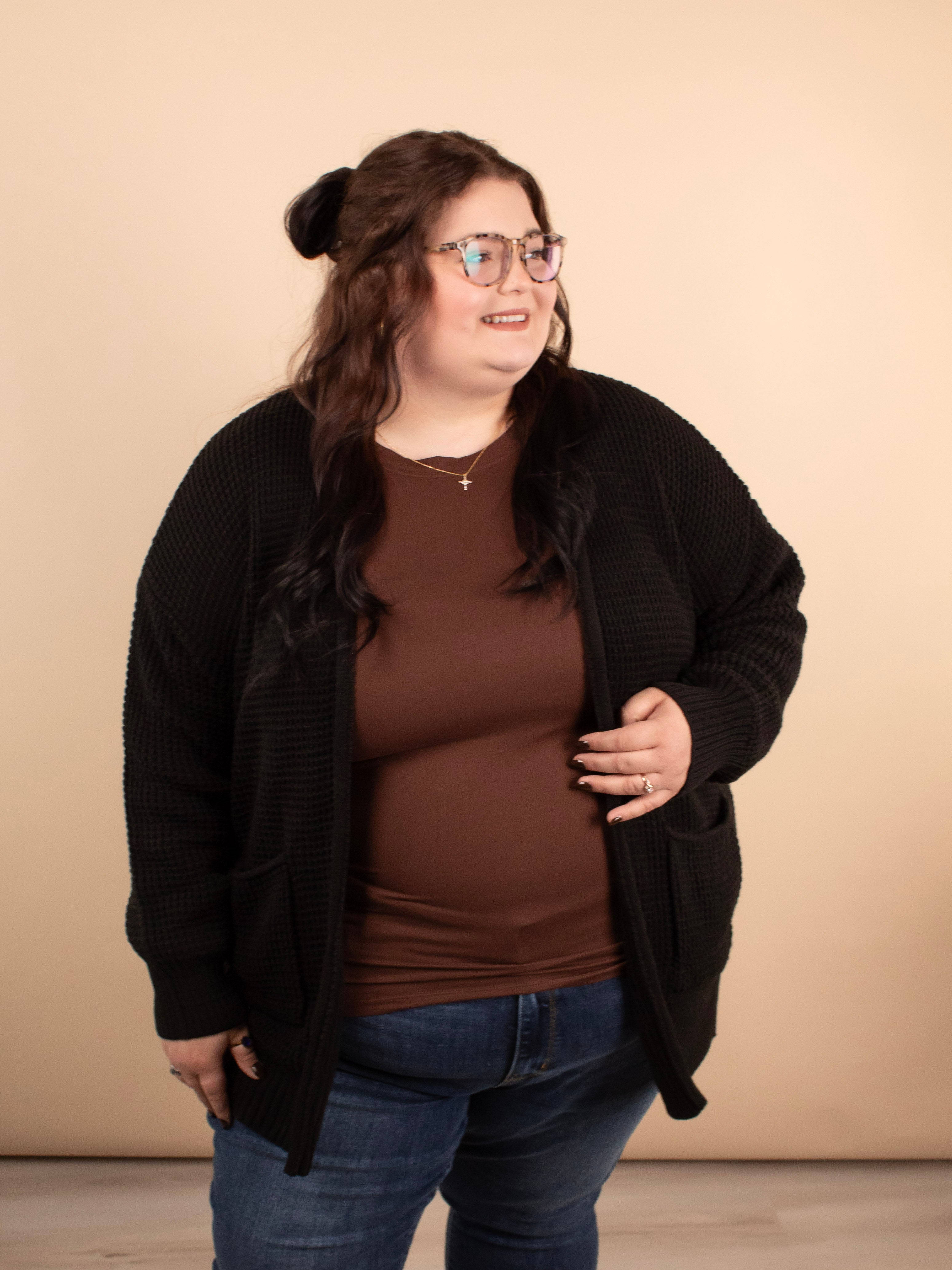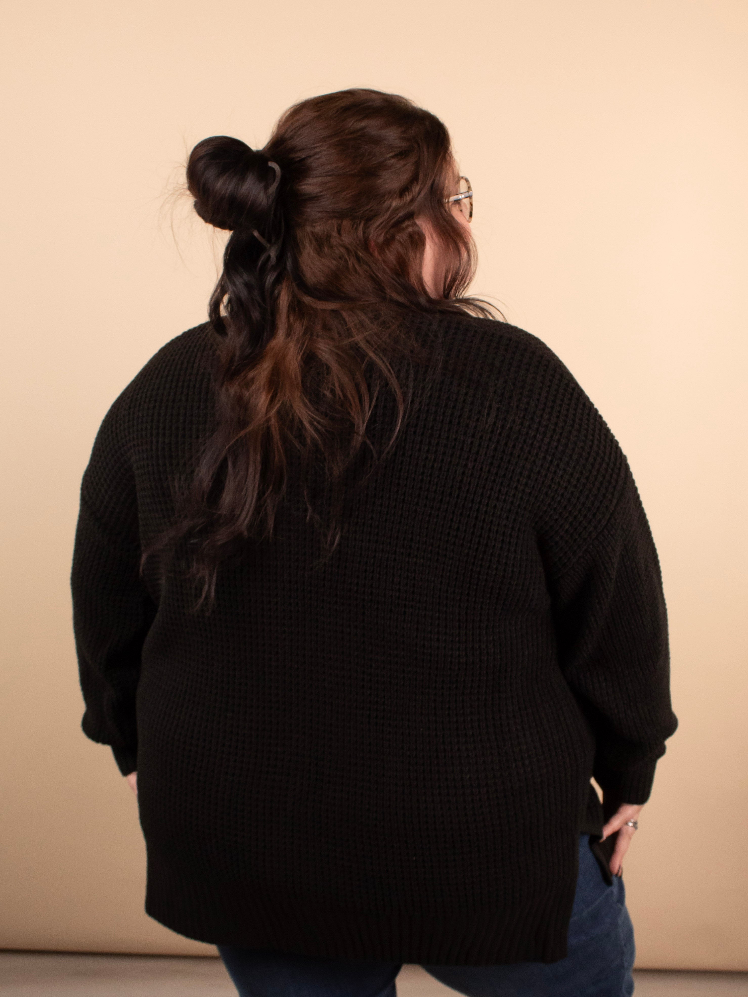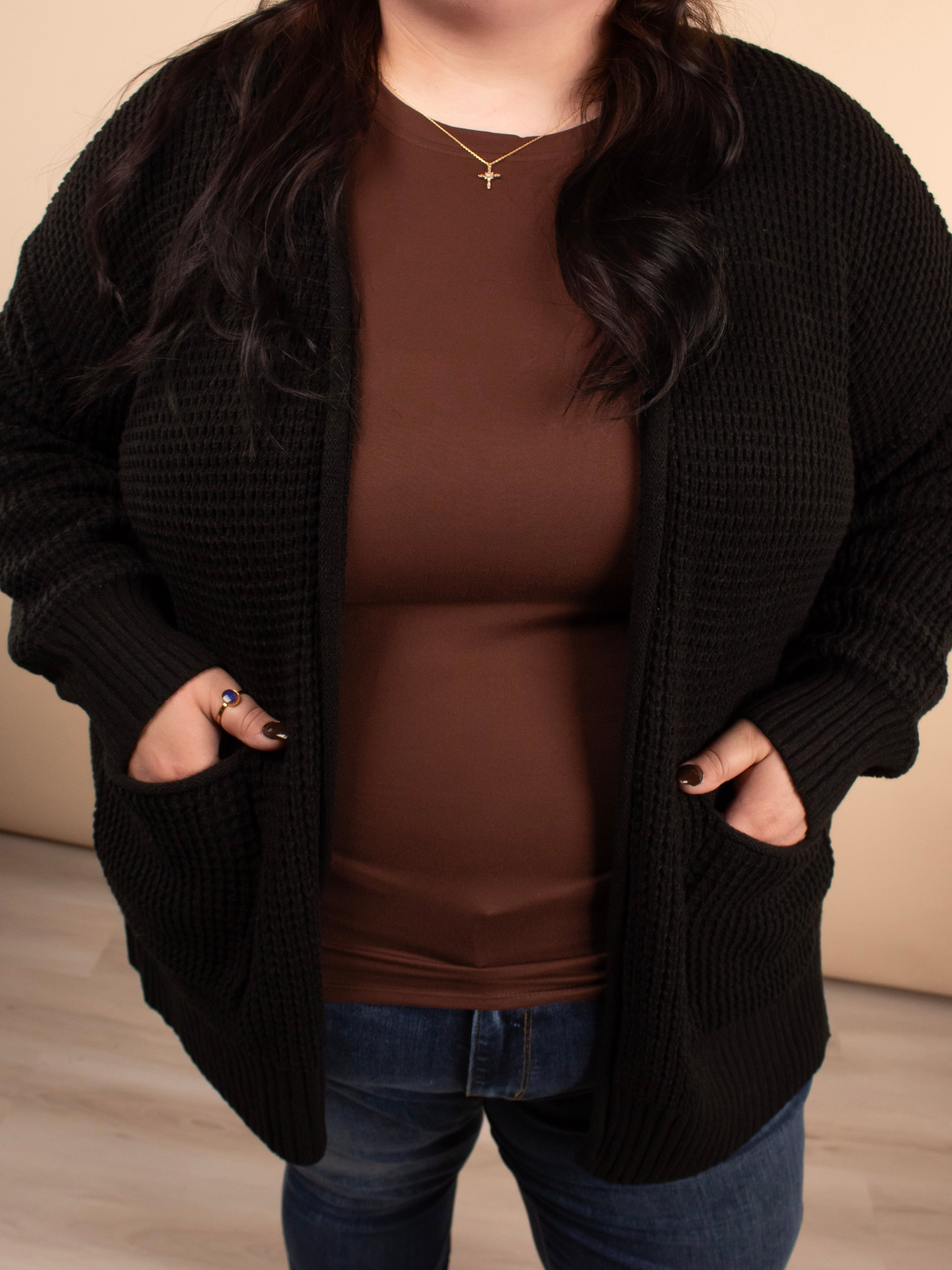 Cozy, chic, and chilly weather-perfect. The Crisp Morning Cardigan in Black is a classic staple with its chunky knit texture, longer length, and classic black coloring. Designed for layering and comfort, it’s the cardigan you’ll reach for again and again.