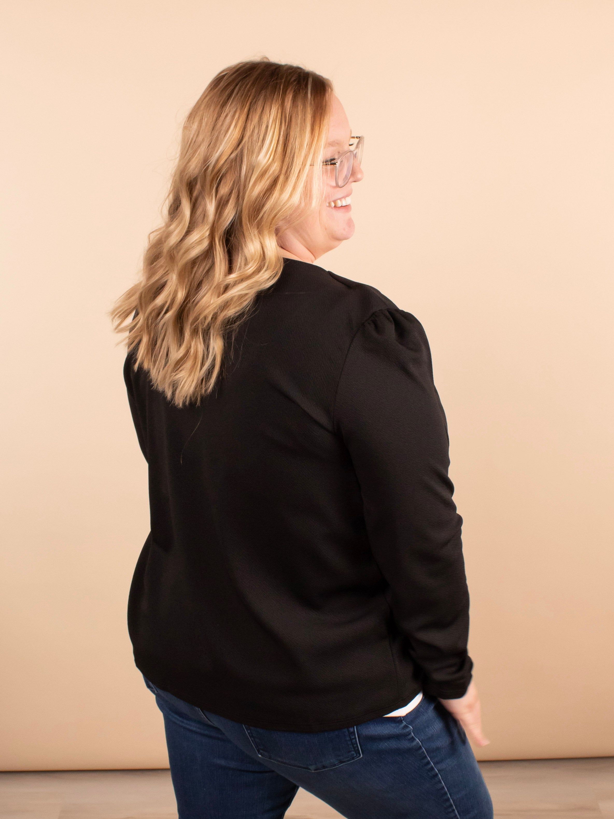 The Desiree Black Relaxed Blazer is the perfect addition to any wardrobe. Made with soft and stretchy fabric, it can easily be thrown over spaghetti strap dresses or tanks. With its relaxed blazer style, it can be dressed up for a more formal look, or worn casually. The ruched shoulder detail adds a touch of elegance to any outfit. Upgrade your style with this versatile blazer.