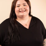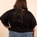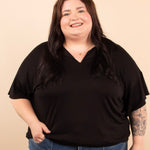 Elevate your everyday wardrobe with the Easy Elegance V-Neck Top in Black. Featuring charming flow sleeve detailing and crafted from a stretchy, comfortable fabric, this top combines style and ease effortlessly. Available exclusively in extended sizing from 3XL to 5XL, designed to celebrate and flatter curvy figures with style and ease.
