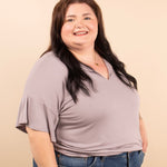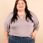 Elevate your everyday wardrobe with the Easy Elegance V-Neck Top in Grey. Featuring charming flow sleeve detailing and crafted from a stretchy, comfortable fabric, this top combines style and ease effortlessly. Available exclusively in extended sizing from 3XL to 5XL, designed to celebrate and flatter curvy figures with style and ease.