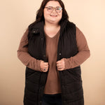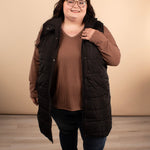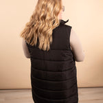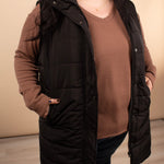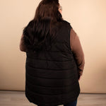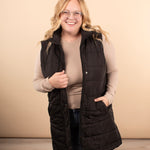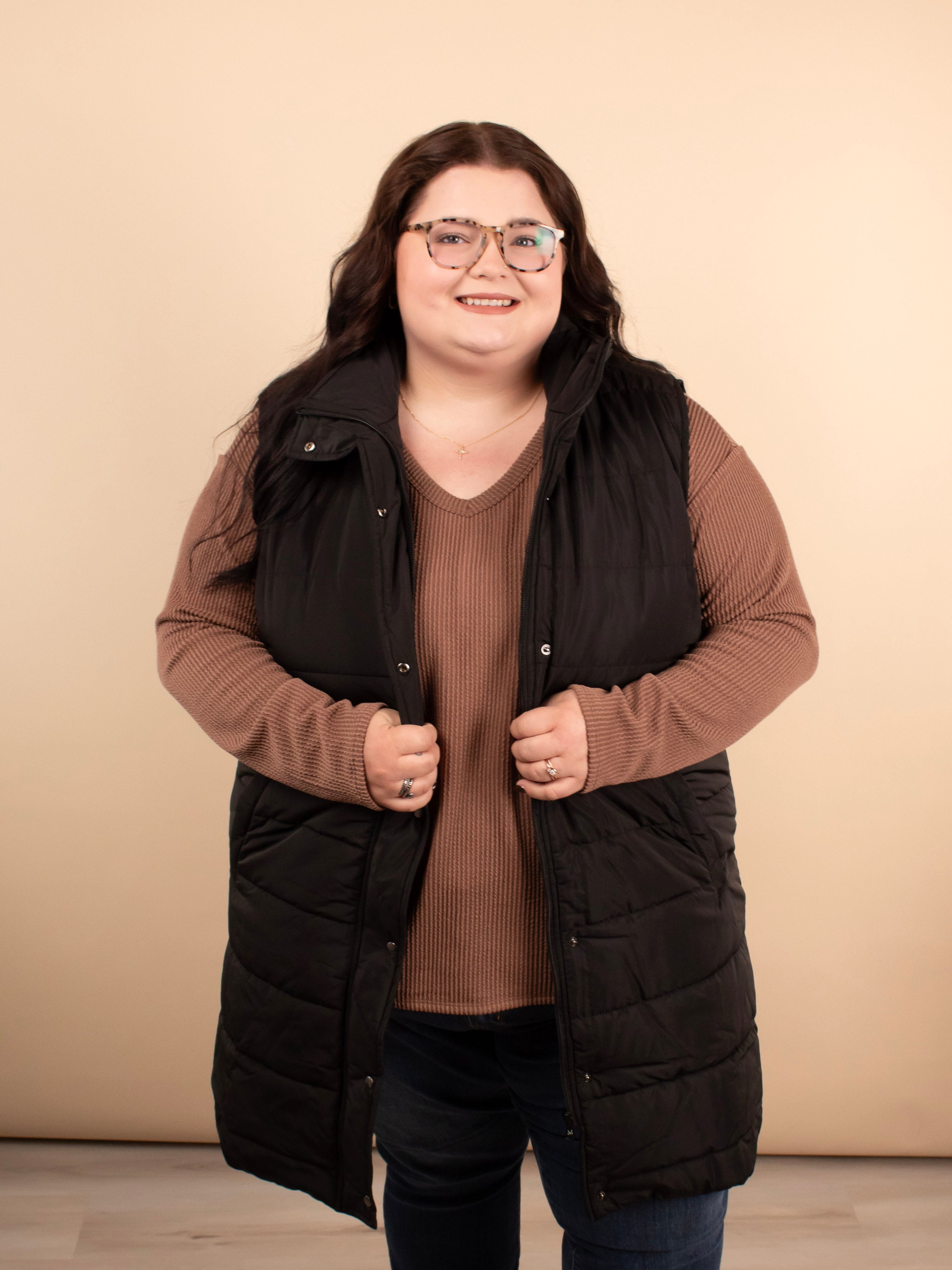 The Emery Longline Vest in Black is the ultimate layering essential for the season. Featuring a sleek black color and a flattering longline silhouette that falls to the knees, this puffer-style vest adds instant polish without the bulk. Designed with functional pockets, a zipper, and snap-button closure, it’s the perfect piece to elevate any outfit with cozy, chic style.