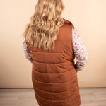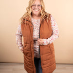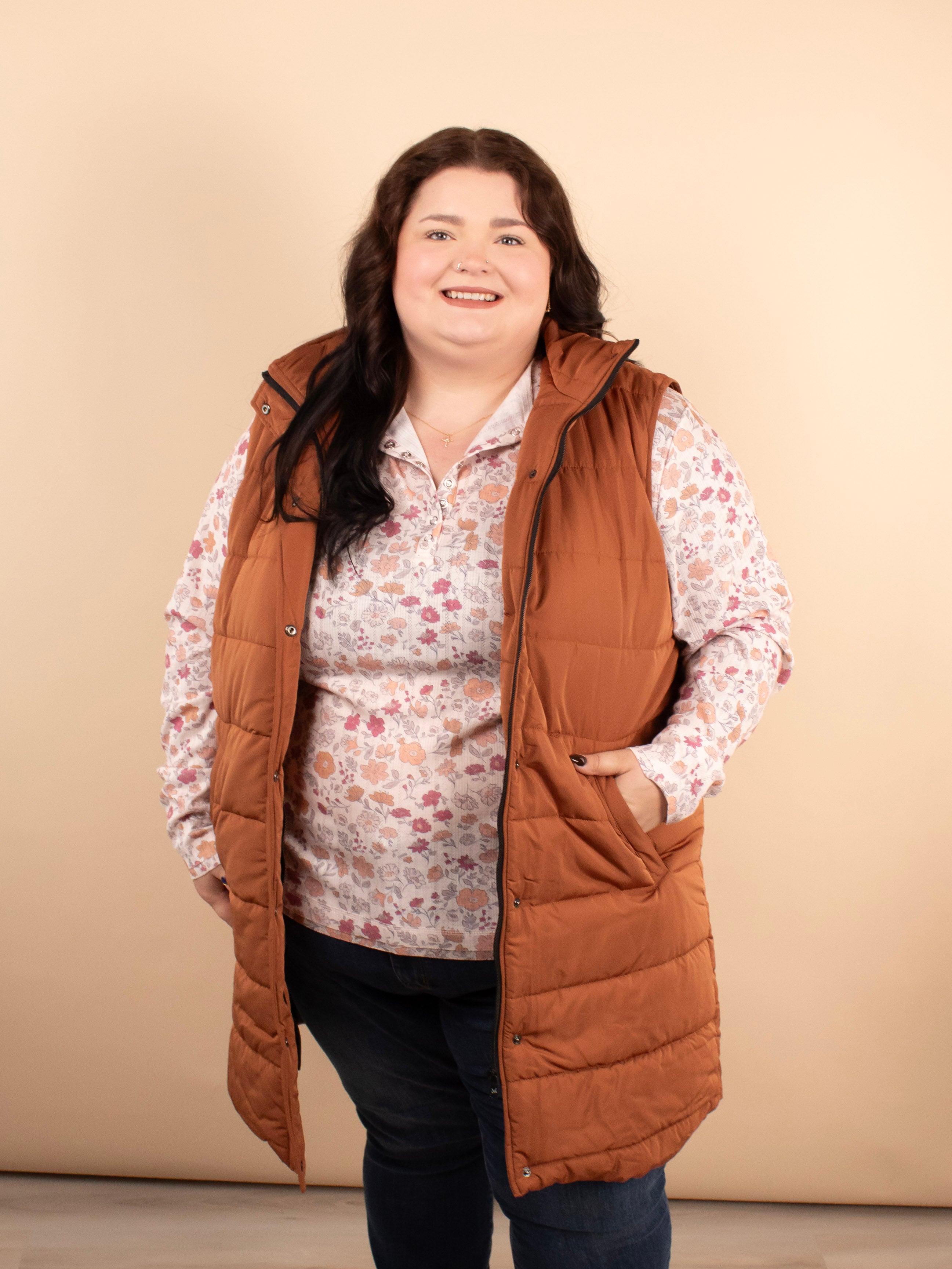 The Emery Longline Vest in Cinnamon is the ultimate layering essential for the season. Featuring a beautiful toasted camel-brown color and a flattering longline silhouette that falls to the knees, this puffer-style vest adds instant polish without the bulk. Designed with functional pockets, a zipper, and snap-button closure, it’s the perfect piece to elevate any outfit with cozy, chic style.