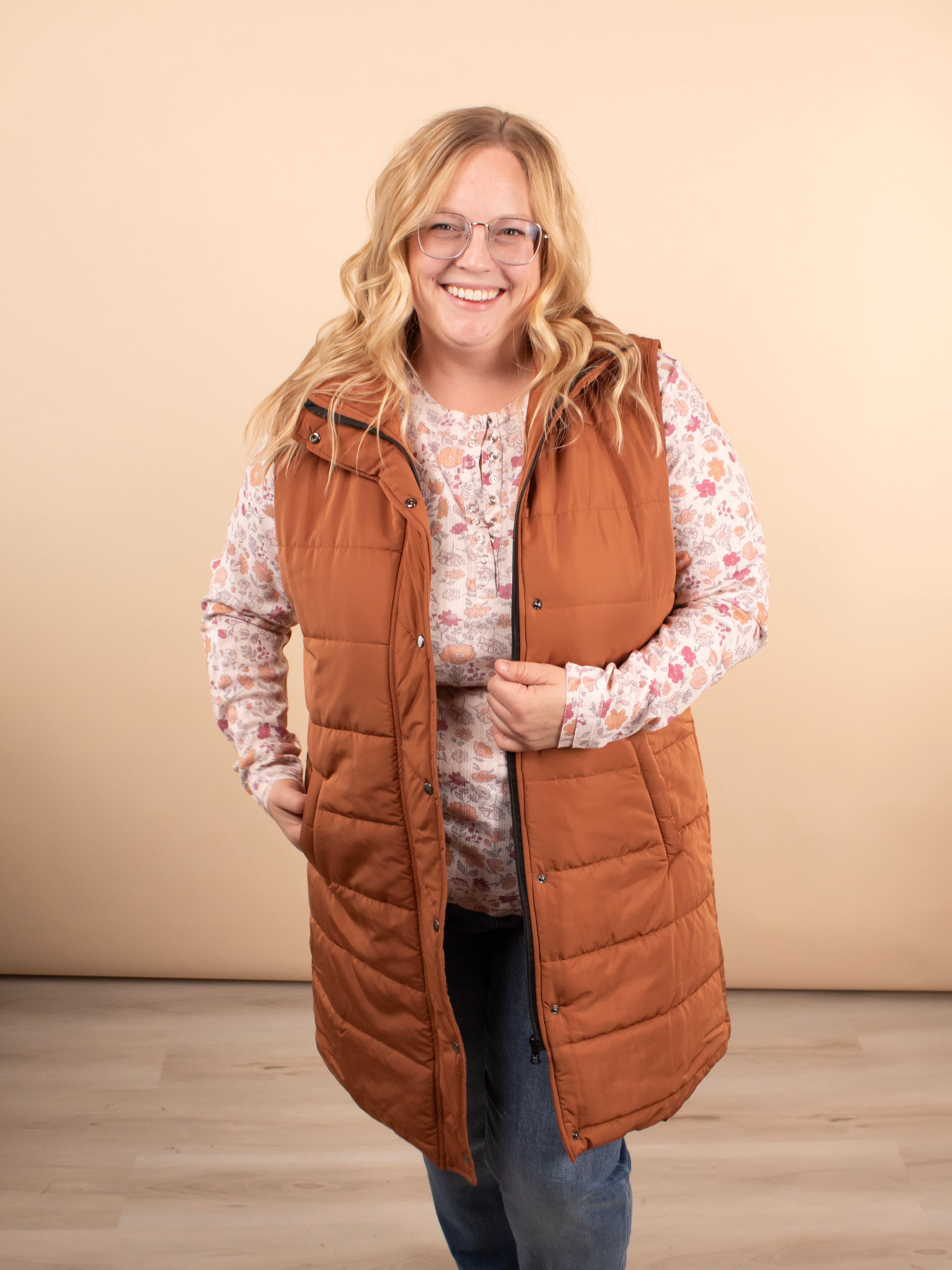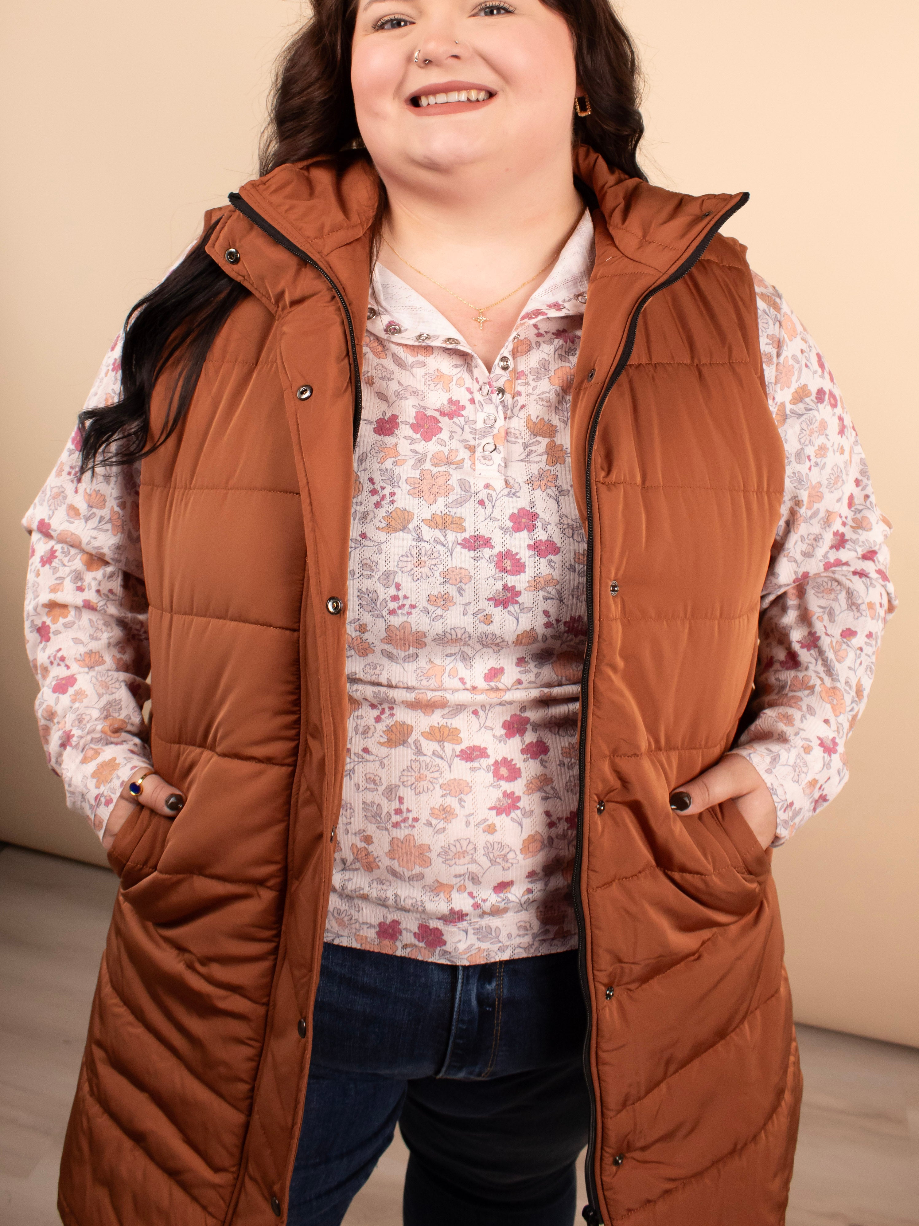 The Emery Longline Vest in Cinnamon is the ultimate layering essential for the season. Featuring a beautiful toasted camel-brown color and a flattering longline silhouette that falls to the knees, this puffer-style vest adds instant polish without the bulk. Designed with functional pockets, a zipper, and snap-button closure, it’s the perfect piece to elevate any outfit with cozy, chic style.