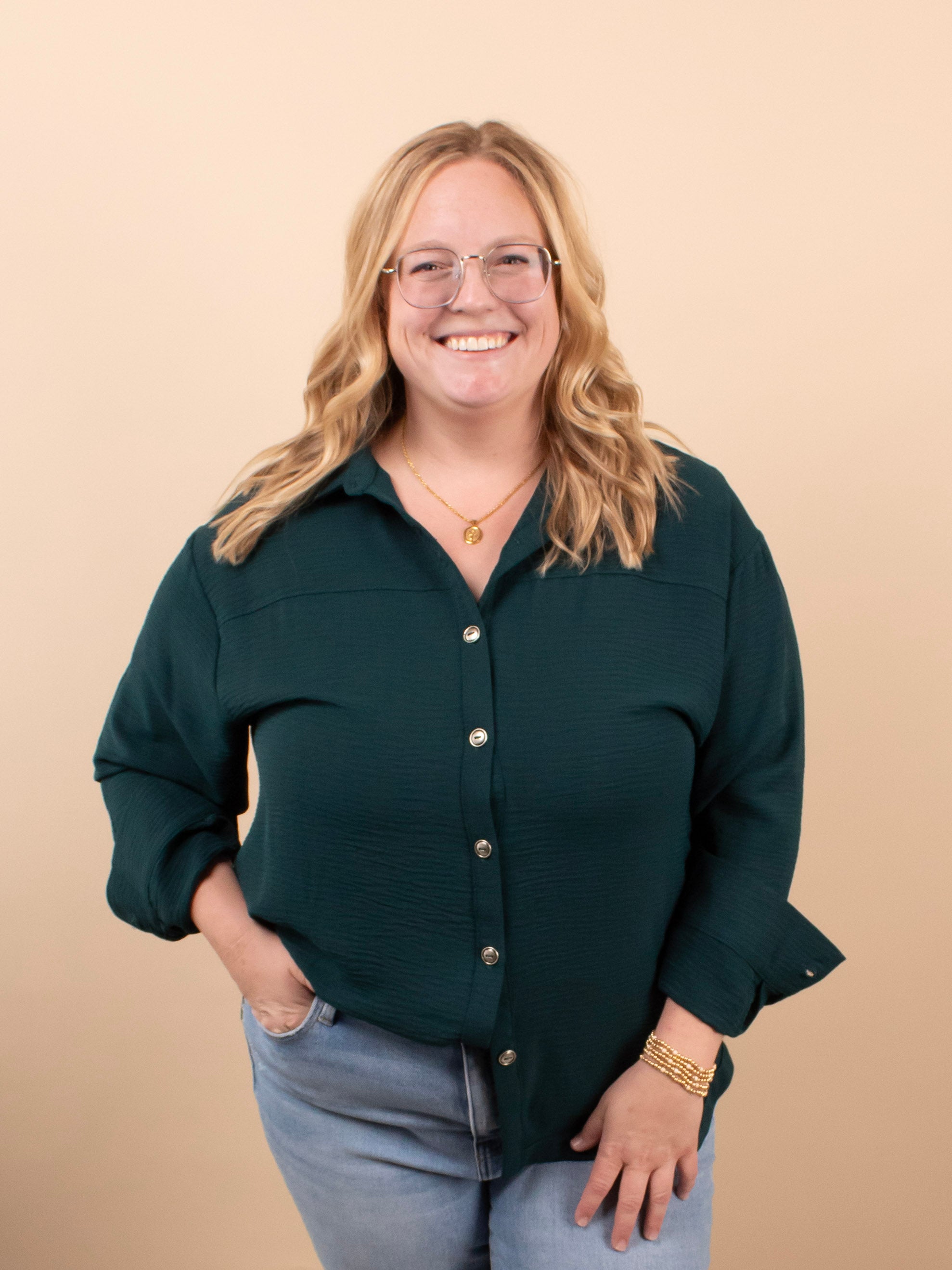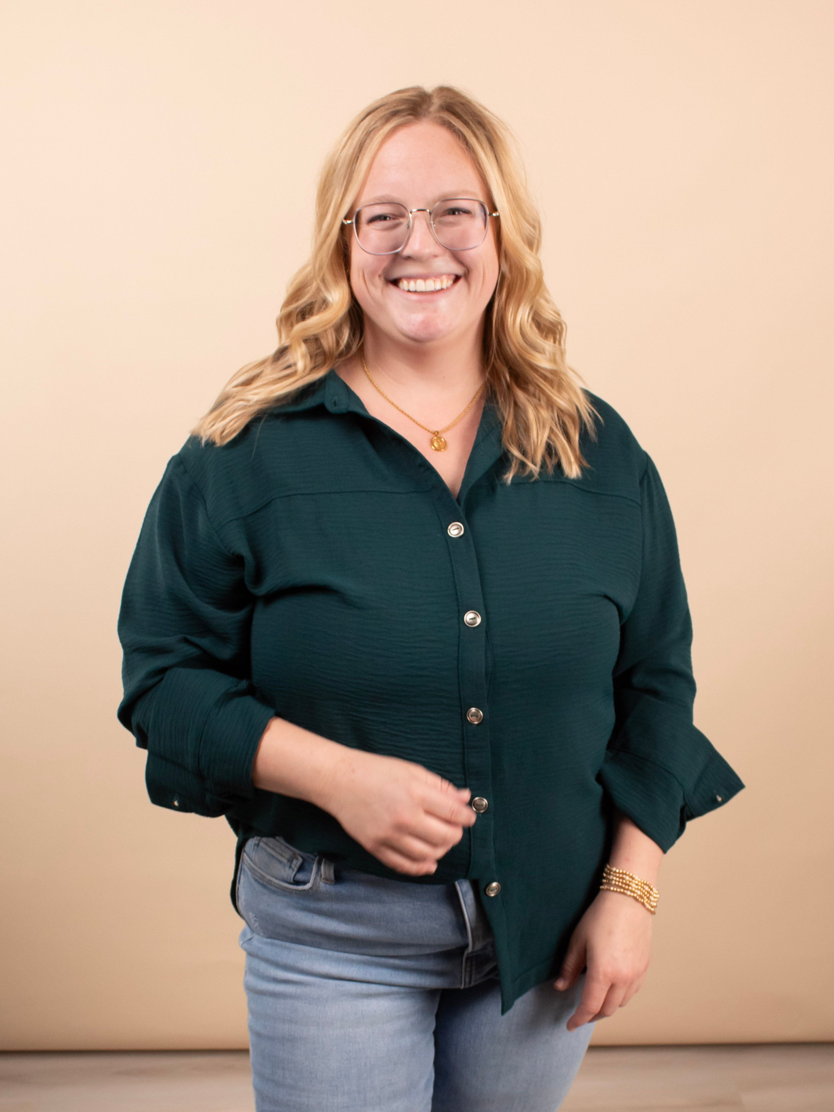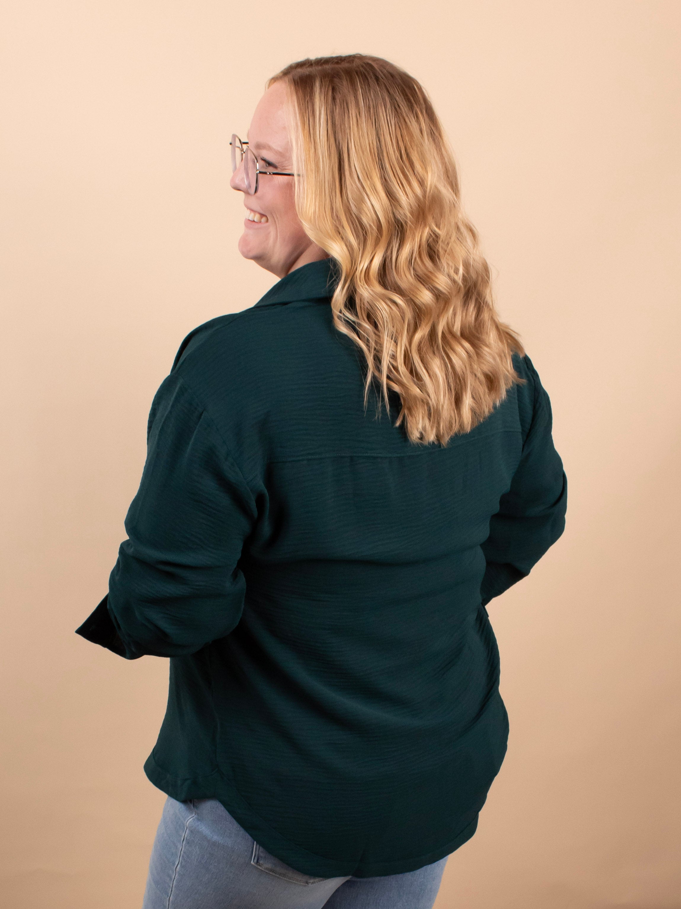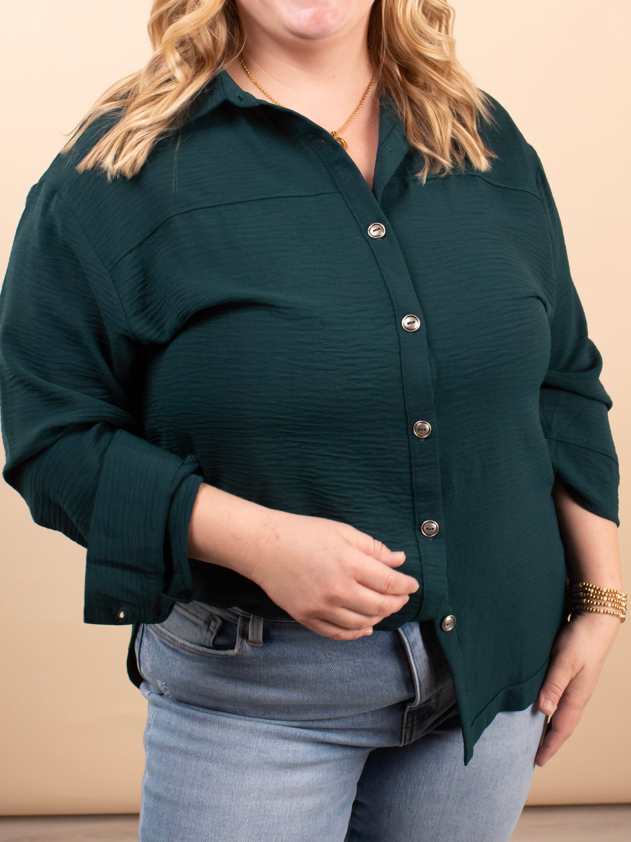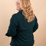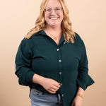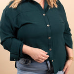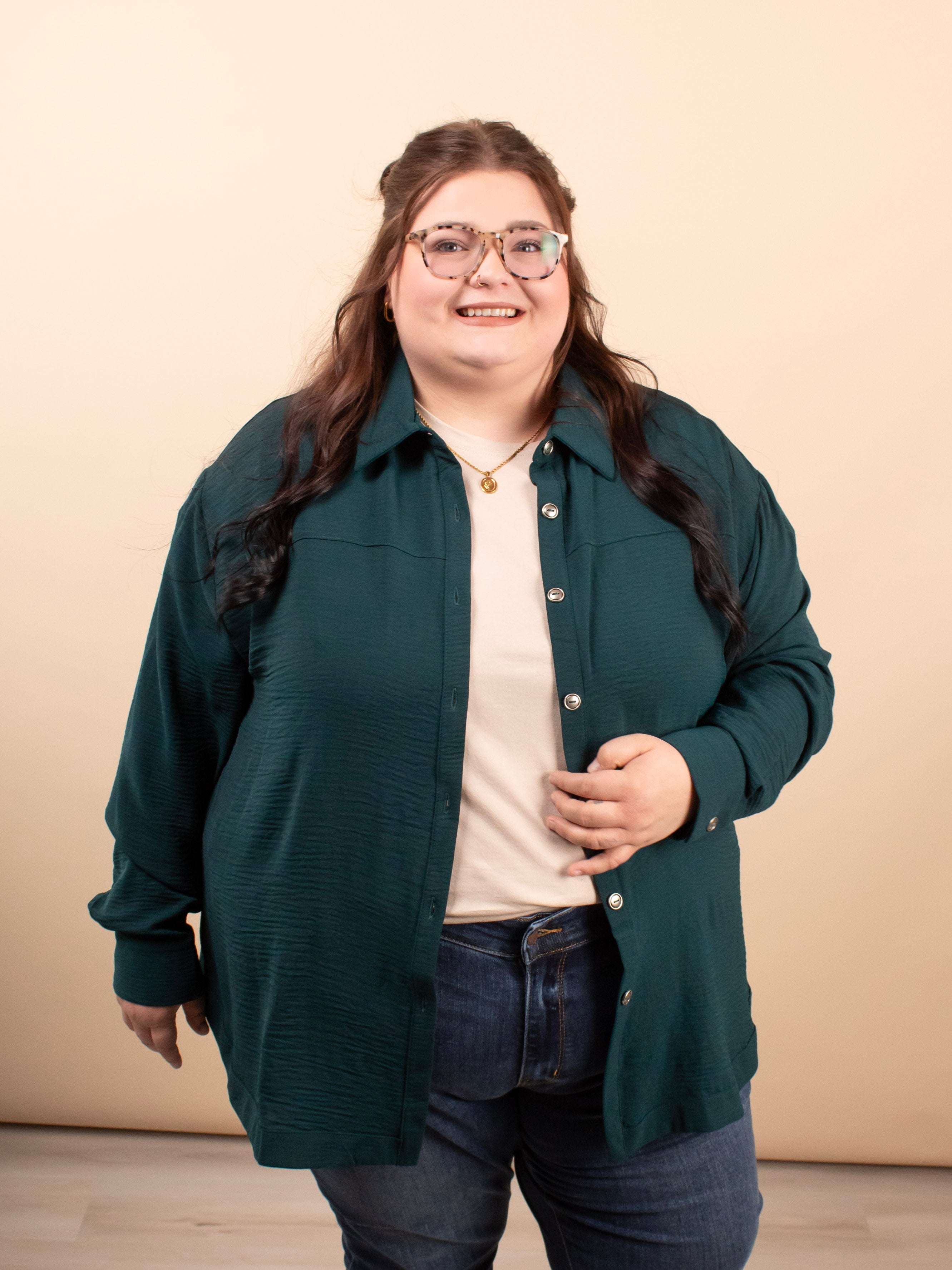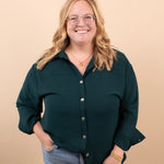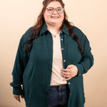 Meet the elevated staple your closet has been waiting for. The Evergreen Edge Button-Up features a beautiful deep green tone, sleek gunmetal buttons, and a longer-length silhouette that’s perfect for styling open or fully buttoned. With its silky feel and clean, classic lines, it instantly dresses up denim, trousers, or leggings.