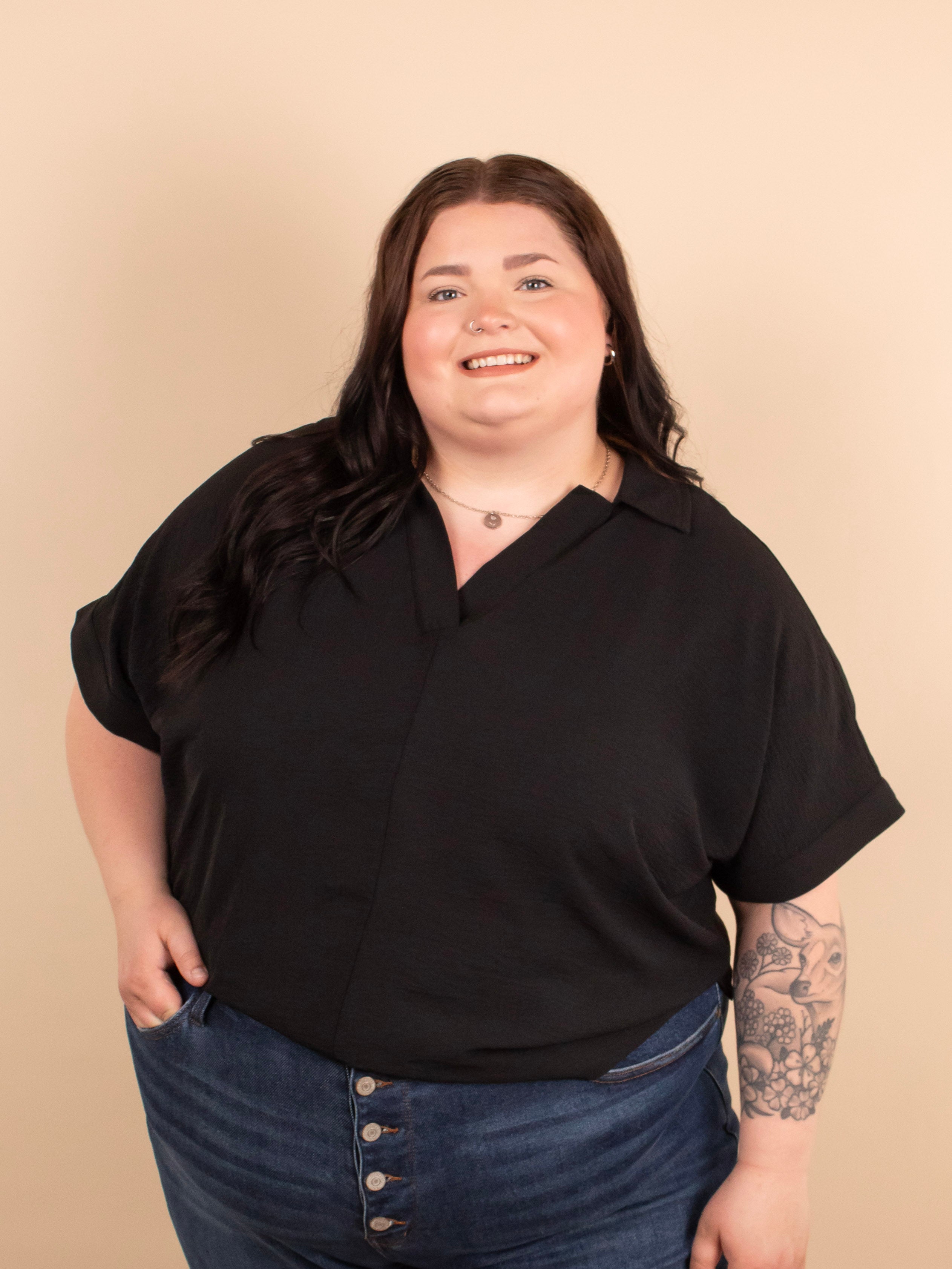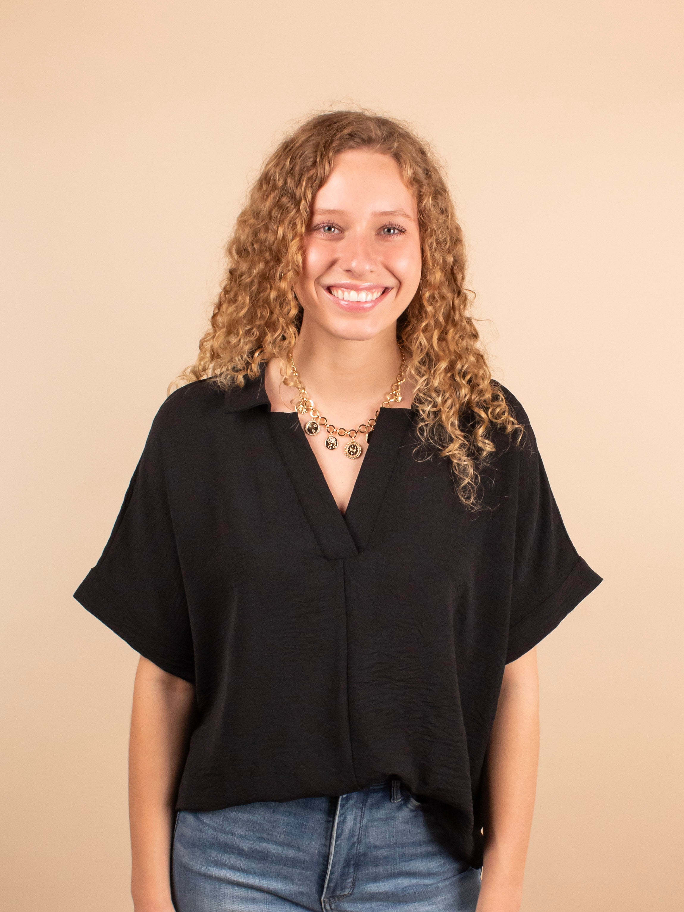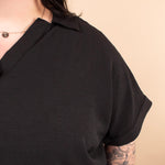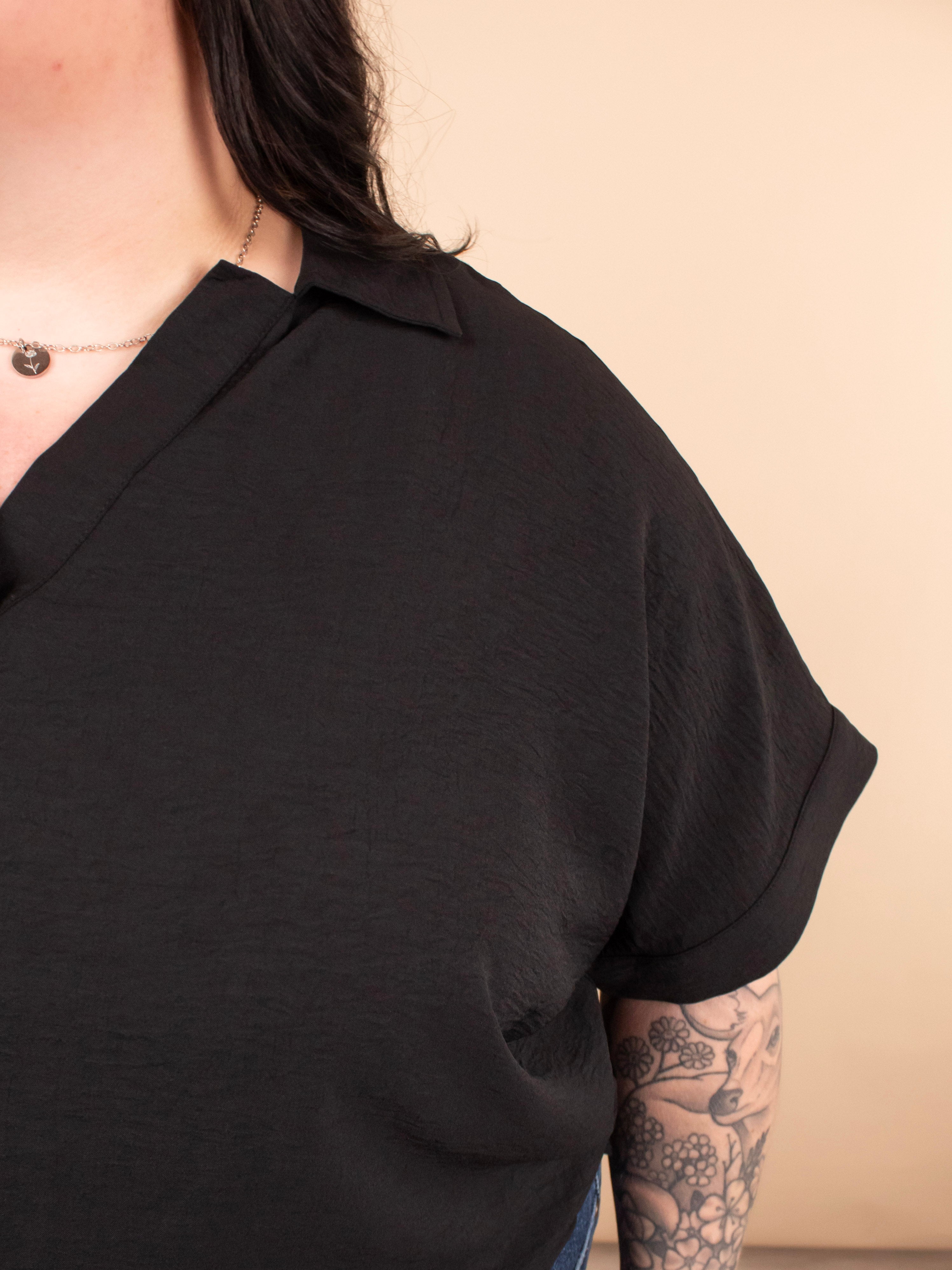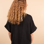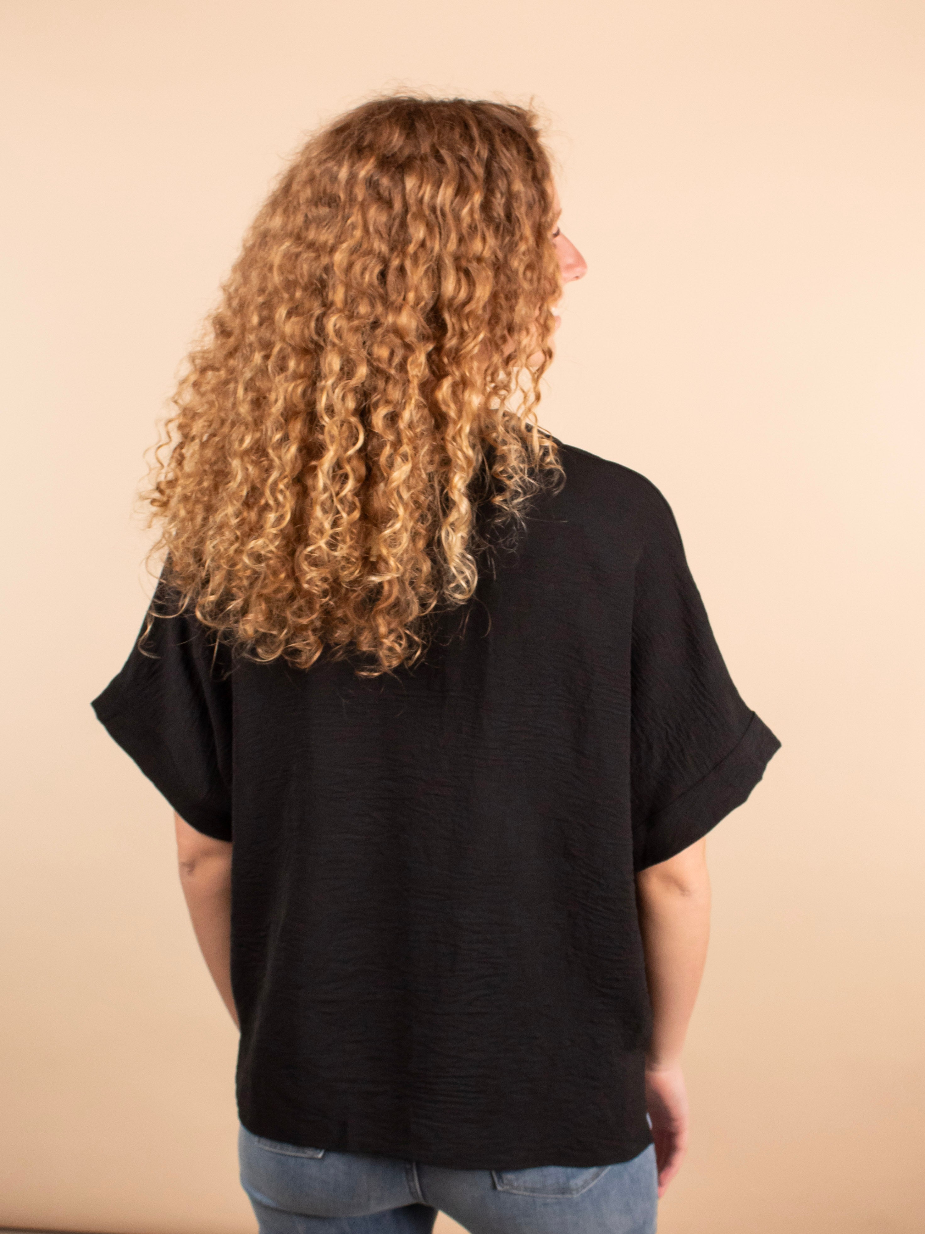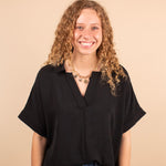 The Everyday Edge Top in Black is your go-to piece when you want something simple yet elevated. This breezy black v-neck offers the feel of your favorite tee with a more polished, dressed-up vibe. The lightweight (but not sheer) fabric drapes beautifully and feels effortless, making it perfect for everything from work to weekend plans. Pair it with anything—dress pants, denim, skirts, or shorts—for a chic and versatile look.