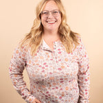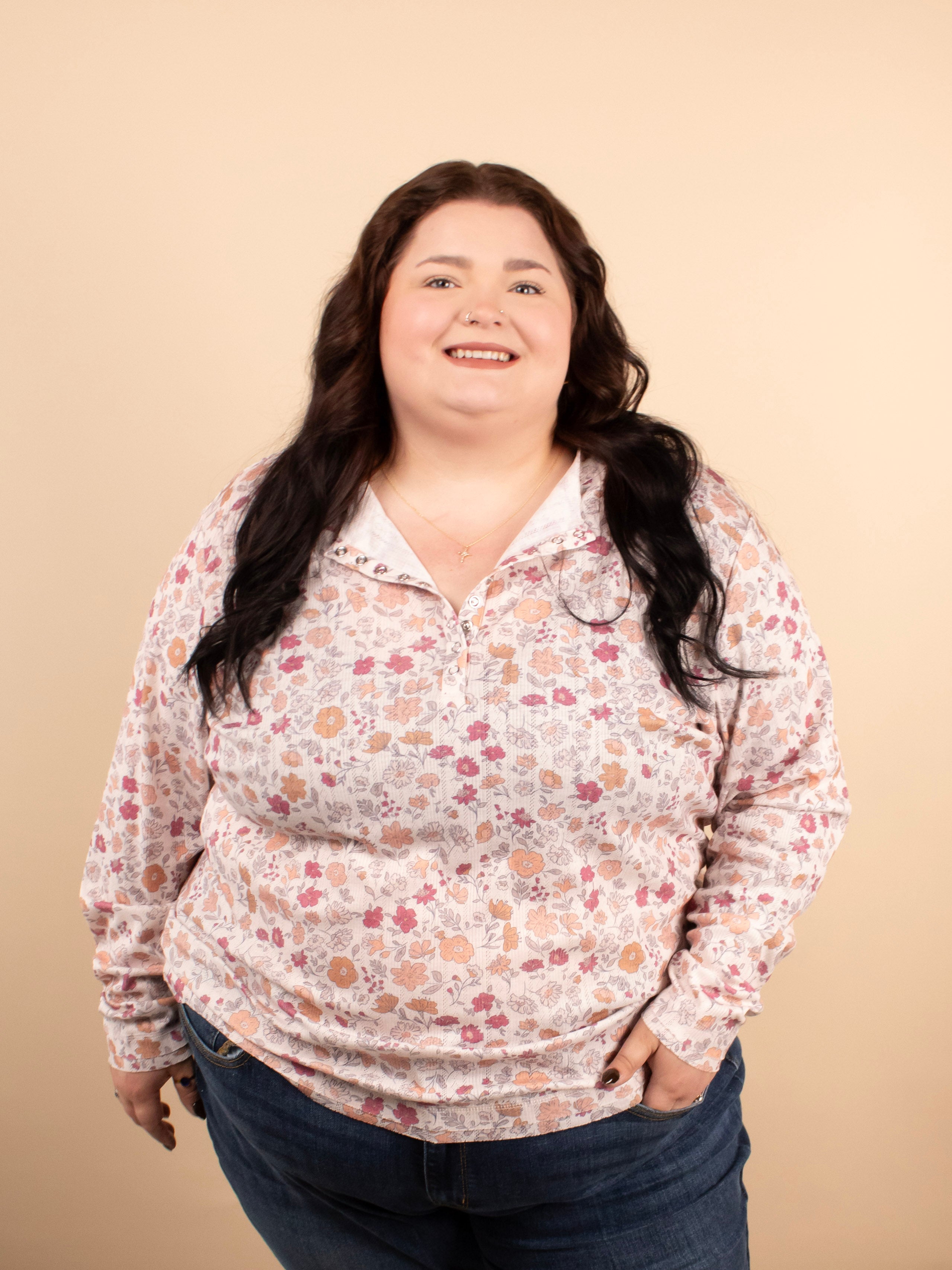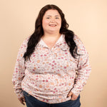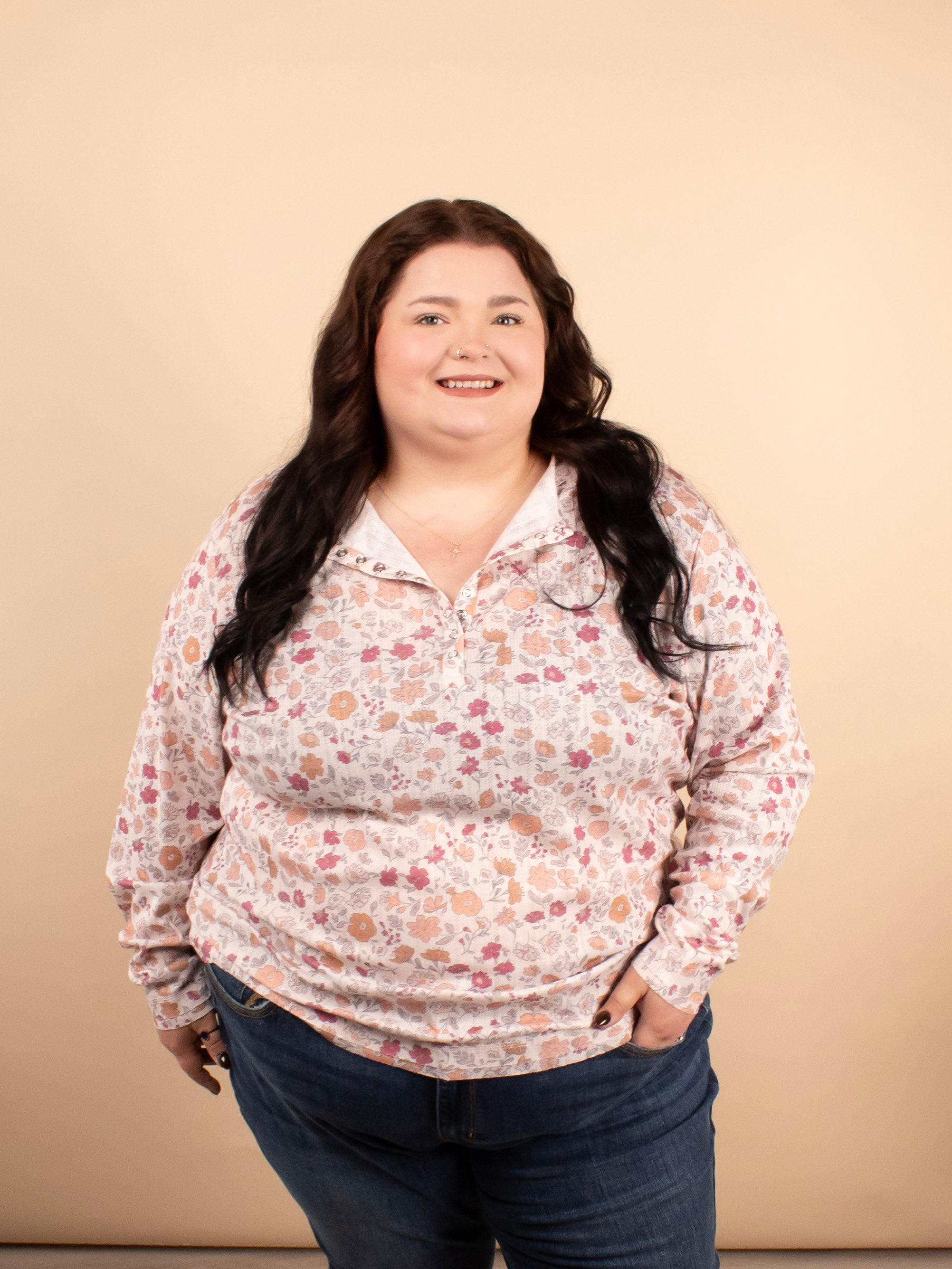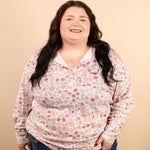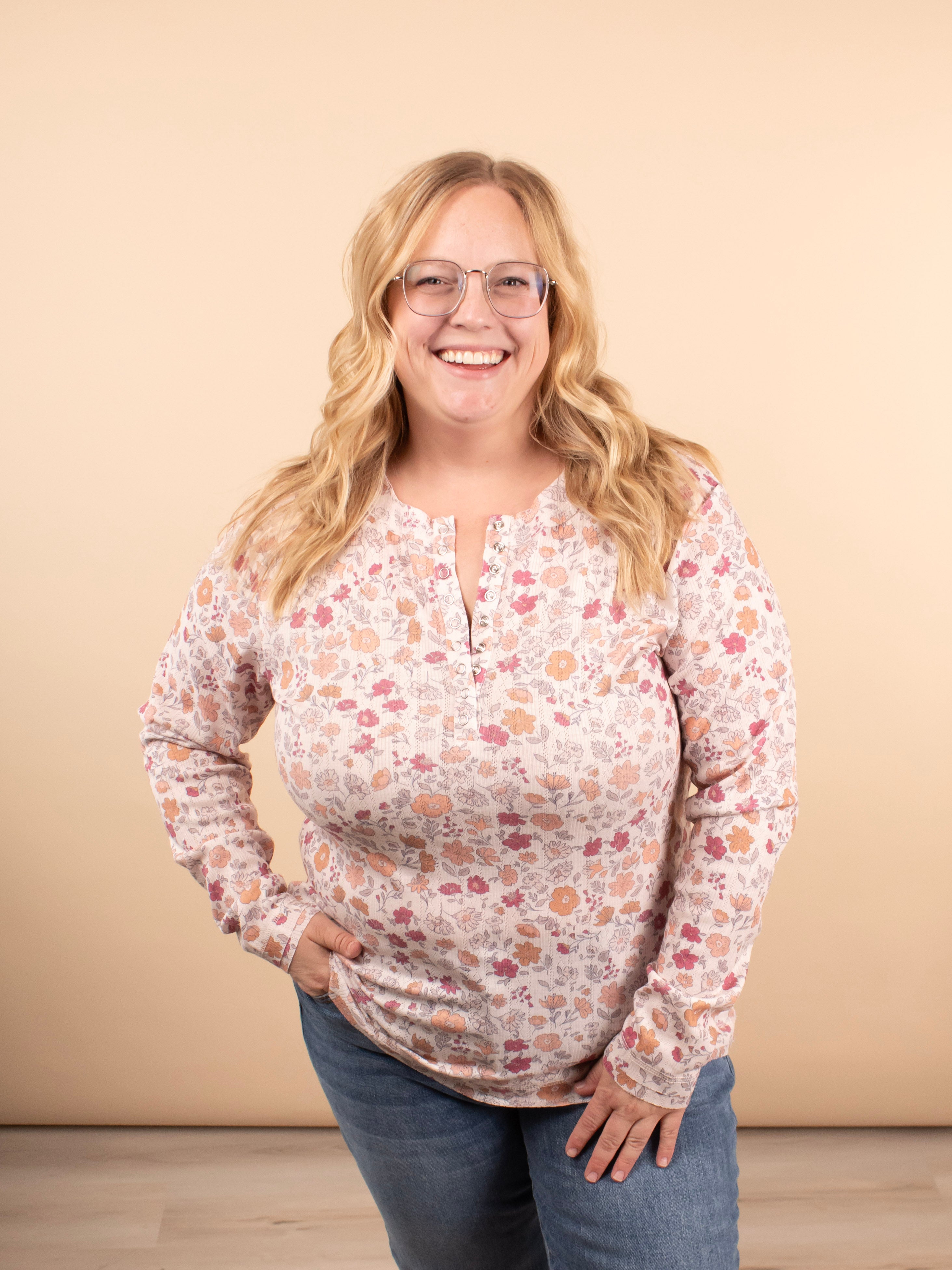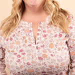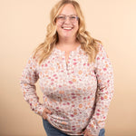 The Falling Flowers Long Sleeve Henley Top blends vintage charm with cozy fall style. Featuring a beautiful floral pattern in warm autumn tones and delicate lace-like fabric with tiny eyelet details, this top adds the perfect touch of femininity to any outfit. Functional buttons let you adjust the neckline for your ideal fit — wear it open for a relaxed vibe or closed for a classic look.