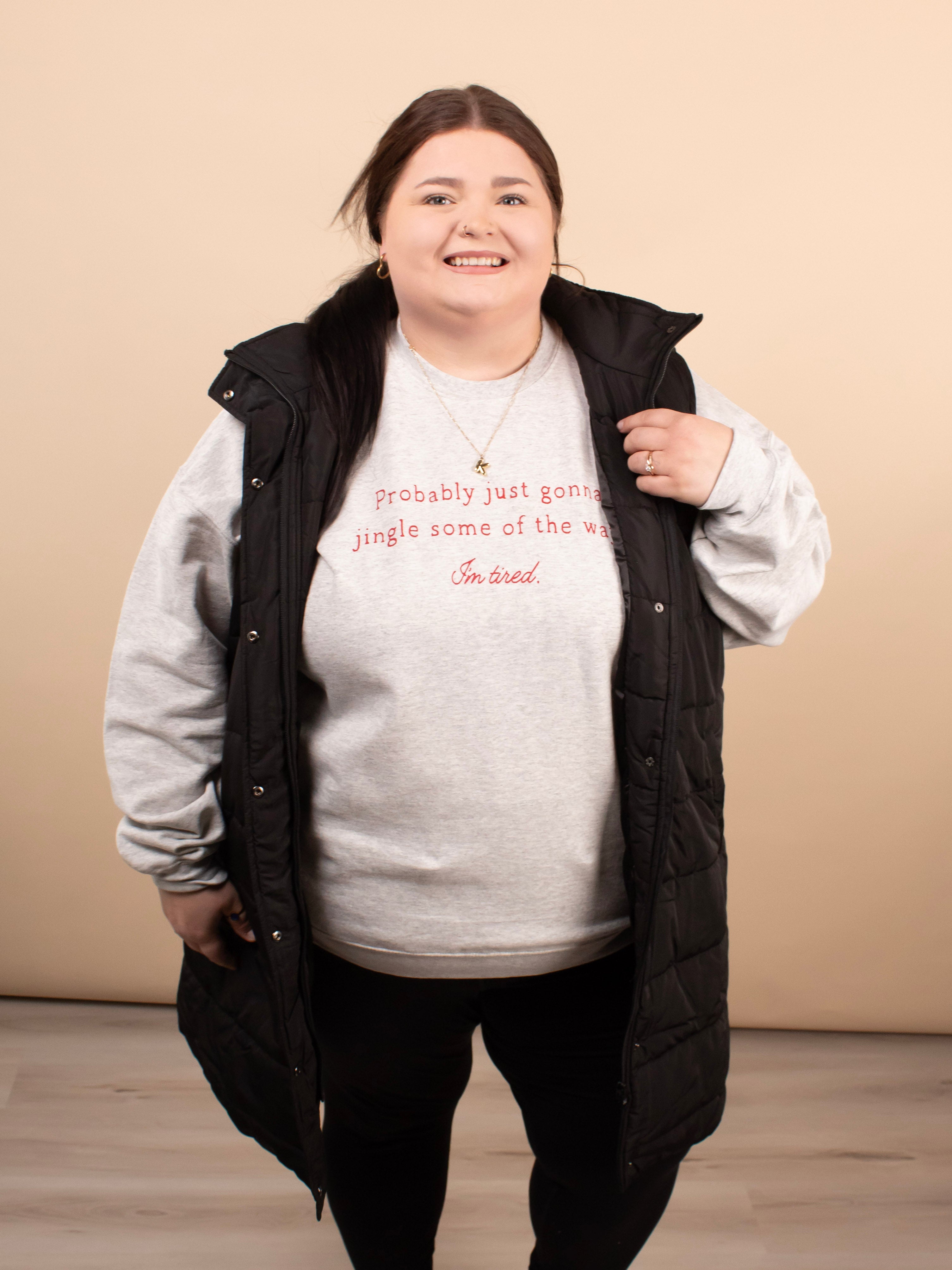 For the gals who love the holidays… but also love a nap. This crewneck brings the perfect blend of festive and funny with its playful phrase, “Probably just gonna jingle some of the way. I’m tired.” Soft, cozy, and effortlessly cute, it’s the ideal throw-on for marathon shopping days, tree-decorating nights, or any moment you want to look festive without going full-on holiday sparkle. A must-have for gift giving — and an even better treat for yourself.