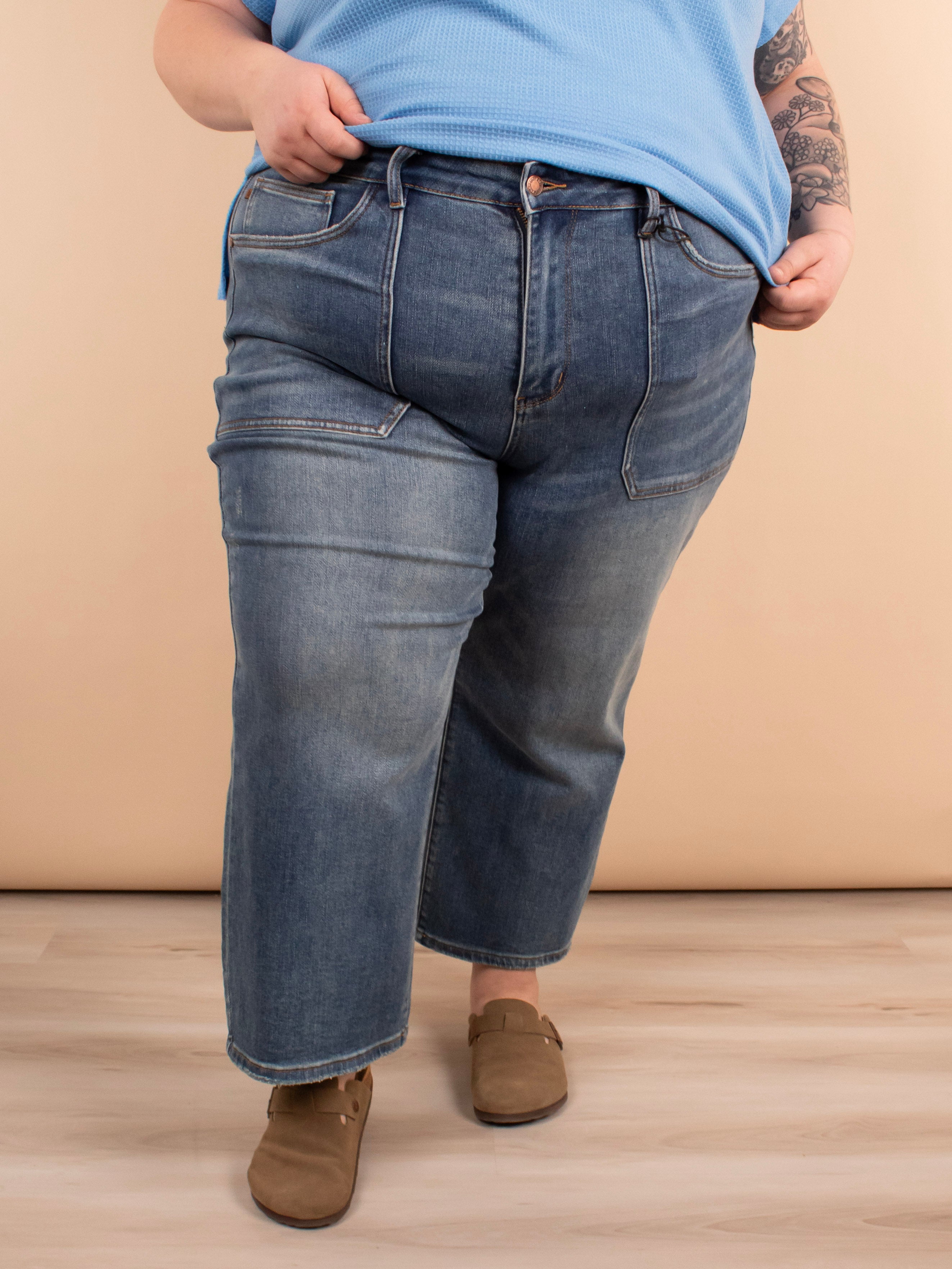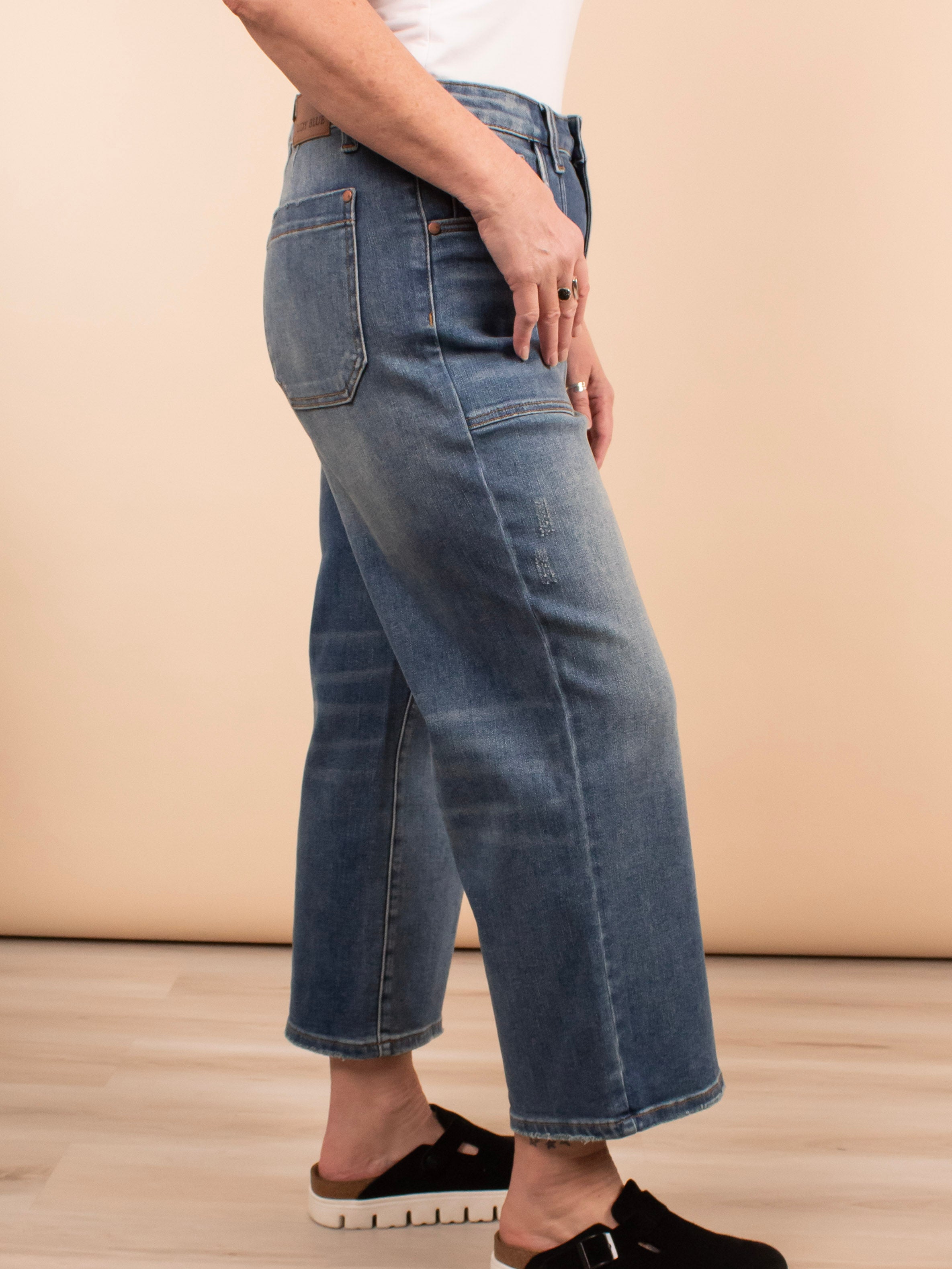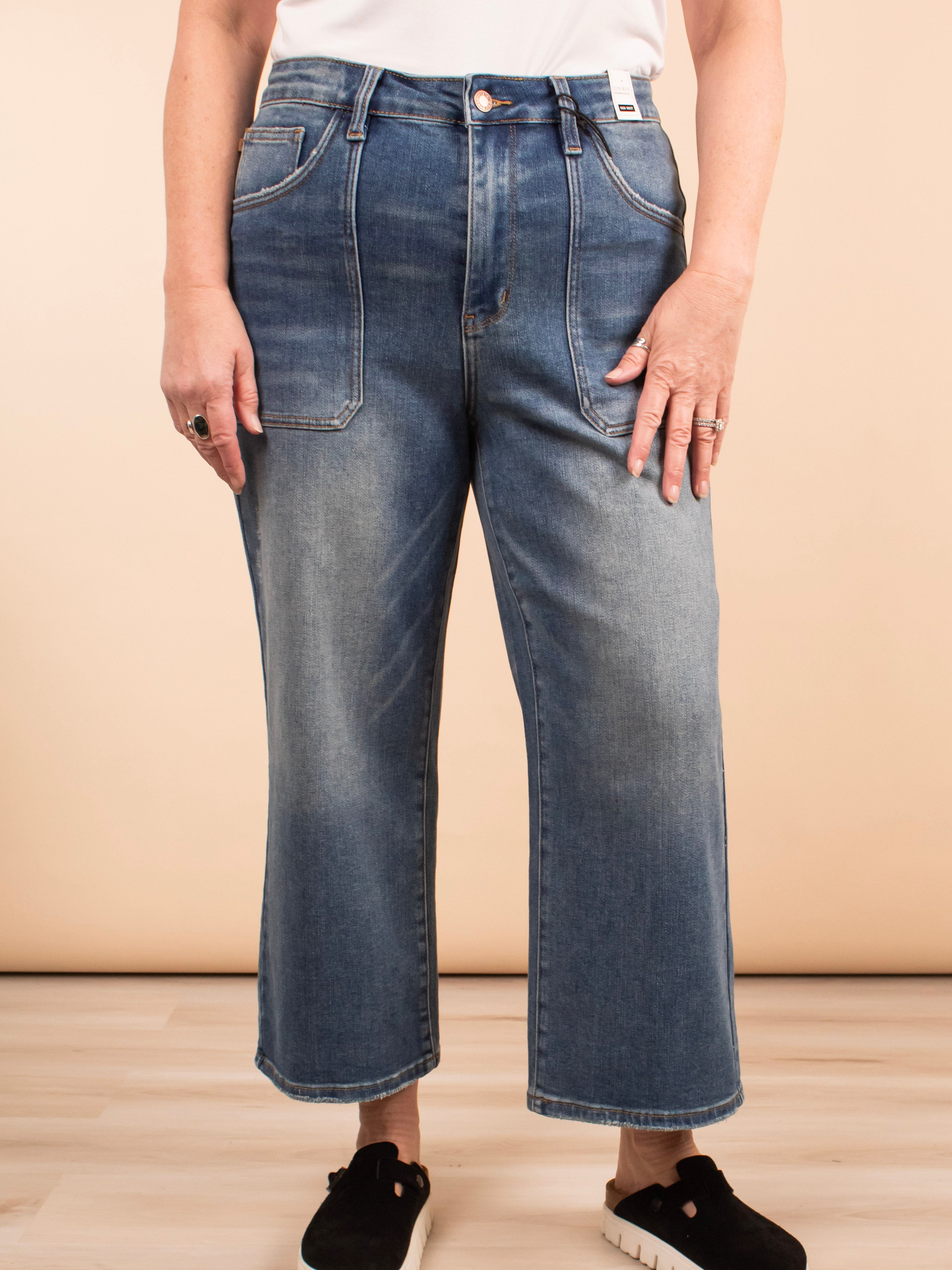Stay stylish and comfy in the Judy Blue High Waist Wide Crop Jeans. With a cropped length and shorter inseam, these jeans show off your legs in a trendy way. The adorable large pocket detail adds a unique touch while the high waist gives you a flattering silhouette. Made with stretchy and comfy material, these jeans maintain their shape for all-day wear.