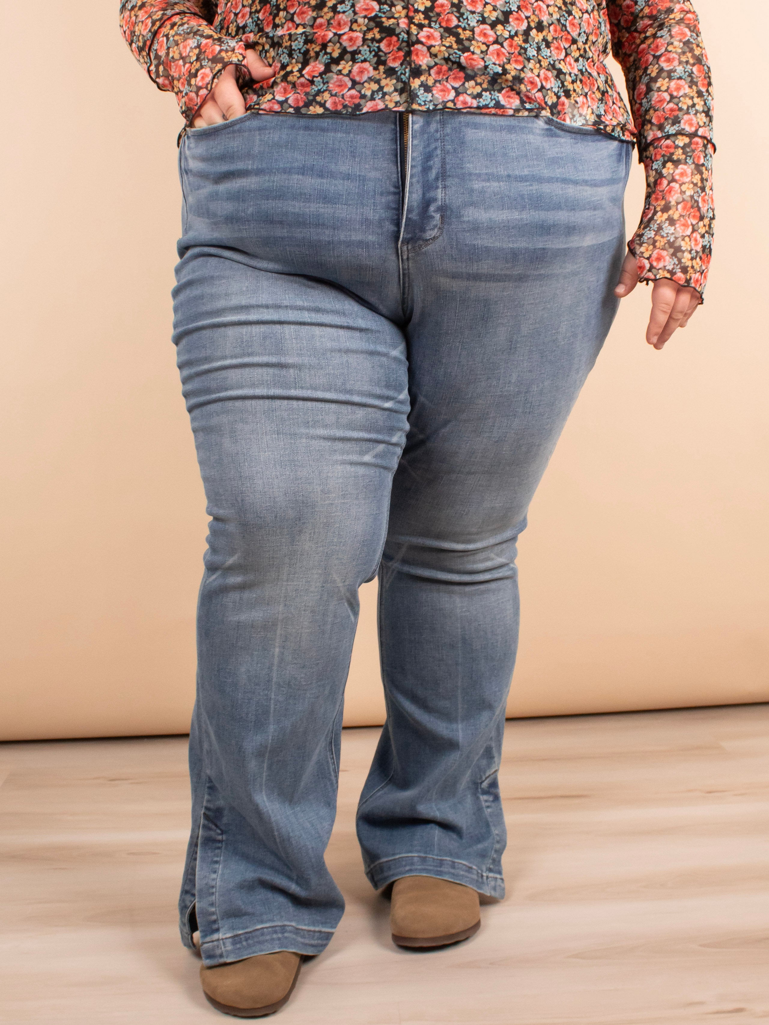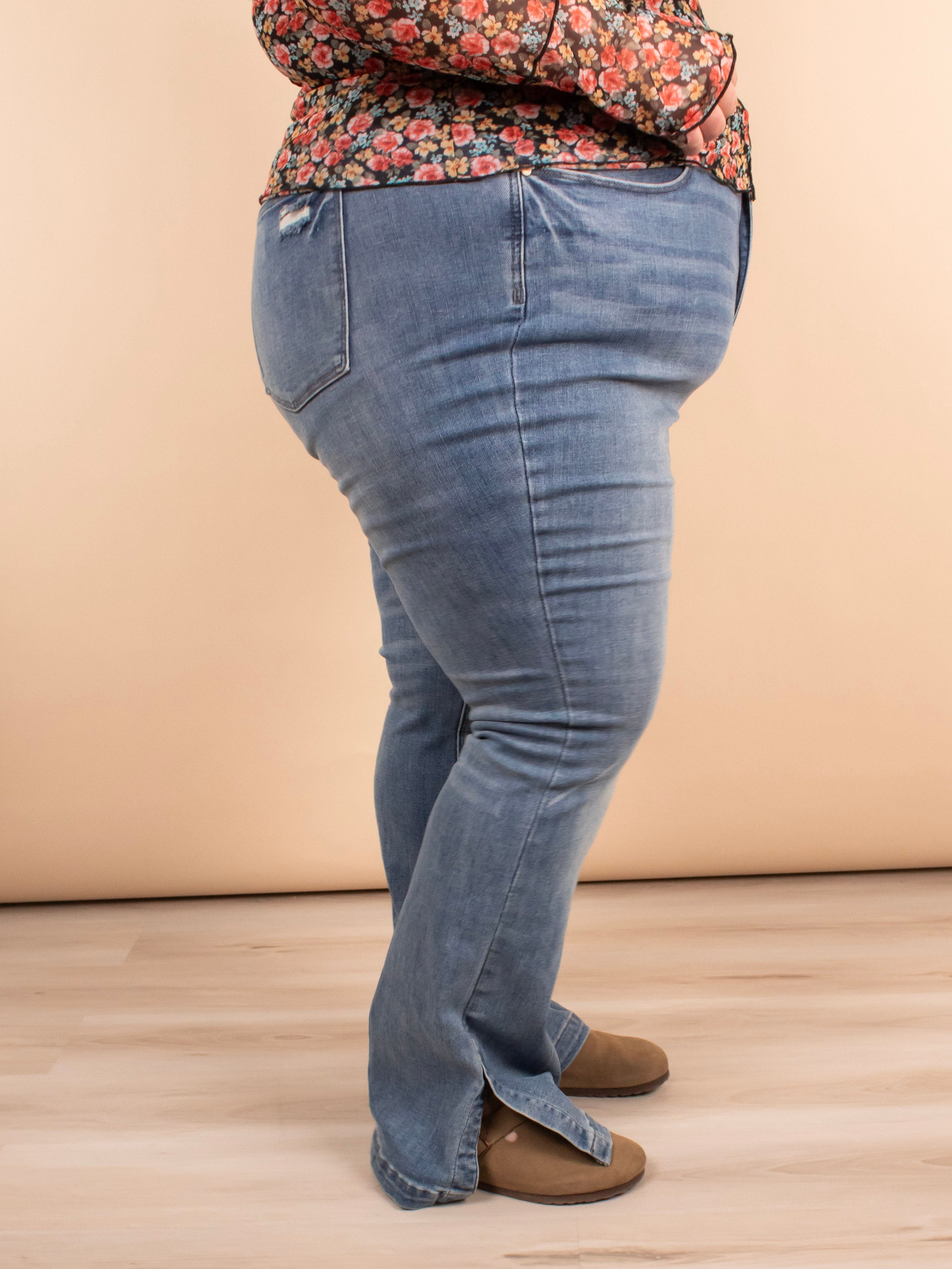 Stay confident and comfortable all day long with the Judy Blue Tummy Control High Waist Slim Bootcut Jeans! Its tummy control panel smooths your waistline while maintaining the perfect shape. The longer inseam and adorable side slit detail add a stylish touch to these stretchy and comfy high waisted jeans.