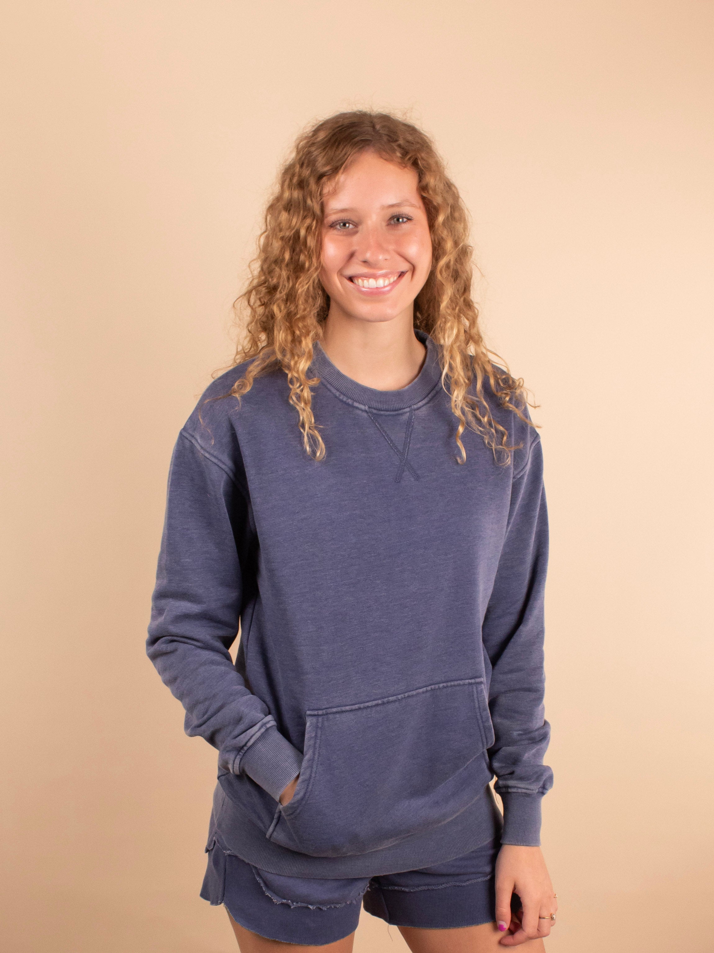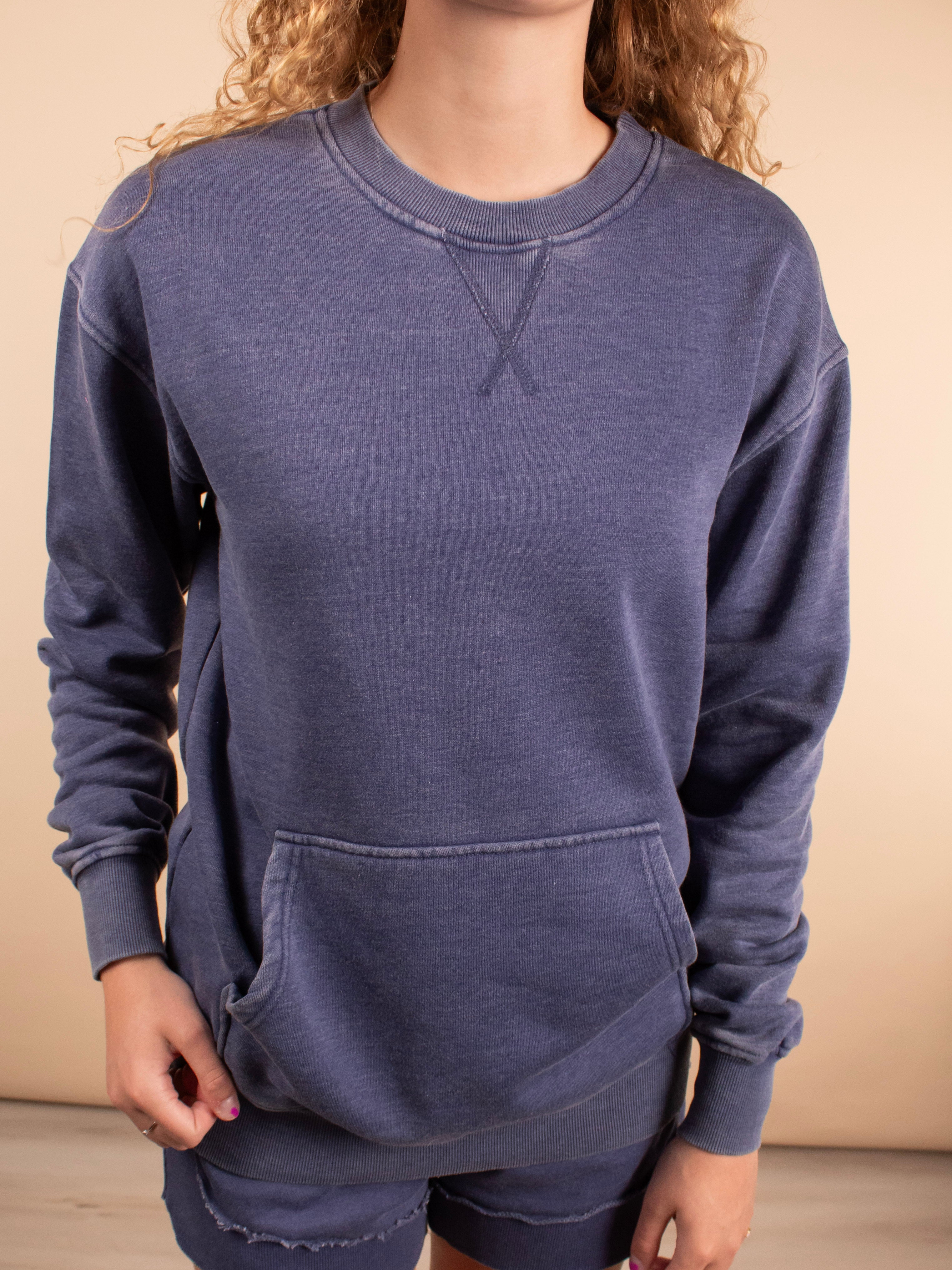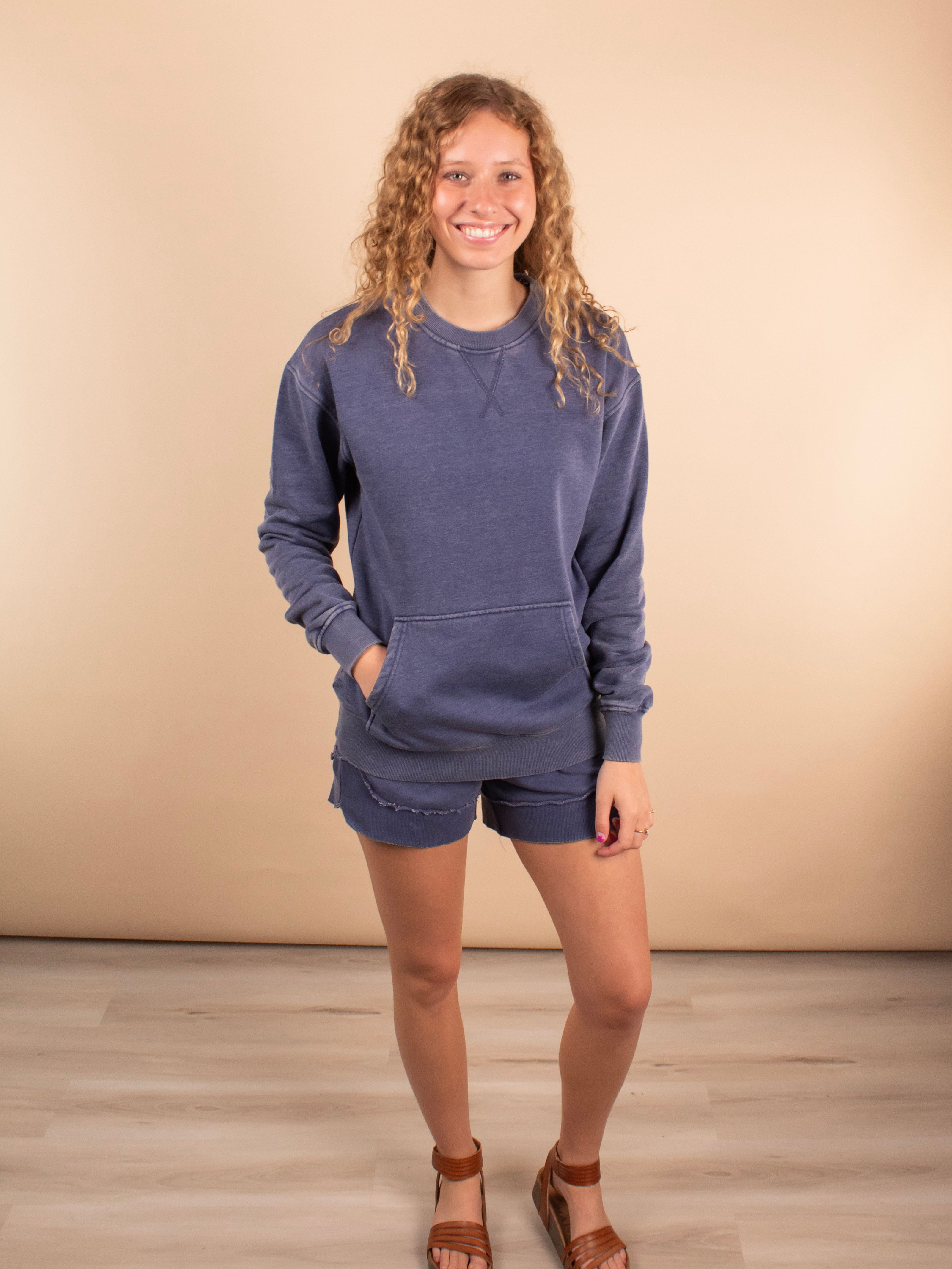 Classic, comfy, and made for Midwest summer lounging. The Lakeside Lounger Crewneck in Navy is your go-to pullover for cool mornings on the porch or nights around the fire. This timeless piece features an ultra-soft interior, relaxed fit, and a cozy front pocket just like your favorite traditional sweatshirt. Whether you're heading to the cabin or staying in, this crewneck brings easy, everyday comfort.