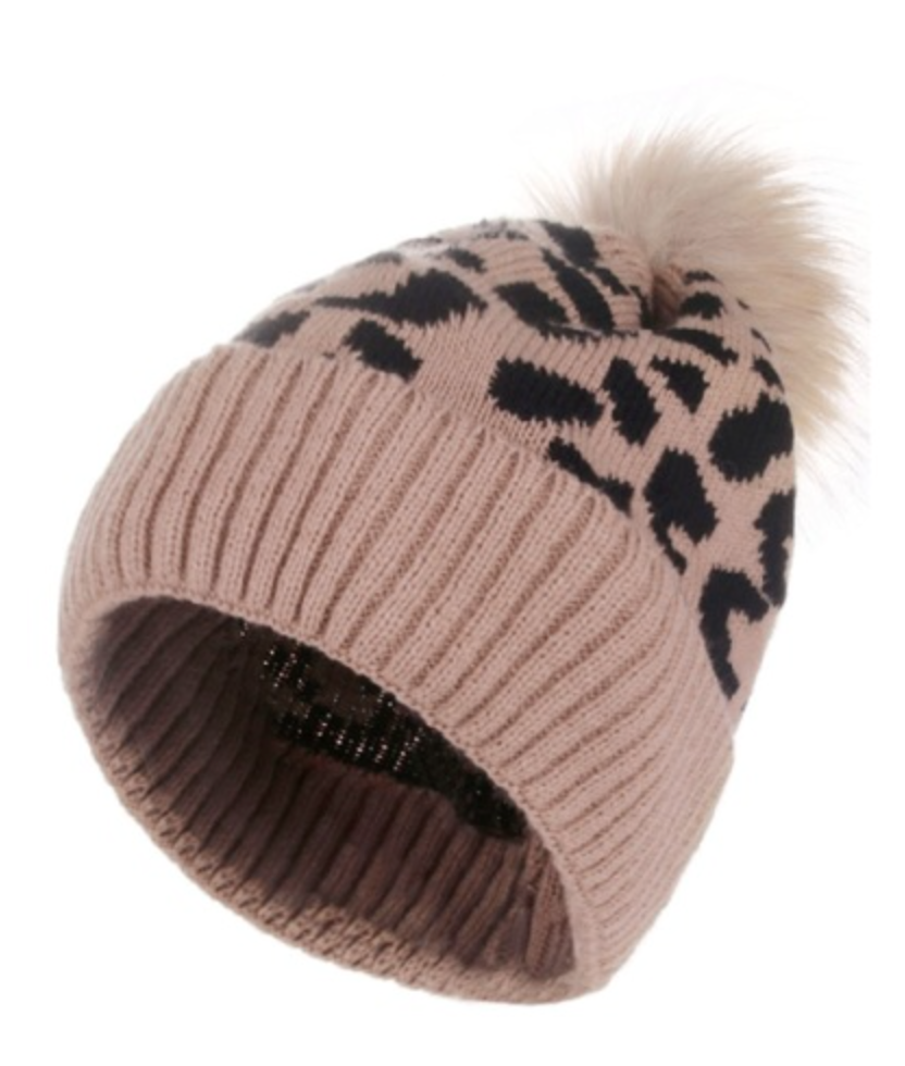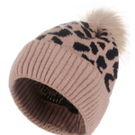 Stay cozy and cute all season long in this soft knit beanie featuring a playful leopard pattern and fluffy pom pom accent. Perfect for everyday wear with a touch of fun!