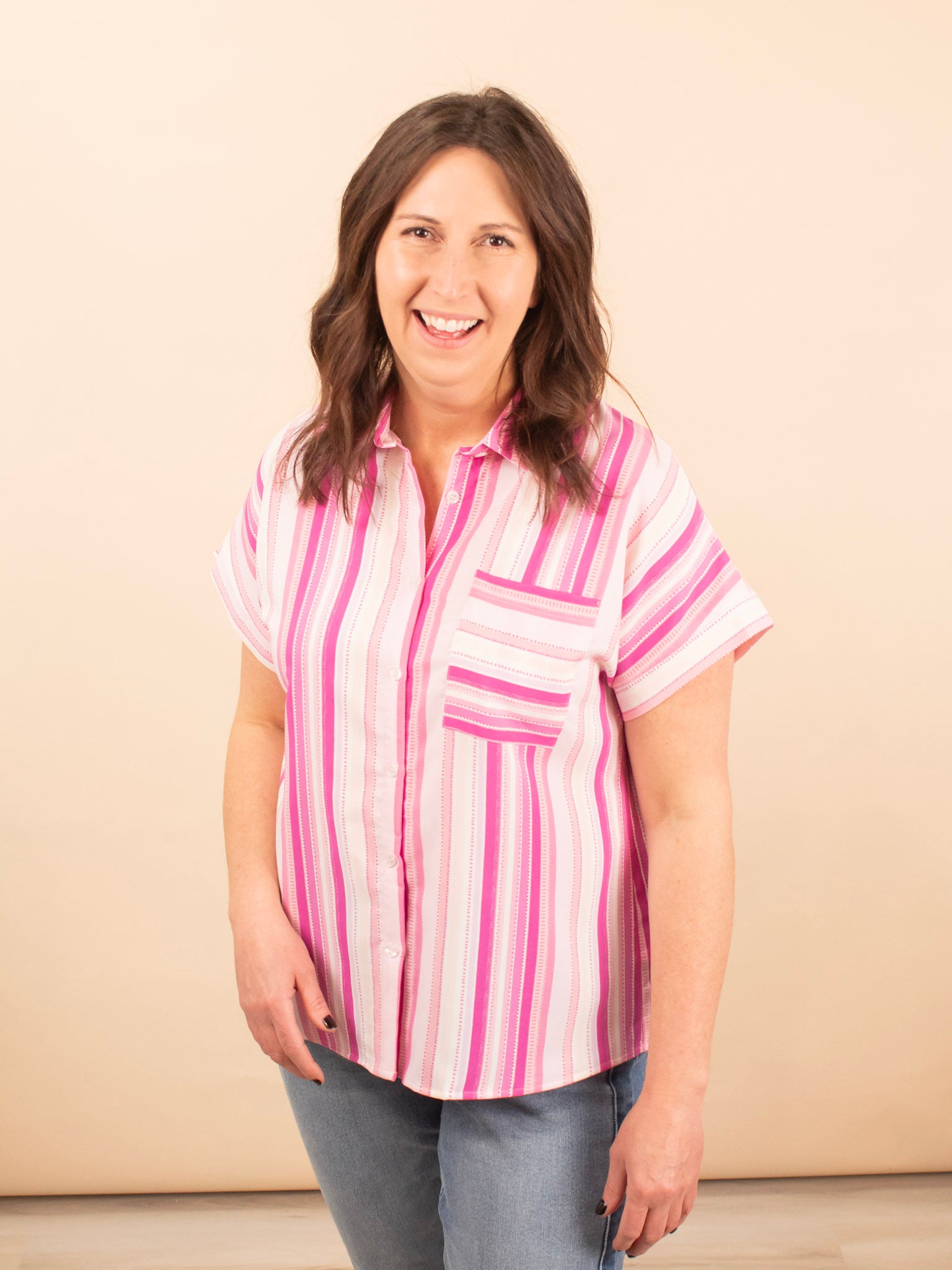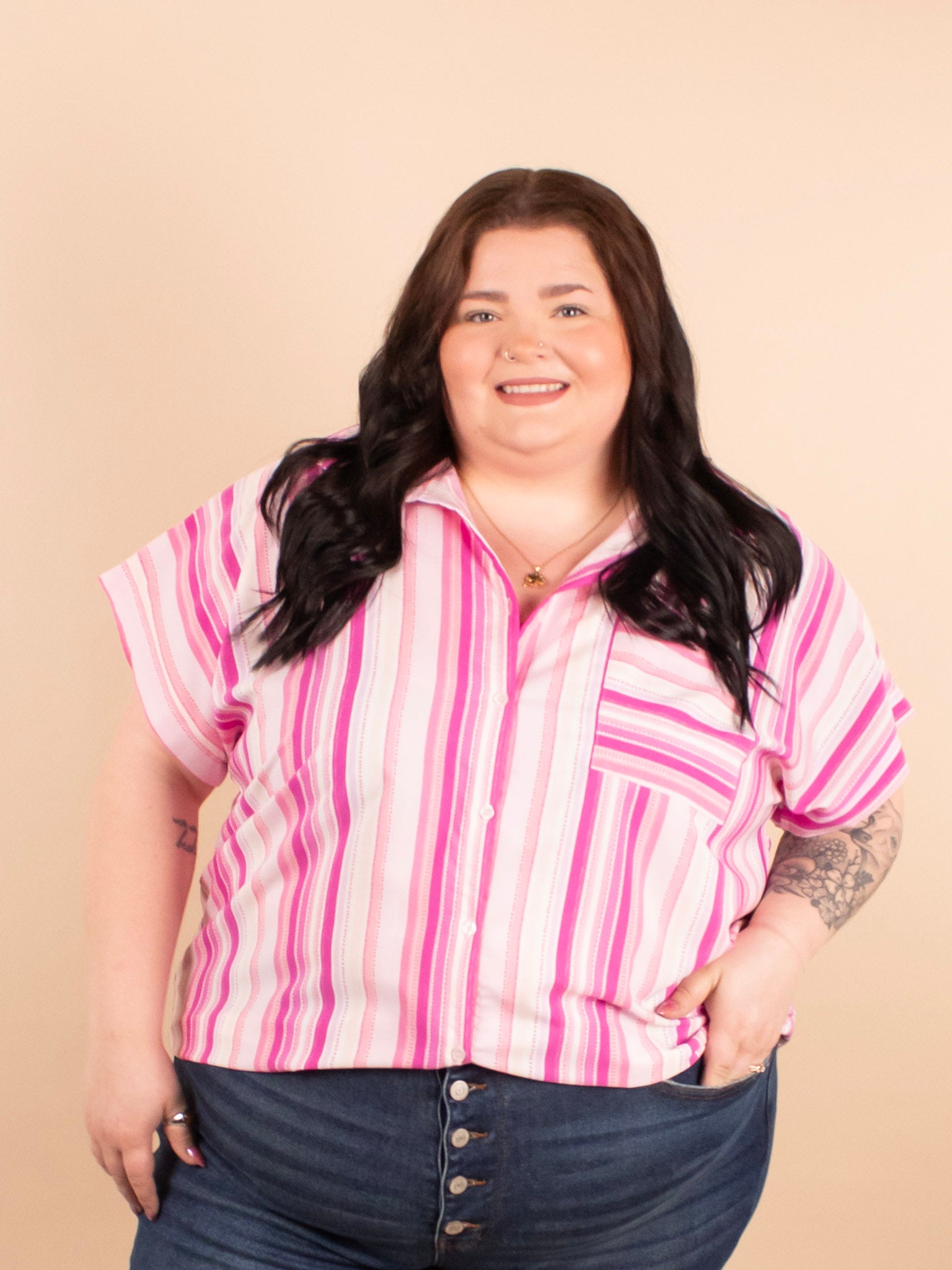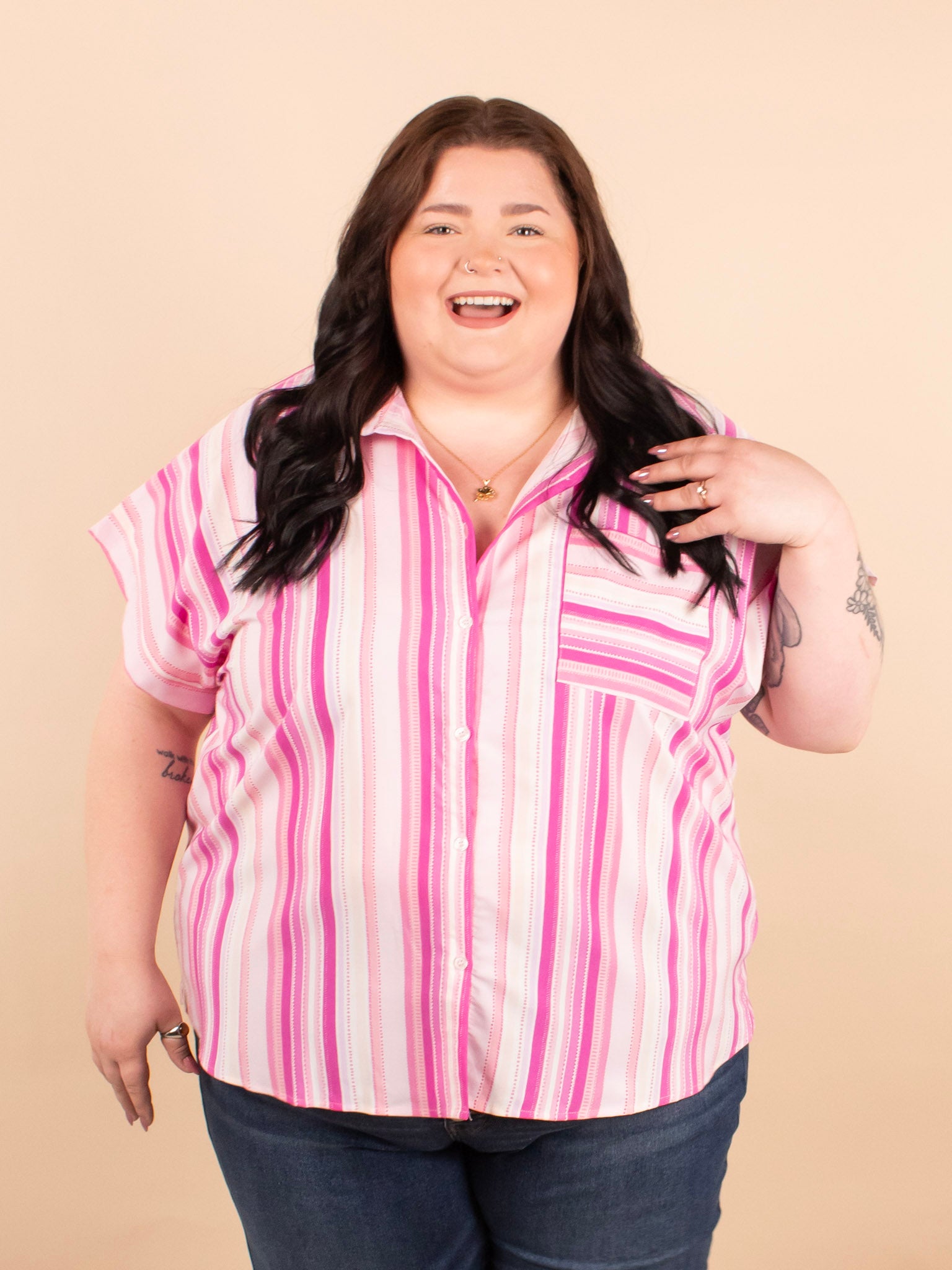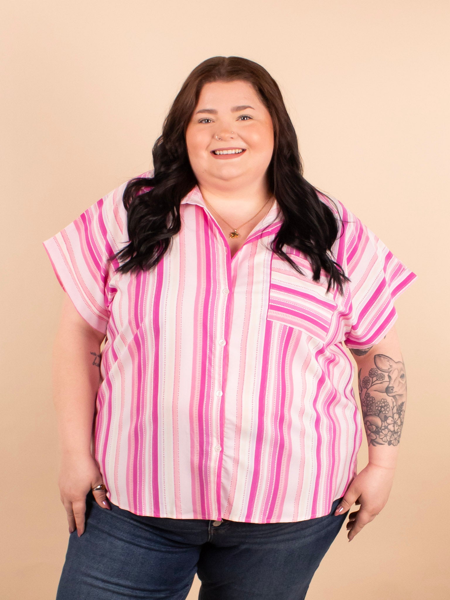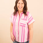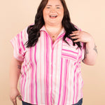 Add a refreshing pop of color to your wardrobe with the 'Pink Lemonade Button Down Top.' This lightweight, breezy shirt features flattering vertical stripes and offers versatile styling options—wear it buttoned up for a polished look or unbuttoned over a tank or tee for a relaxed vibe. Perfect for layering or wearing solo, it’s an easy addition to your spring and summer outfits.
