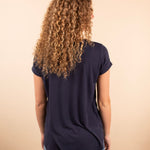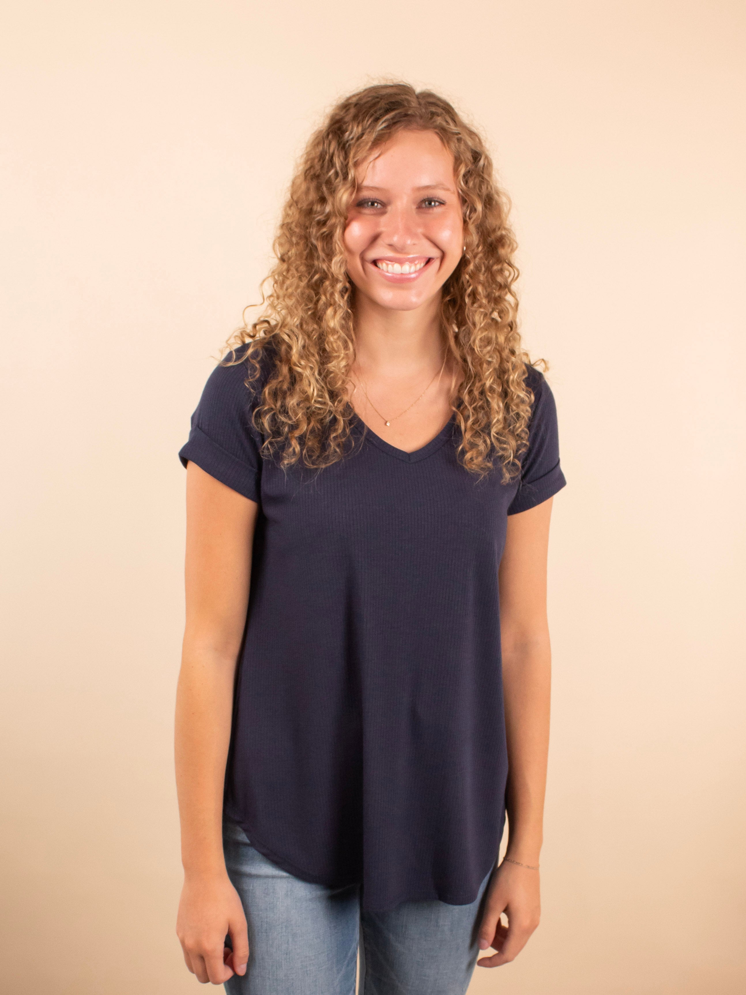 Meet your new go-to basic with a twist—the Ribbed Short Sleeve Top in Navy is designed with everyday ease in mind. Crafted from an ultra-soft, stretchy ribbed fabric, this top features a flattering, modest v-neck and a longer length that makes it perfect for styling tucked or untucked. Lightweight yet substantial, it’s a versatile layer you’ll reach for in every season.