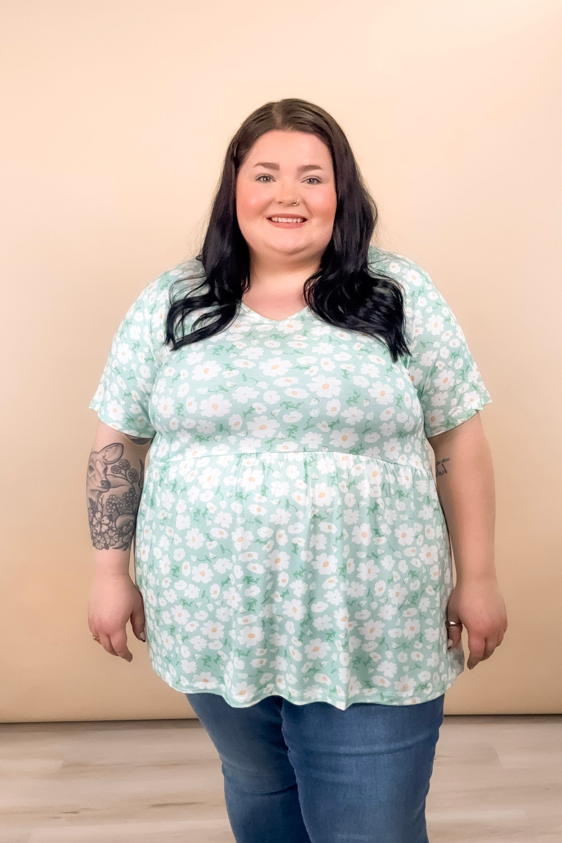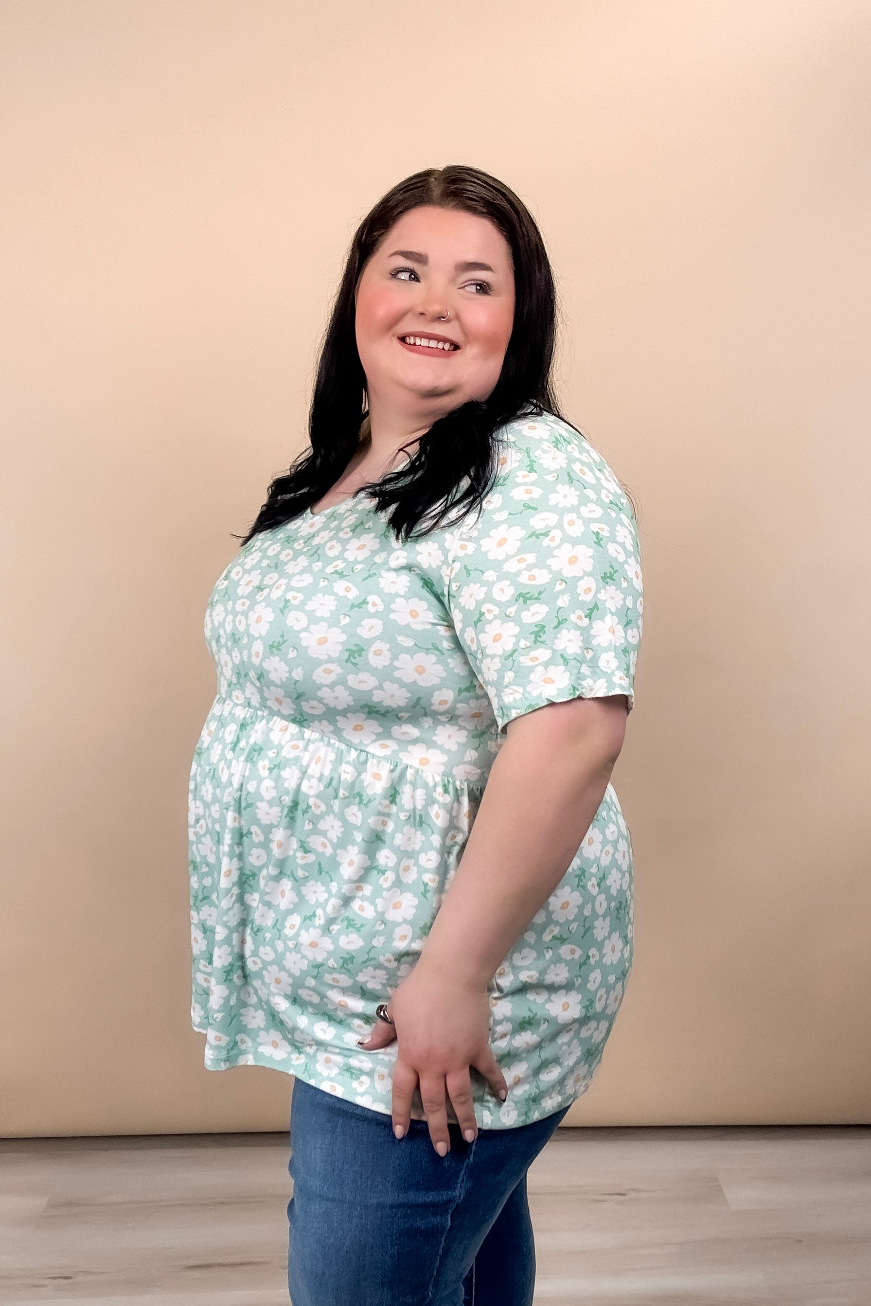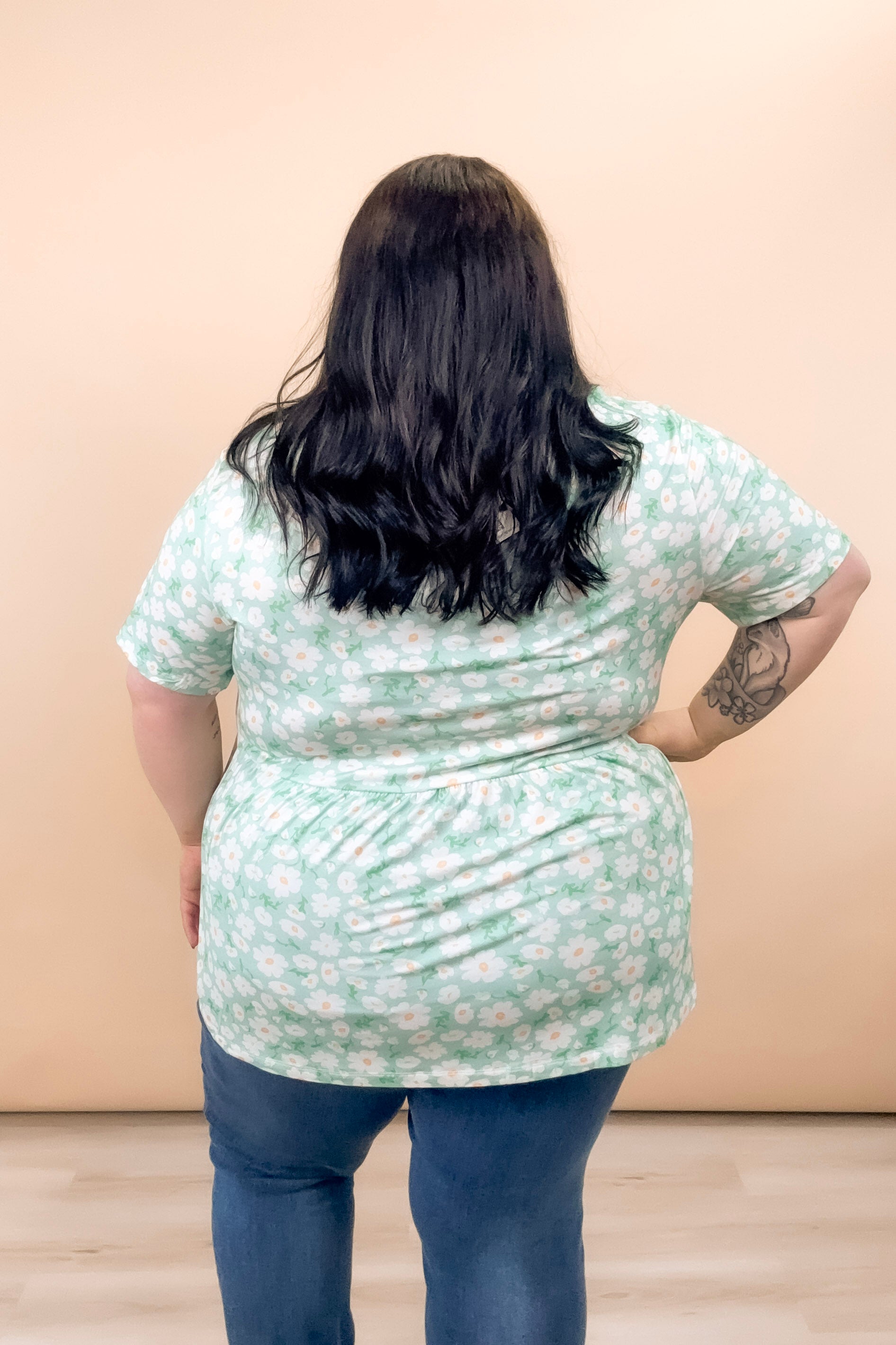 Get ready to turn heads with the Sammy Ruffle Short Sleeve! Featuring a flattering fit and an adorable green floral print, this top is soft and stretchy for all-day comfort. Layer a cardigan or jacket over this versatile piece for a stylish and effortless look.