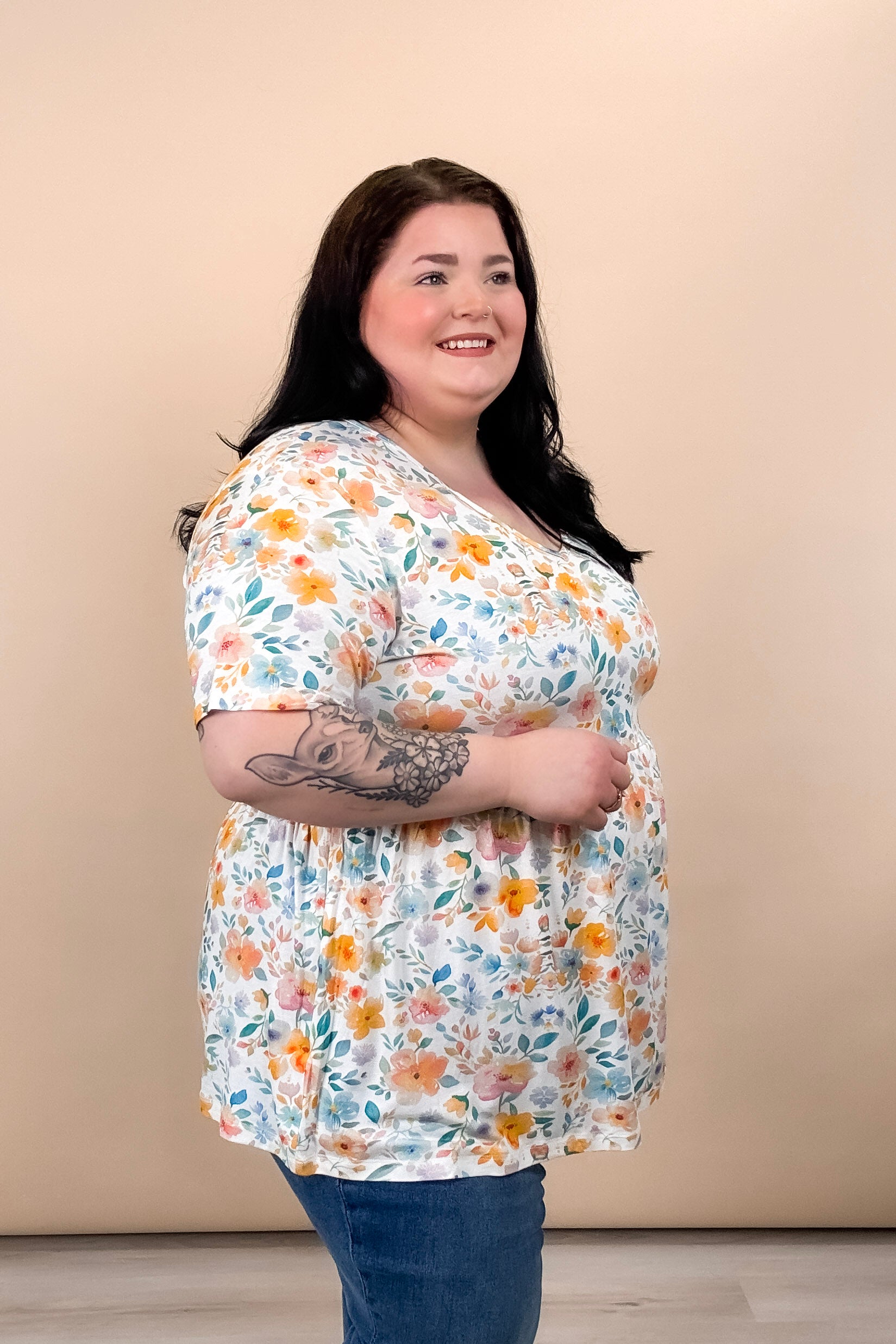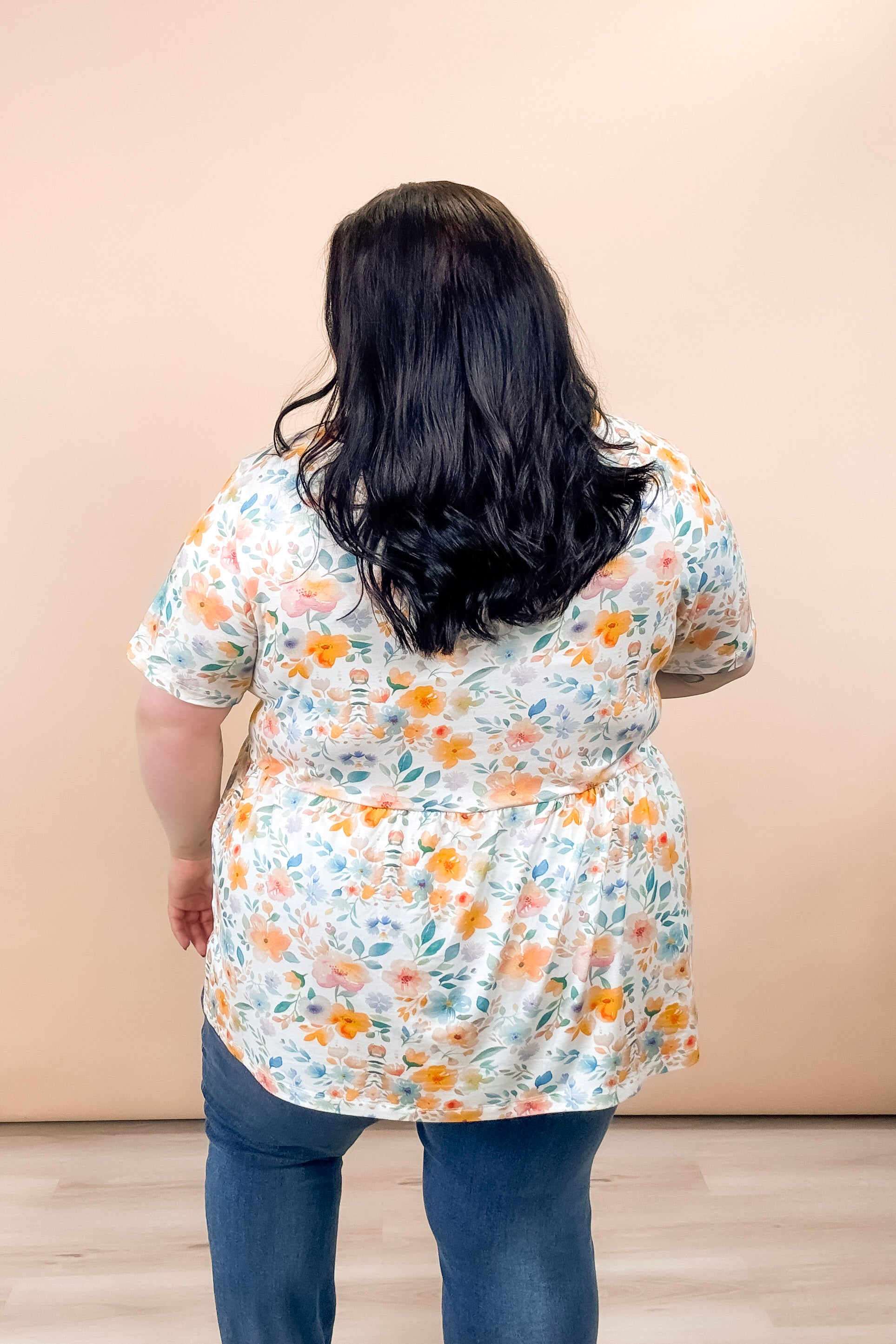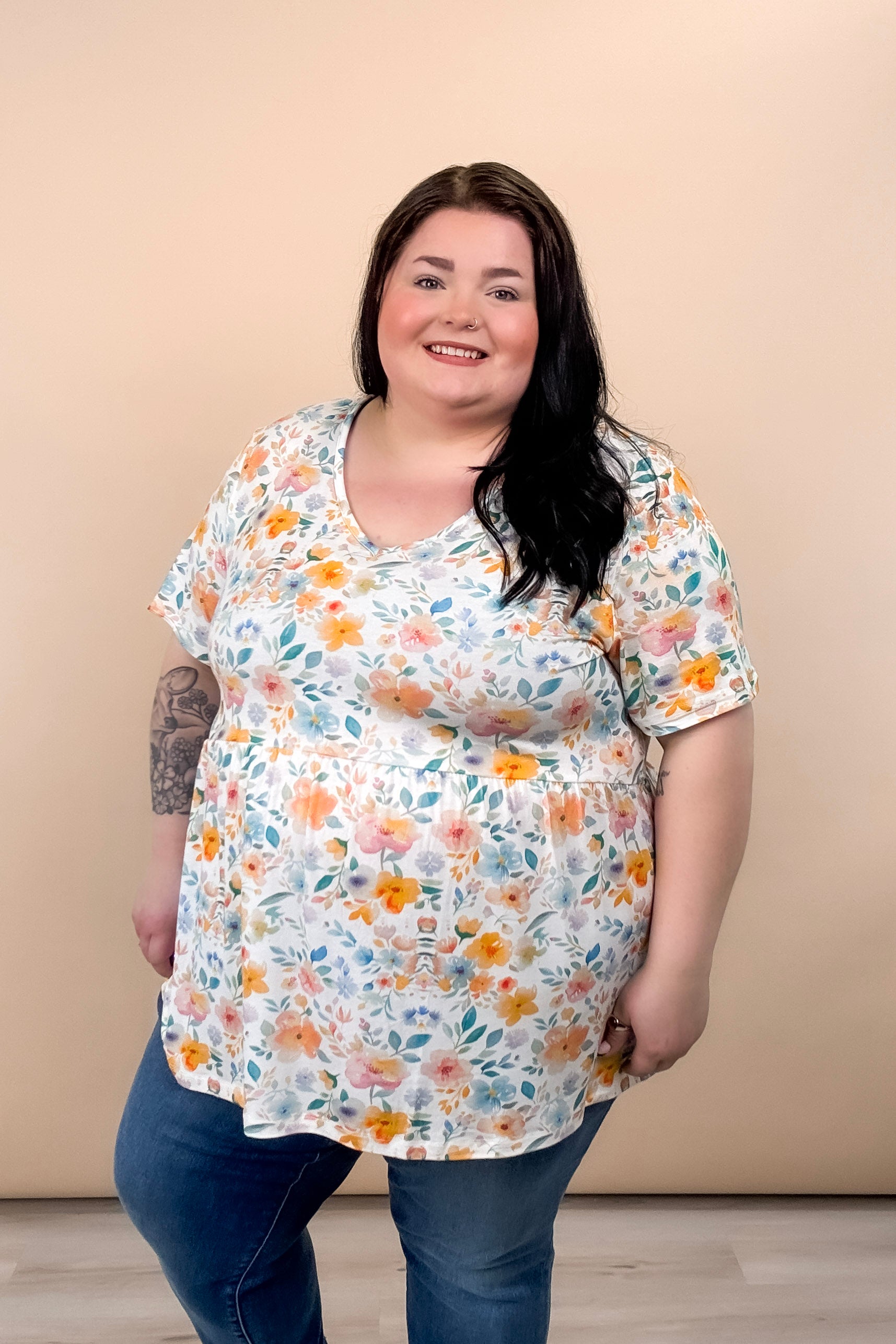 Get ready to turn heads with the Sammy Ruffle Short Sleeve! Featuring a flattering fit and an adorable watercolor floral print, this top is soft and stretchy for all-day comfort. Layer a cardigan or jacket over this versatile piece for a stylish and effortless look.