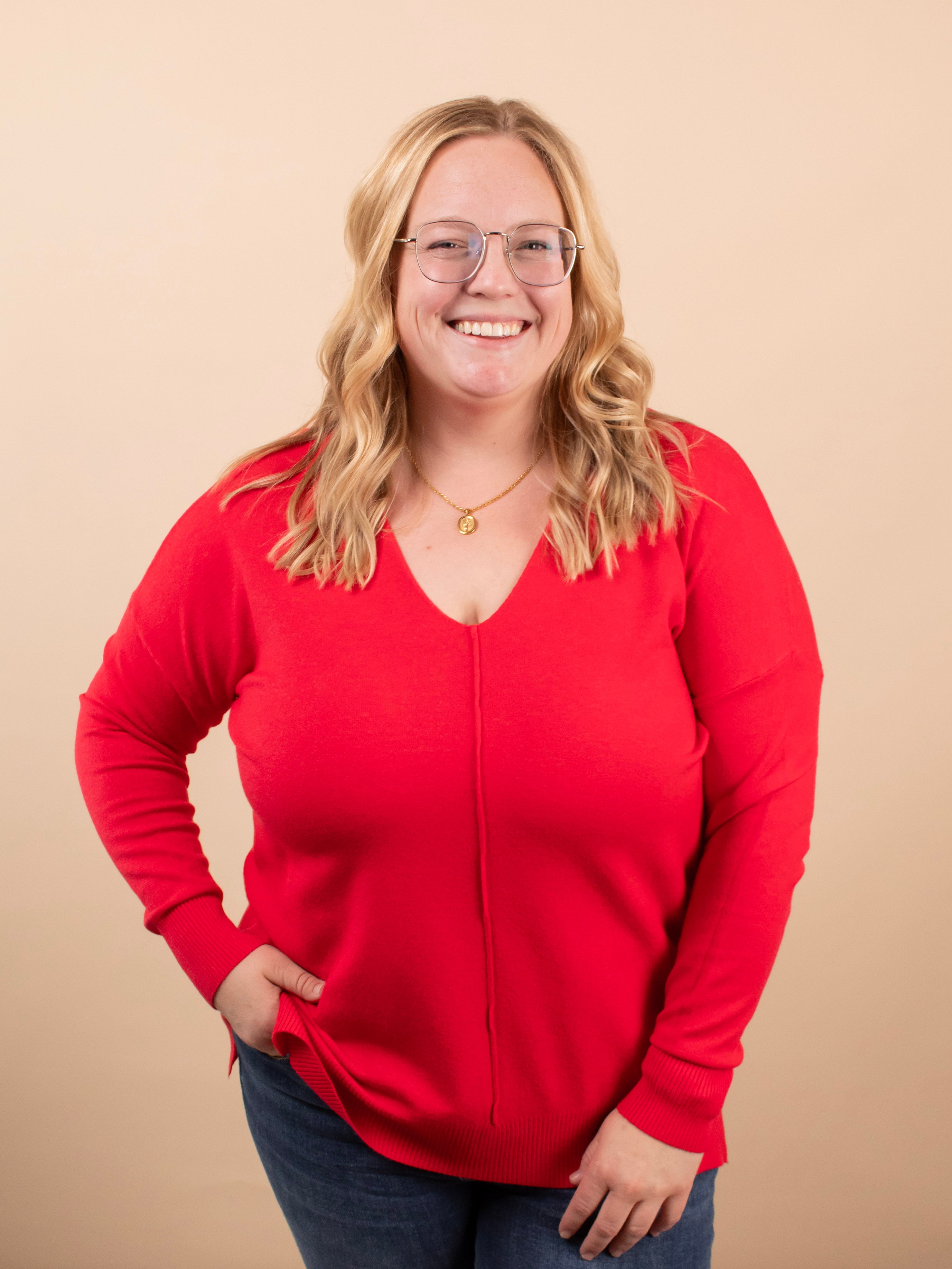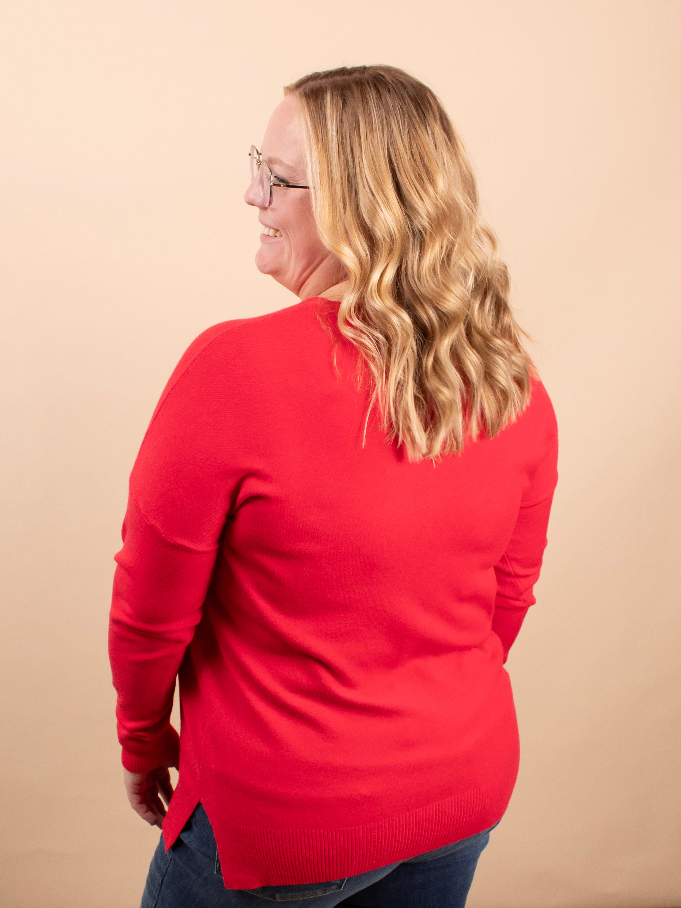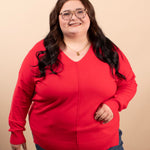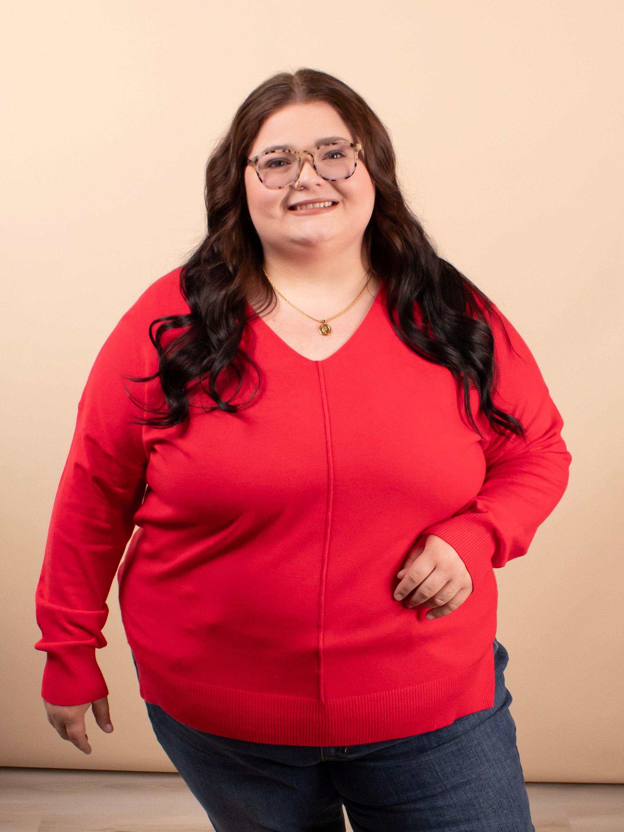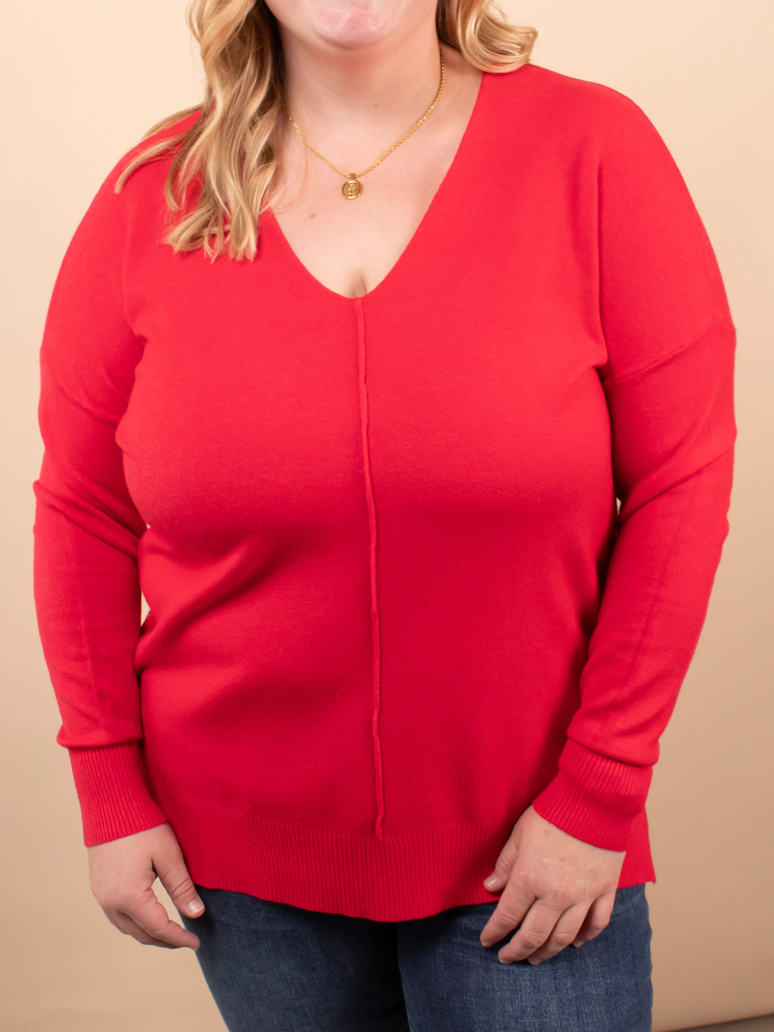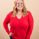The Silky Soft Front Seam Sweater in Ruby Red brings a pop of vibrant, candy-apple color to your wardrobe while keeping the same elevated ease you love. Crafted from a luxuriously soft, silky knit, this sweater features a timeless v-neckline and subtle front seam detail that adds effortless polish. The bright ruby tone is stunning for the holidays yet classic enough to wear long after the season. Dress it up with trousers or pair it with denim for a cozy-chic look you’ll reach for again and again.