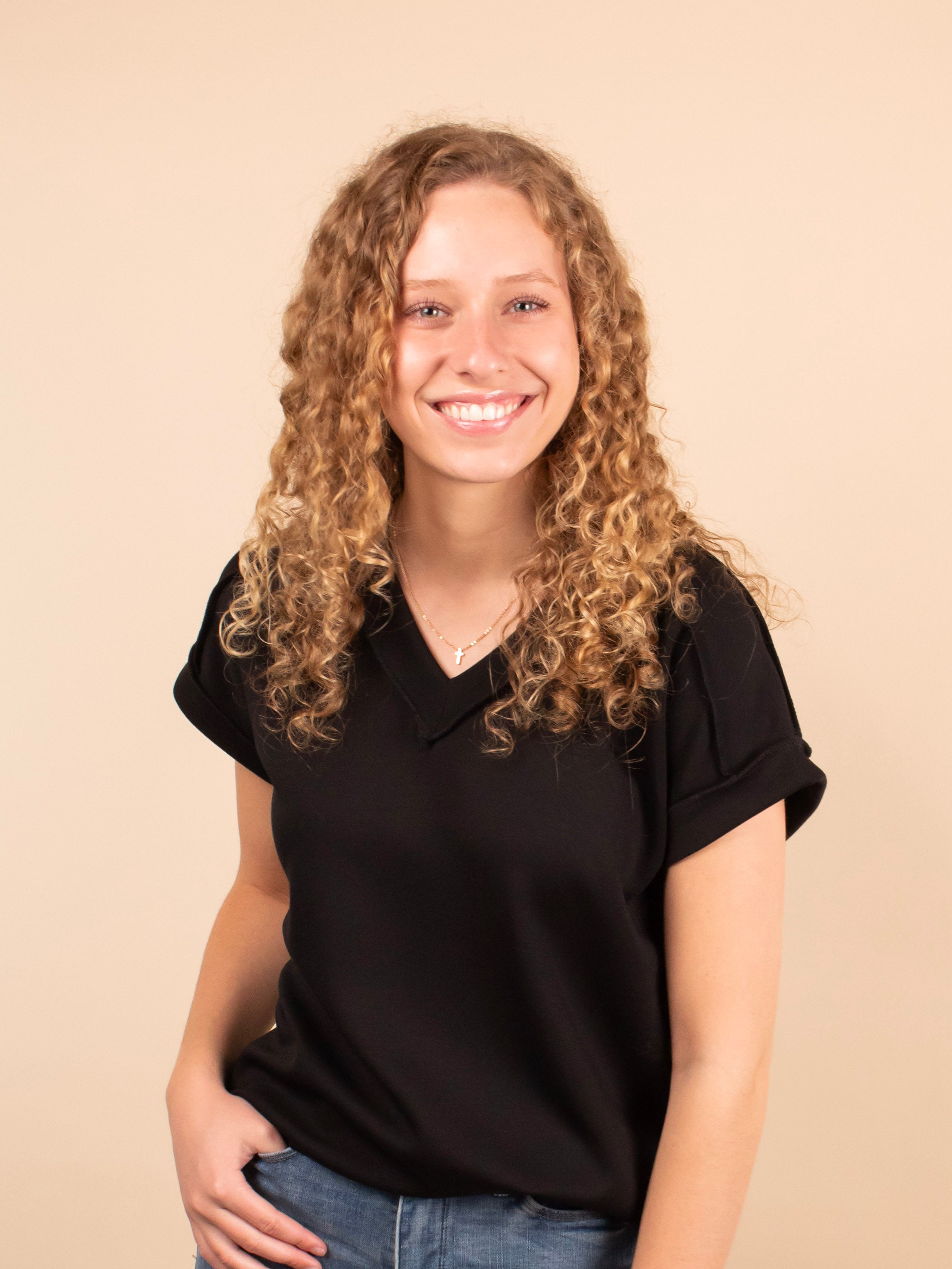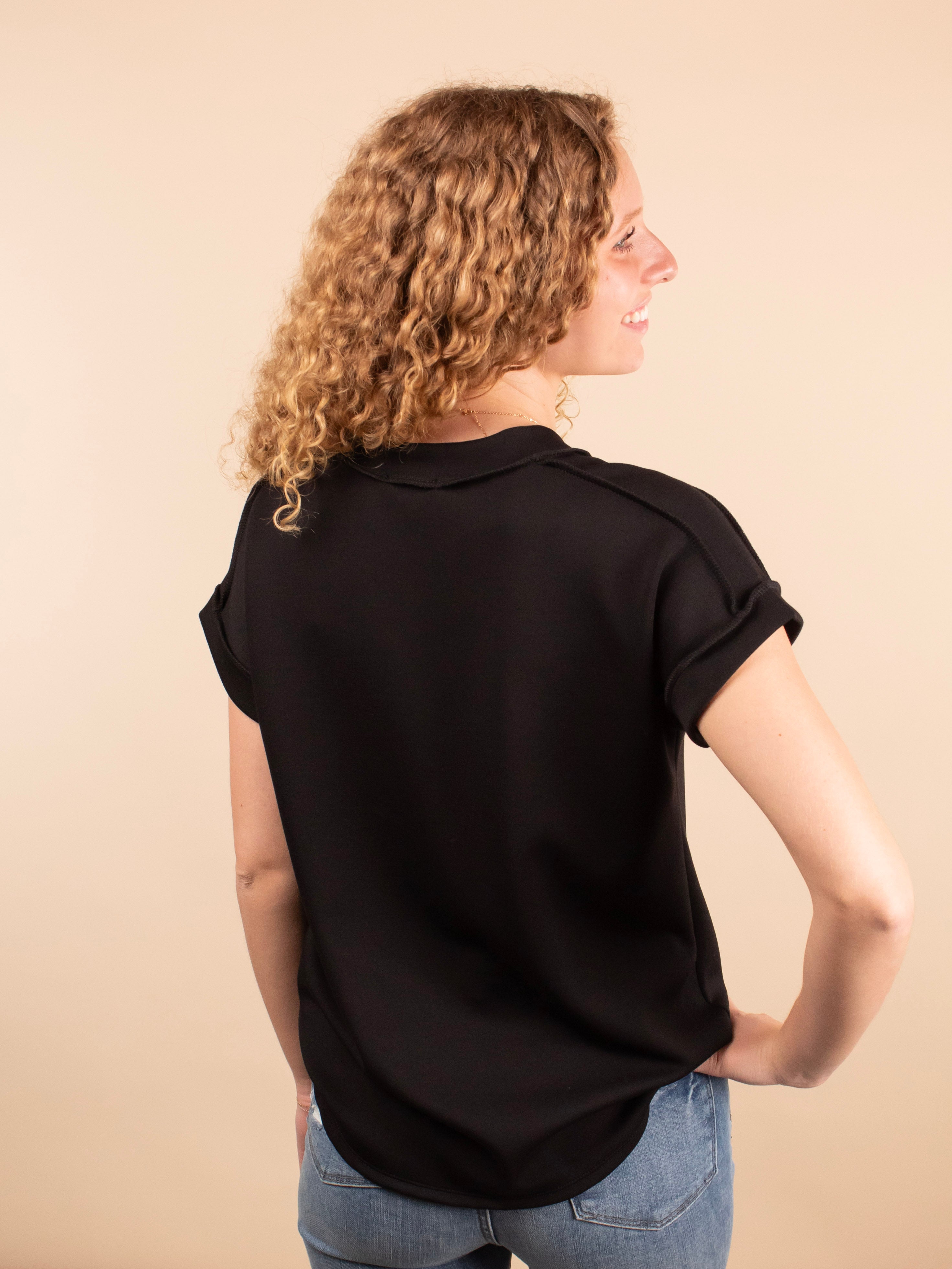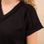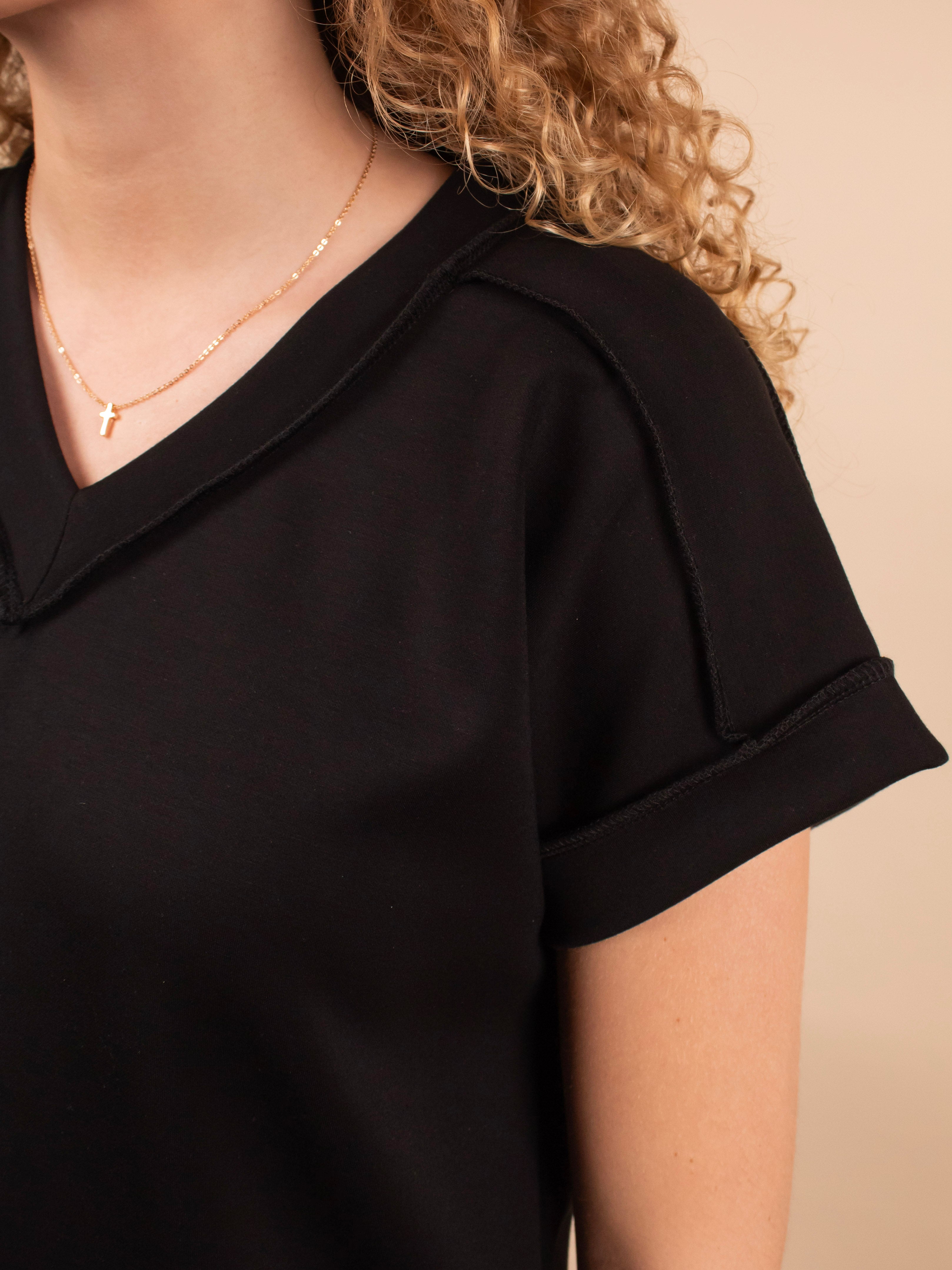 The Sleek & Simple Scuba Top in Black updates your basic tee with a soft, squishy scuba-like fabric that feels luxurious and smooth against the skin. Featuring a flattering v-neck and subtle raw hem detailing at the seams, this top adds a trendy edge to classic colors. It’s the perfect blend of comfort and style, easily dressed up or down for any occasion.