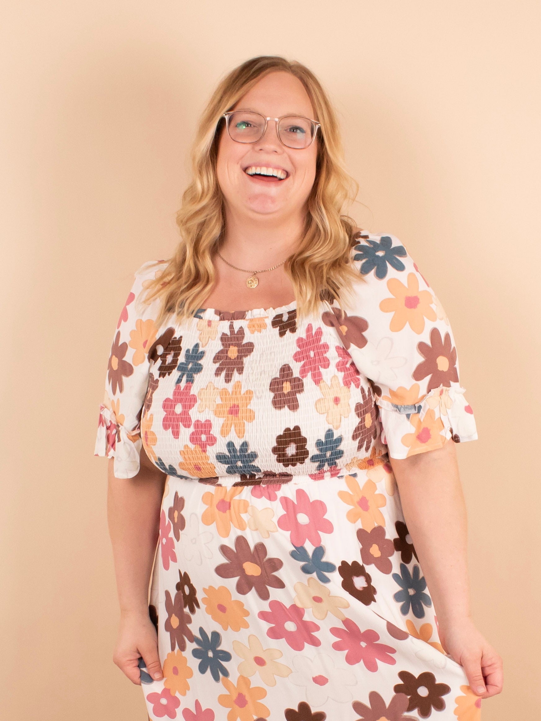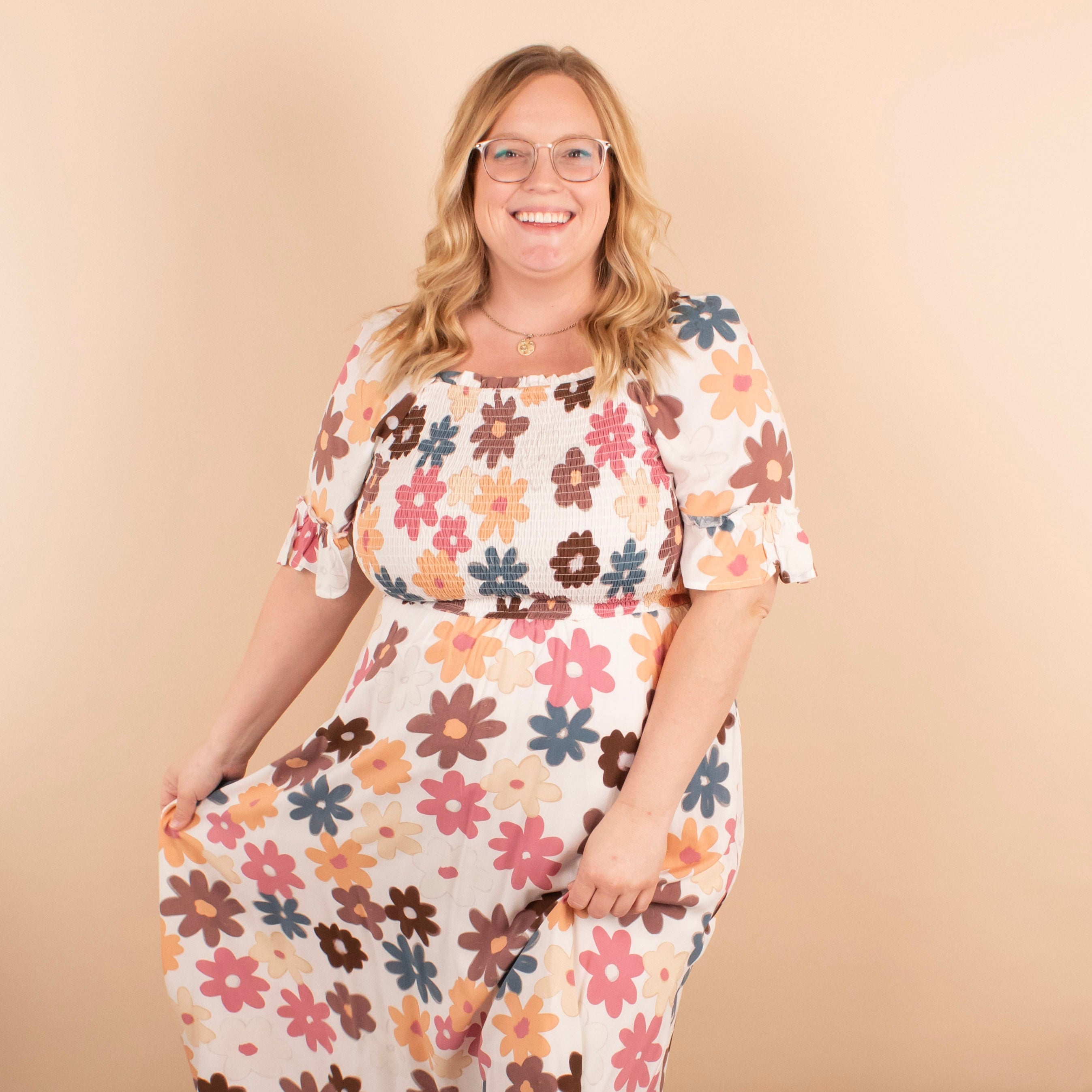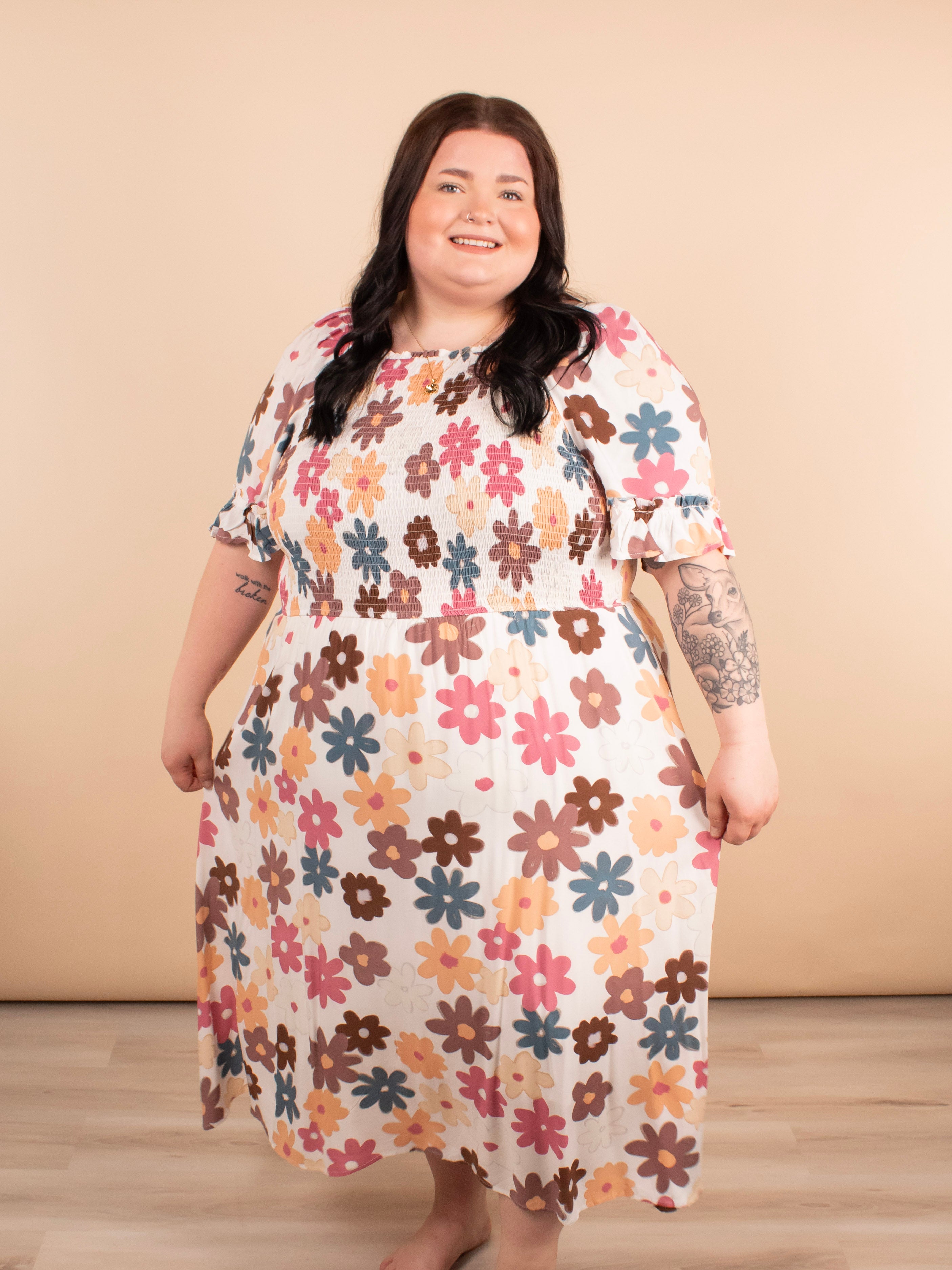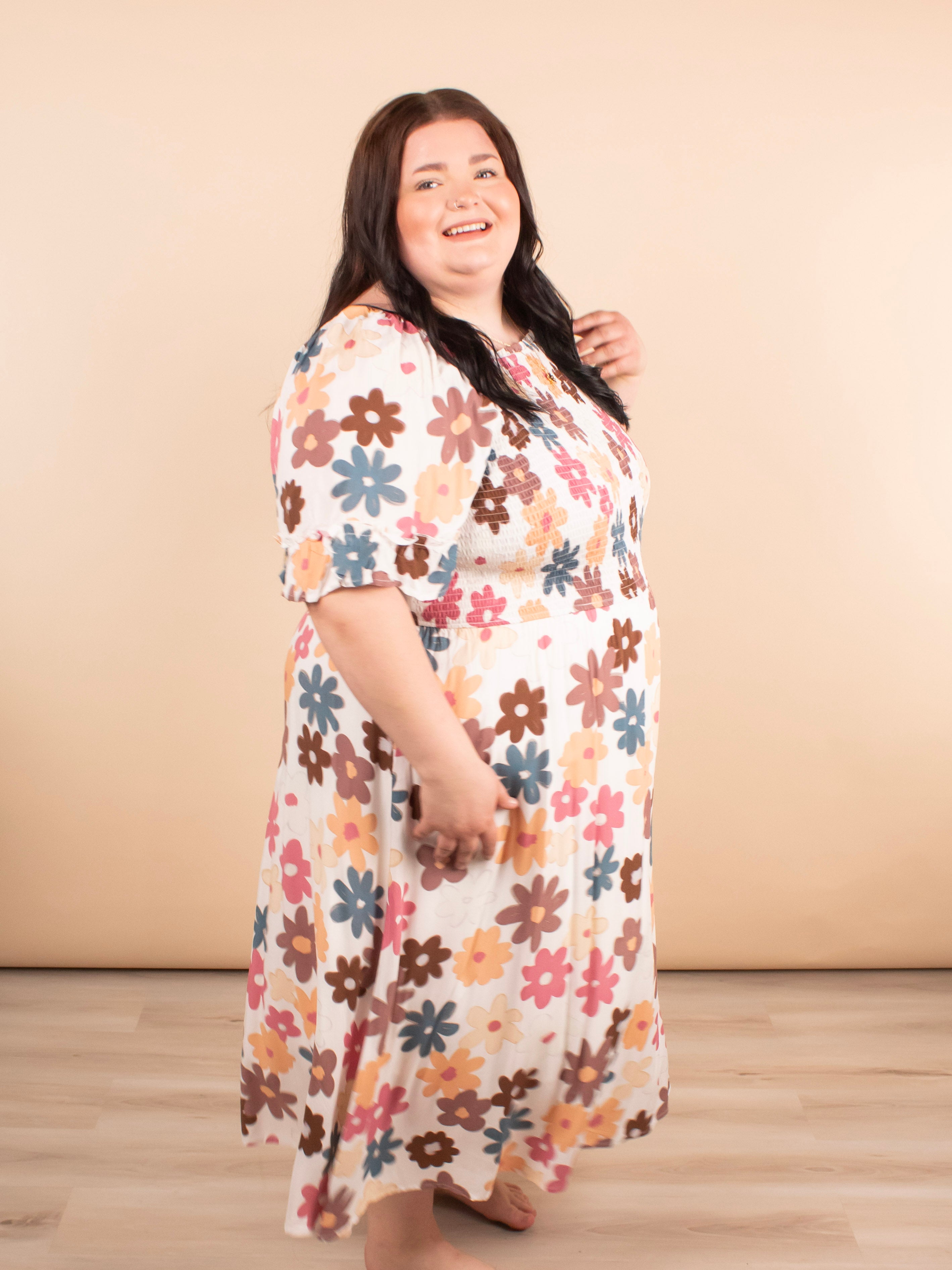 Effortlessly elegant and perfect for any occasion, the Sunlit Blooms Midi Dress features an adorable floral pattern, super stretchy bodice, and pockets for practicality. The midi length is great for any height, and with double lining, it's not see through. A must-have addition to any wardrobe.