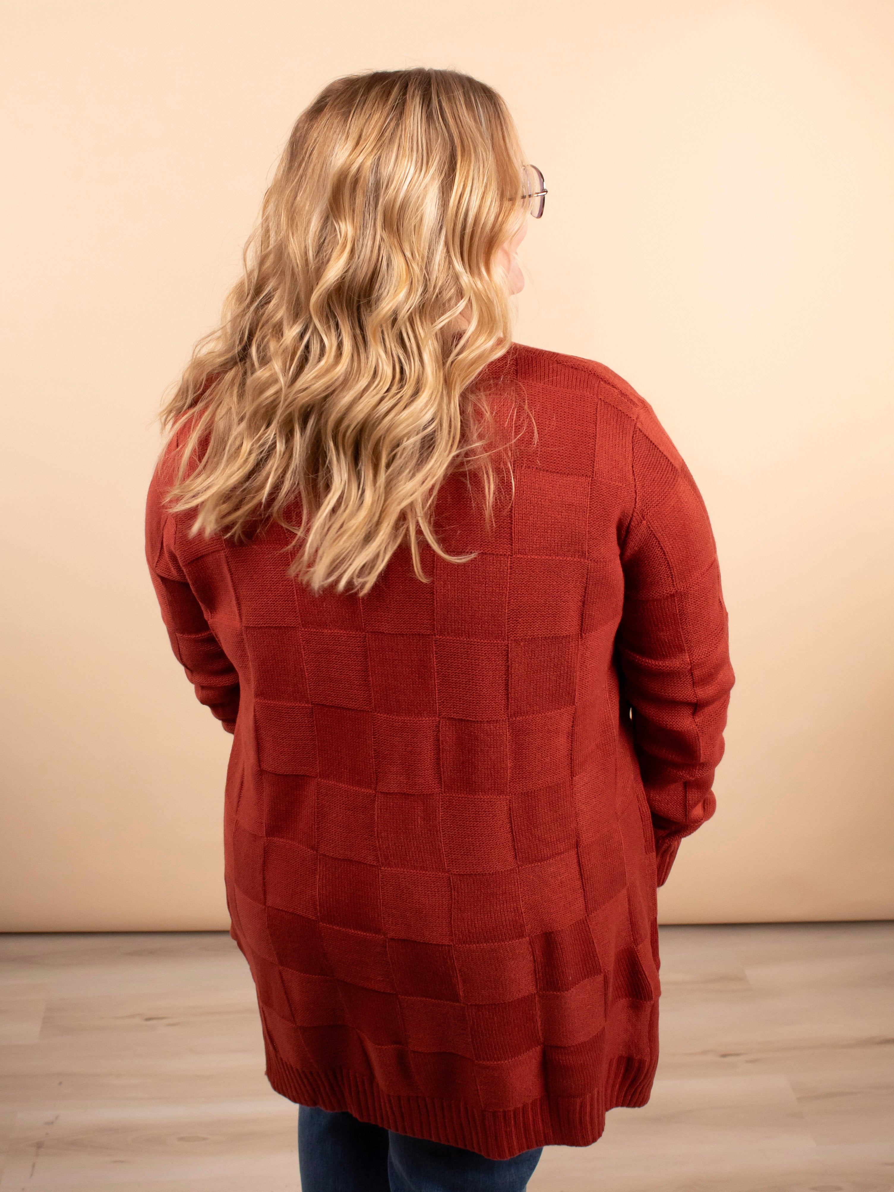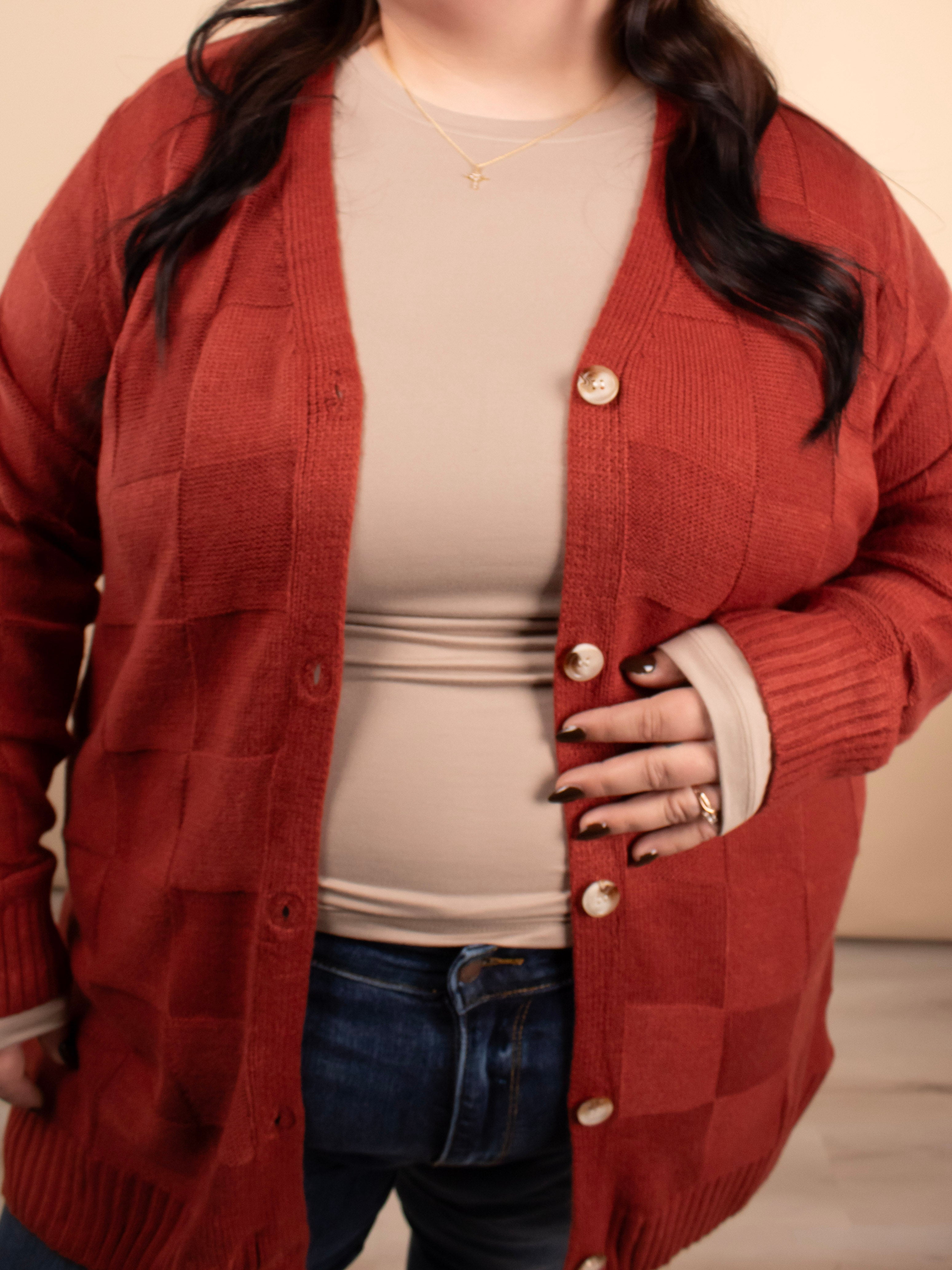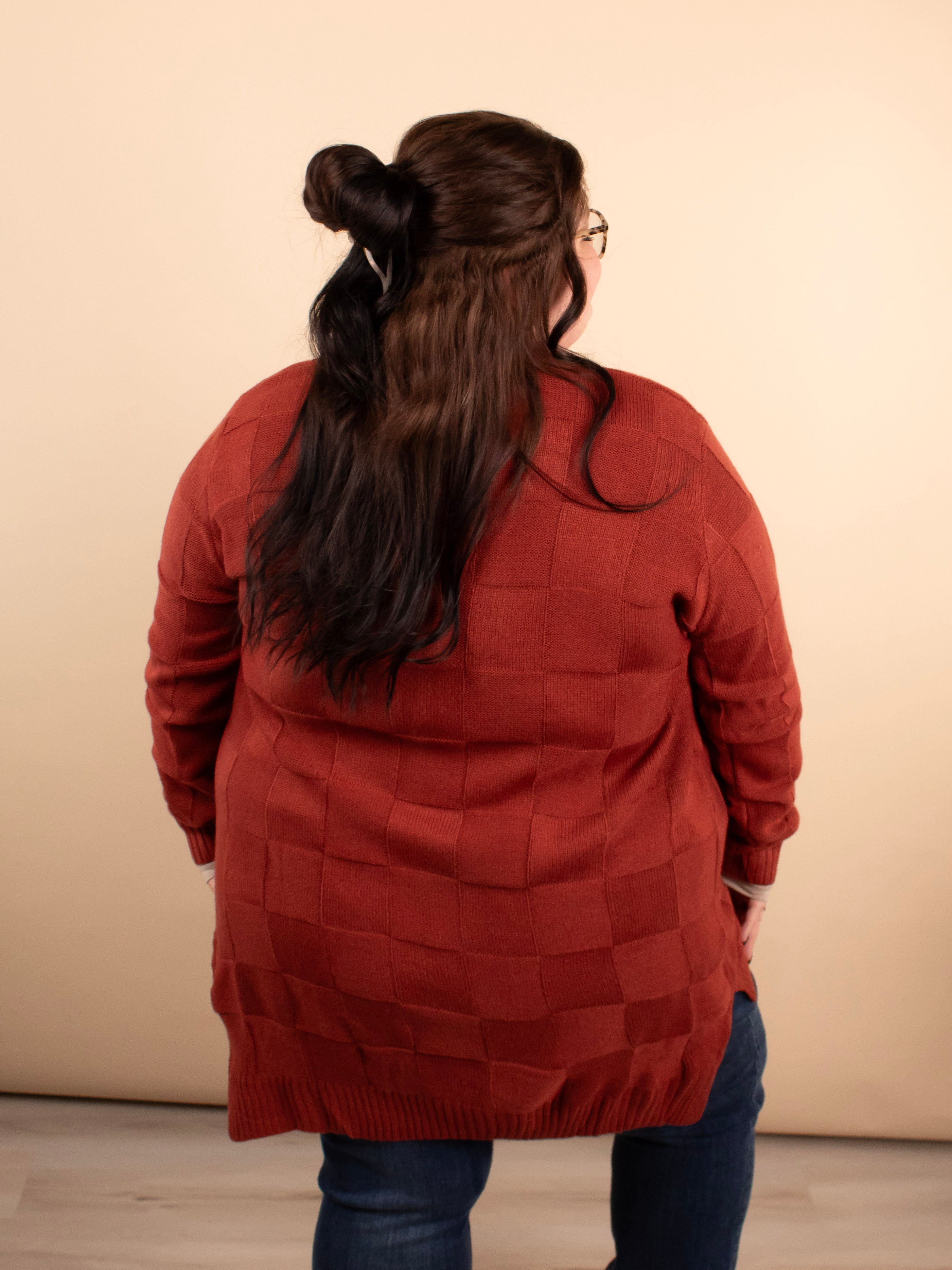 The Sweater Season Textured Cardigan is a must-have layer for cozy days ahead. Featuring a beautiful brick red hue and an adorable textured checker pattern, this cardigan adds the perfect pop of warmth and style to any outfit. The slight hi-low hem offers flattering coverage, making it ideal for pairing with leggings or jeans all season long.