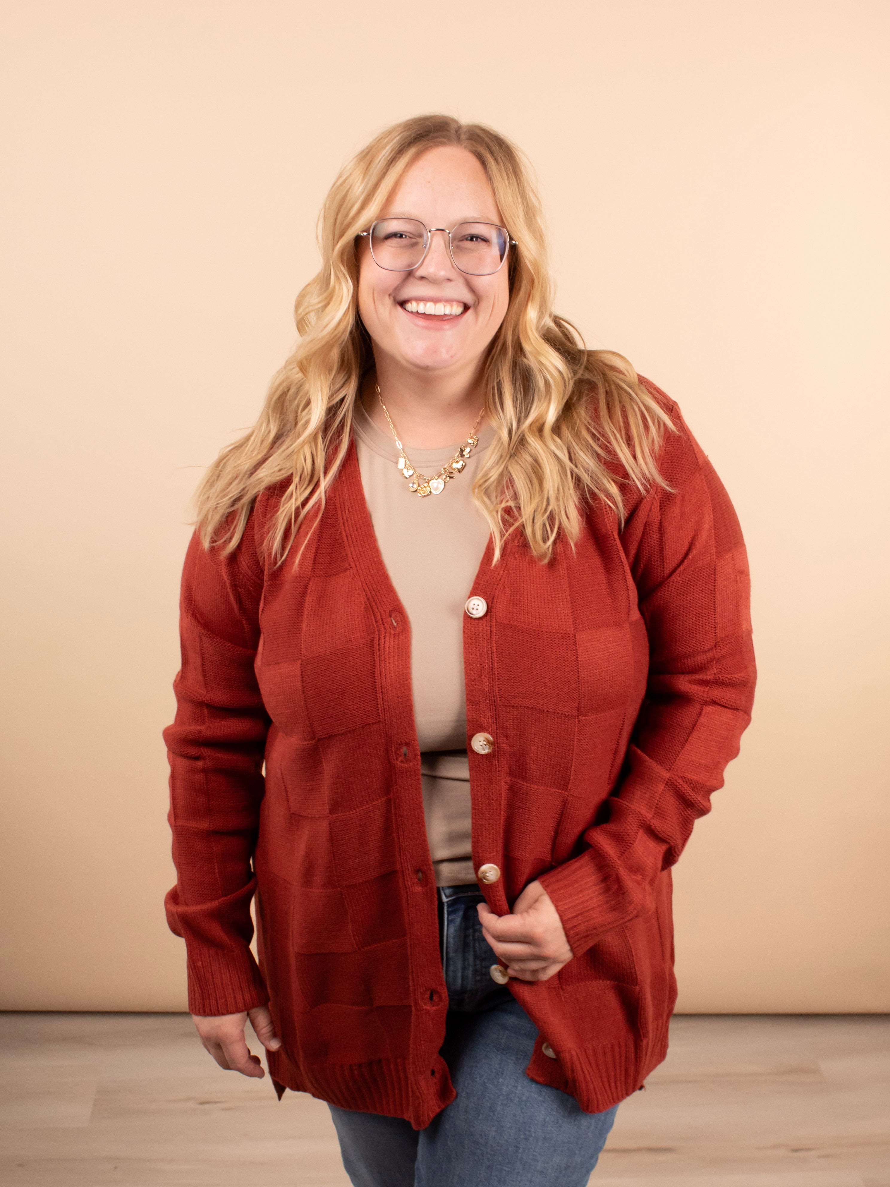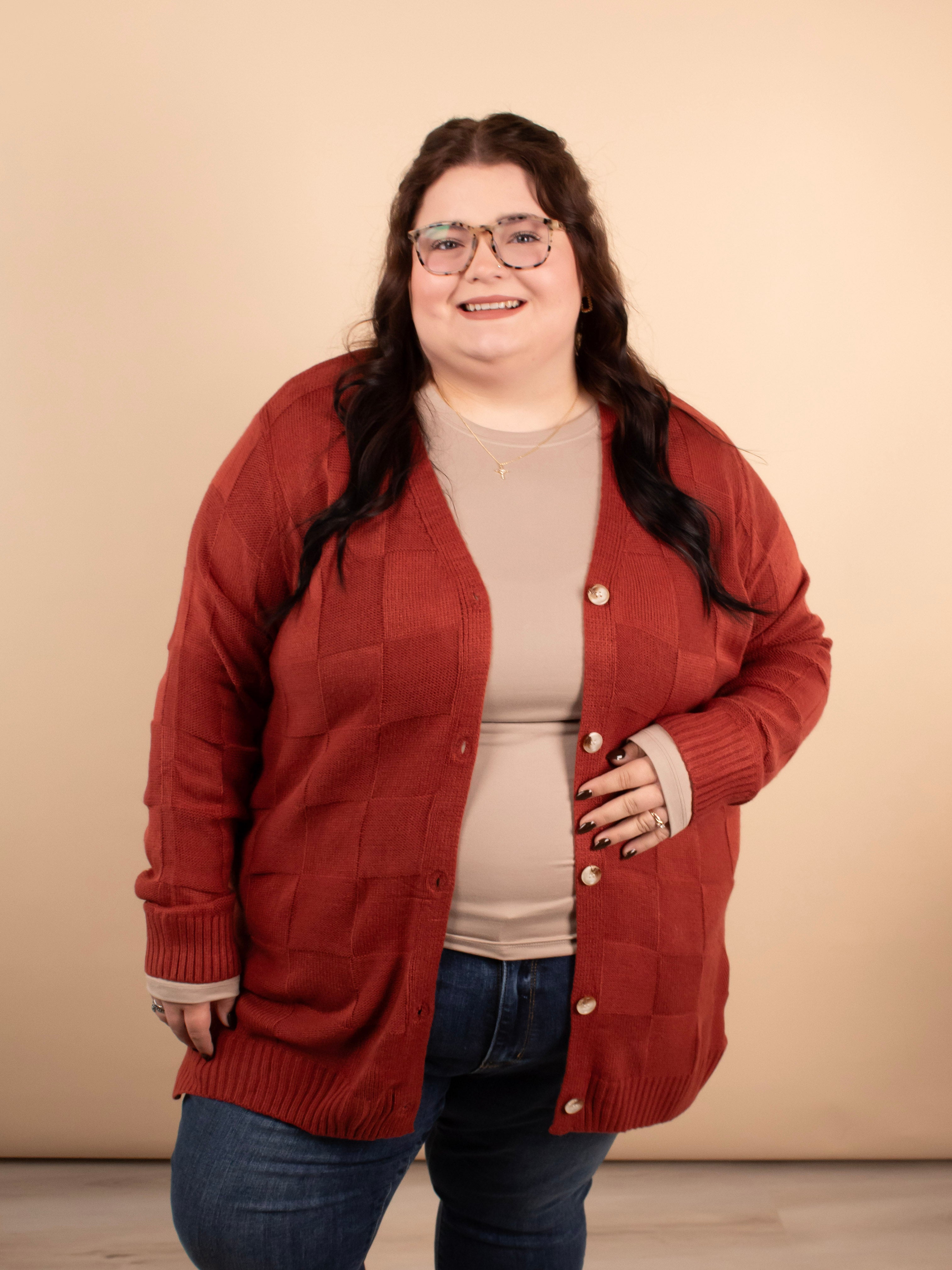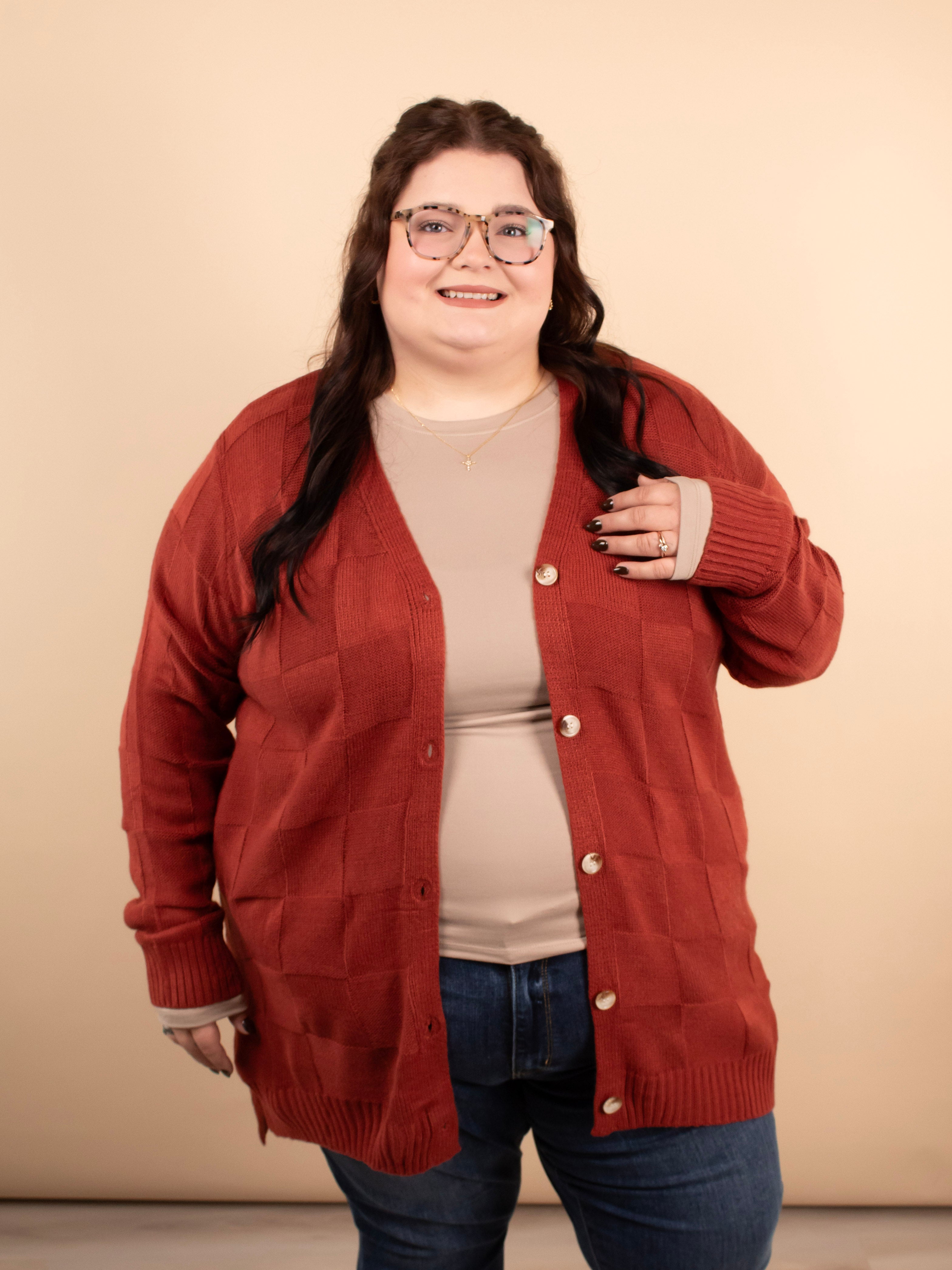 The Sweater Season Textured Cardigan is a must-have layer for cozy days ahead. Featuring a beautiful brick red hue and an adorable textured checker pattern, this cardigan adds the perfect pop of warmth and style to any outfit. The slight hi-low hem offers flattering coverage, making it ideal for pairing with leggings or jeans all season long.