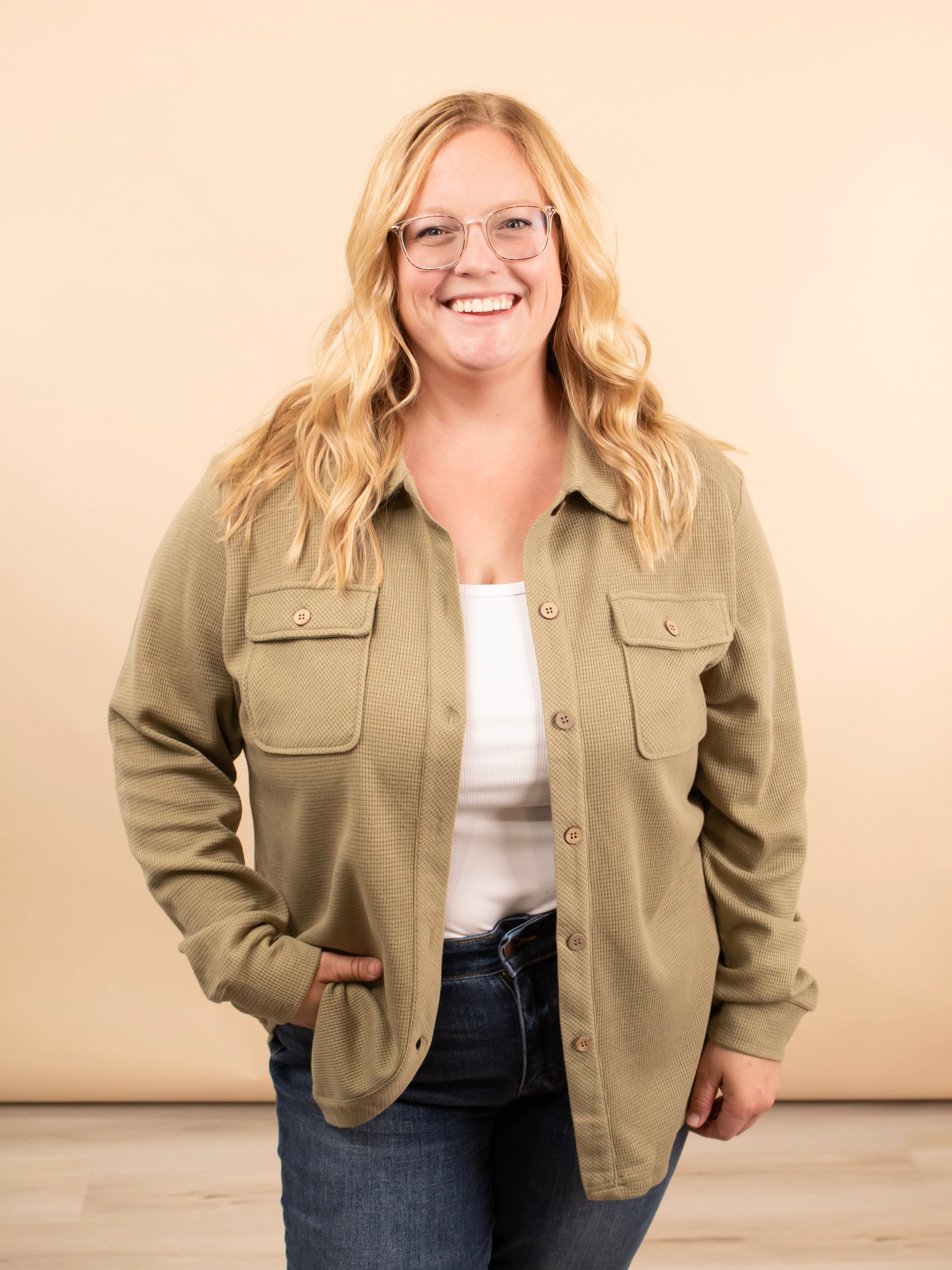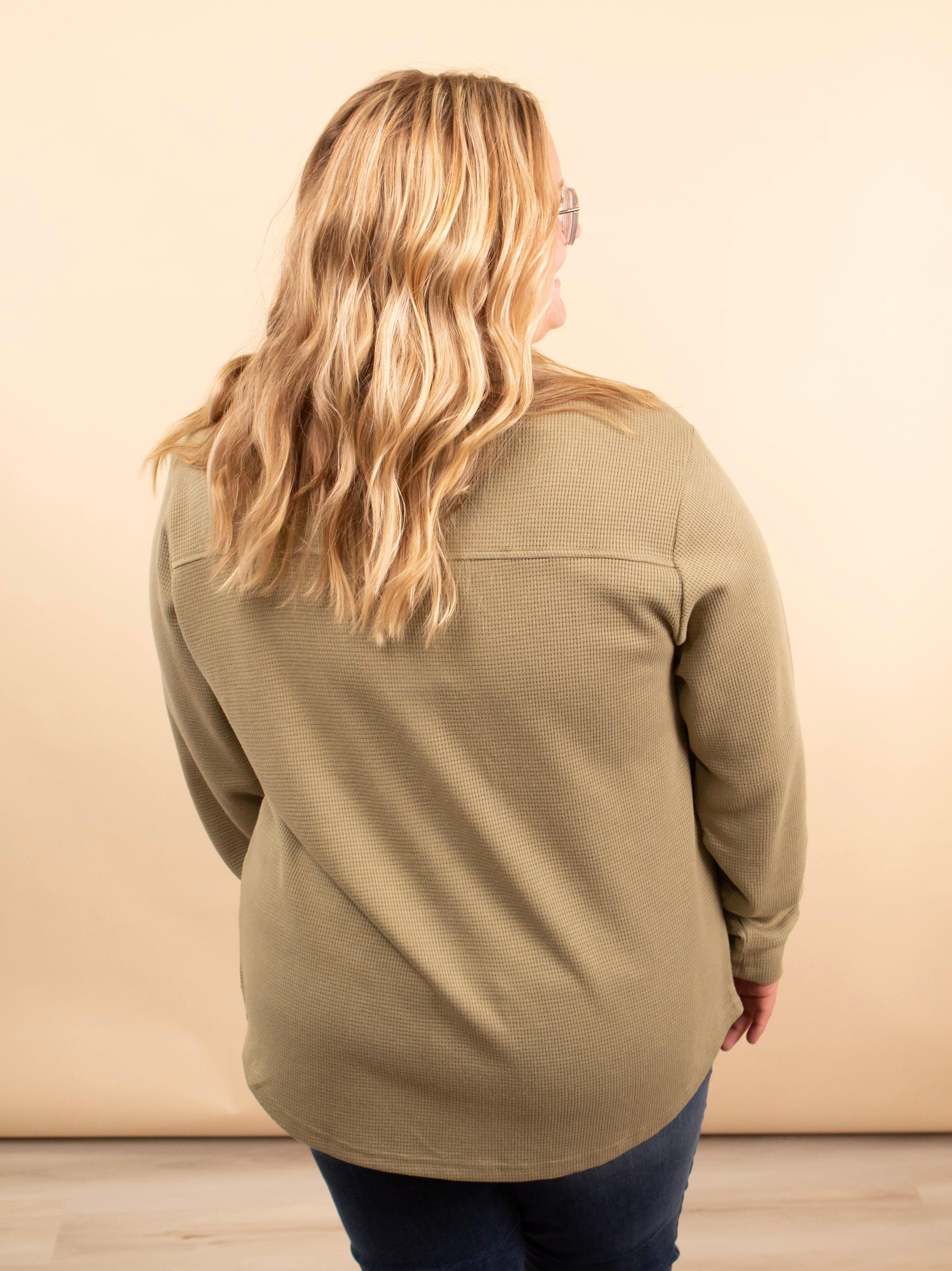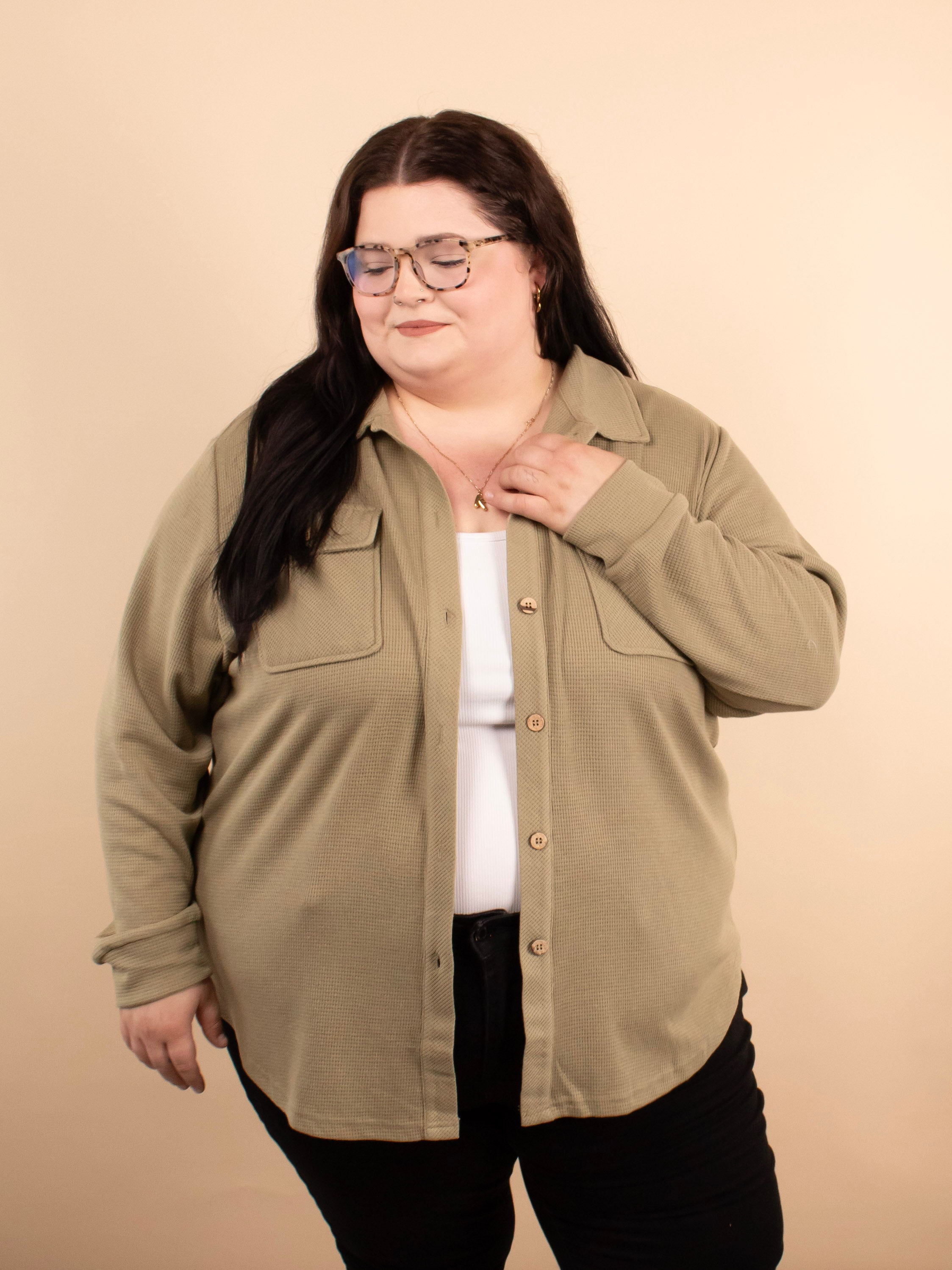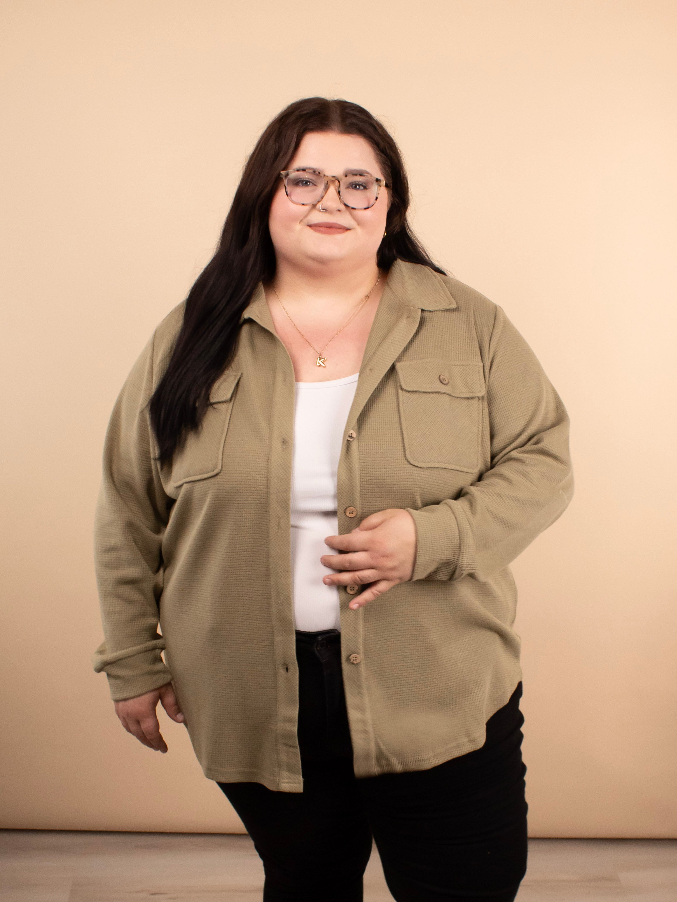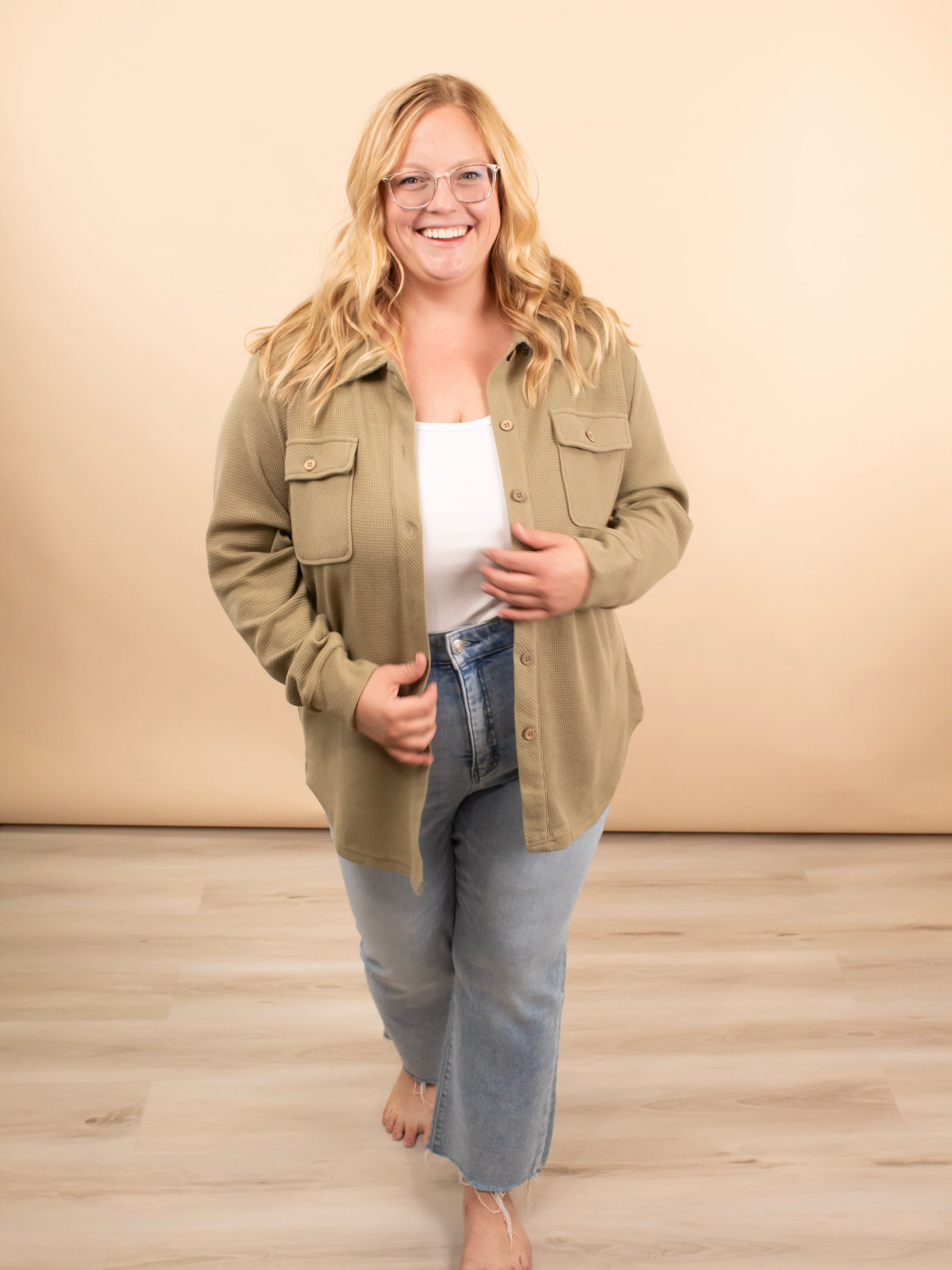 A true closet classic. The Timeless Threads Thermal Button Up in Light Olive is soft, stretchy, and endlessly versatile. Perfect for layering, it pairs effortlessly with a tank, graphic tee, blouse, or worn buttoned up on its own. A piece you’ll reach for year-round.
