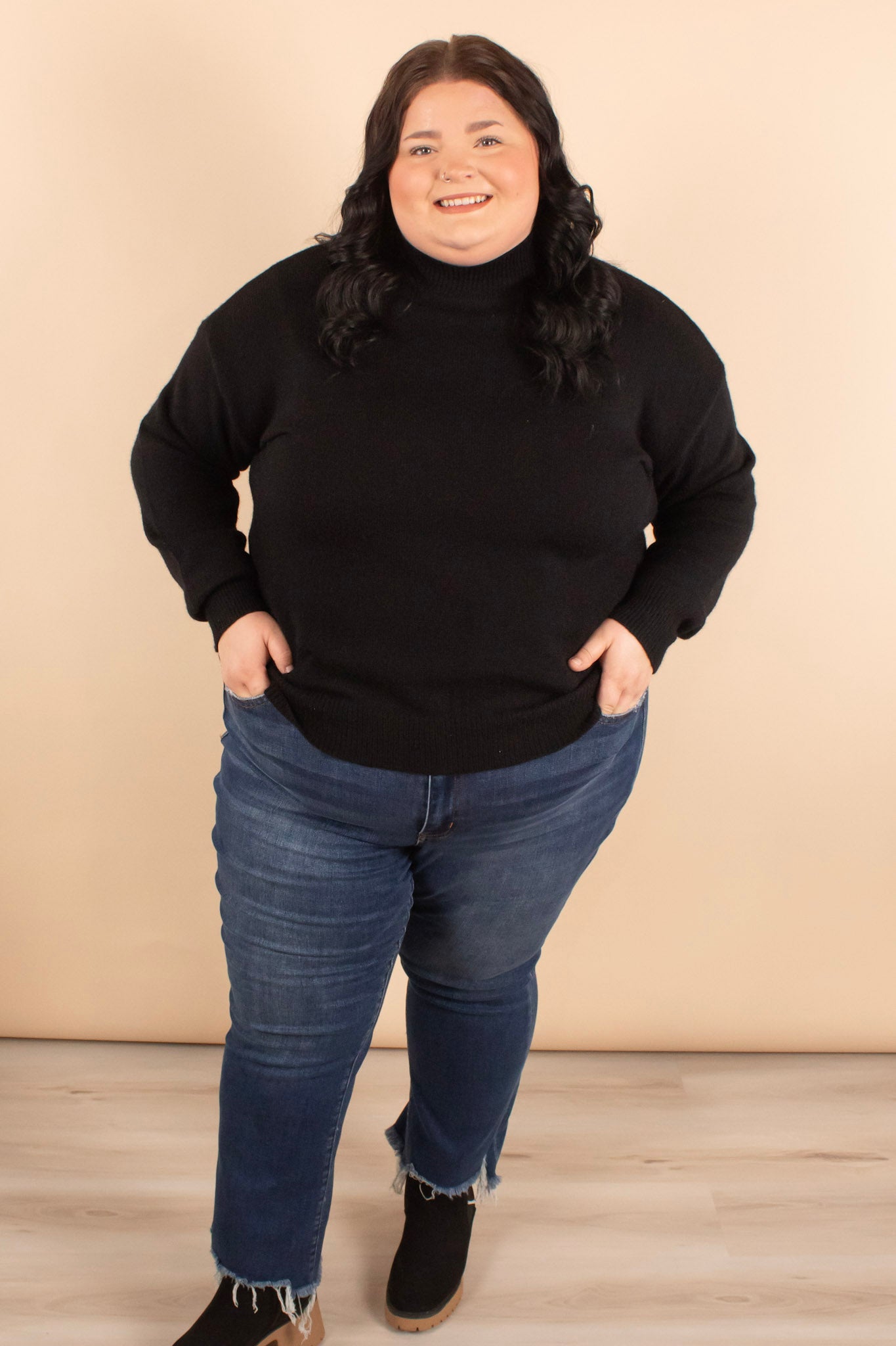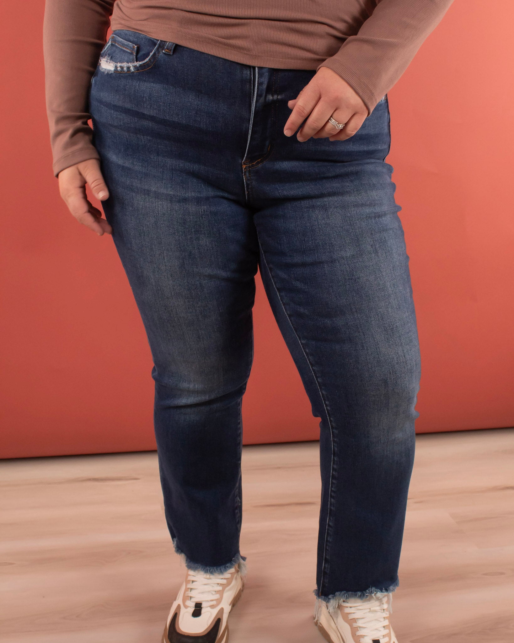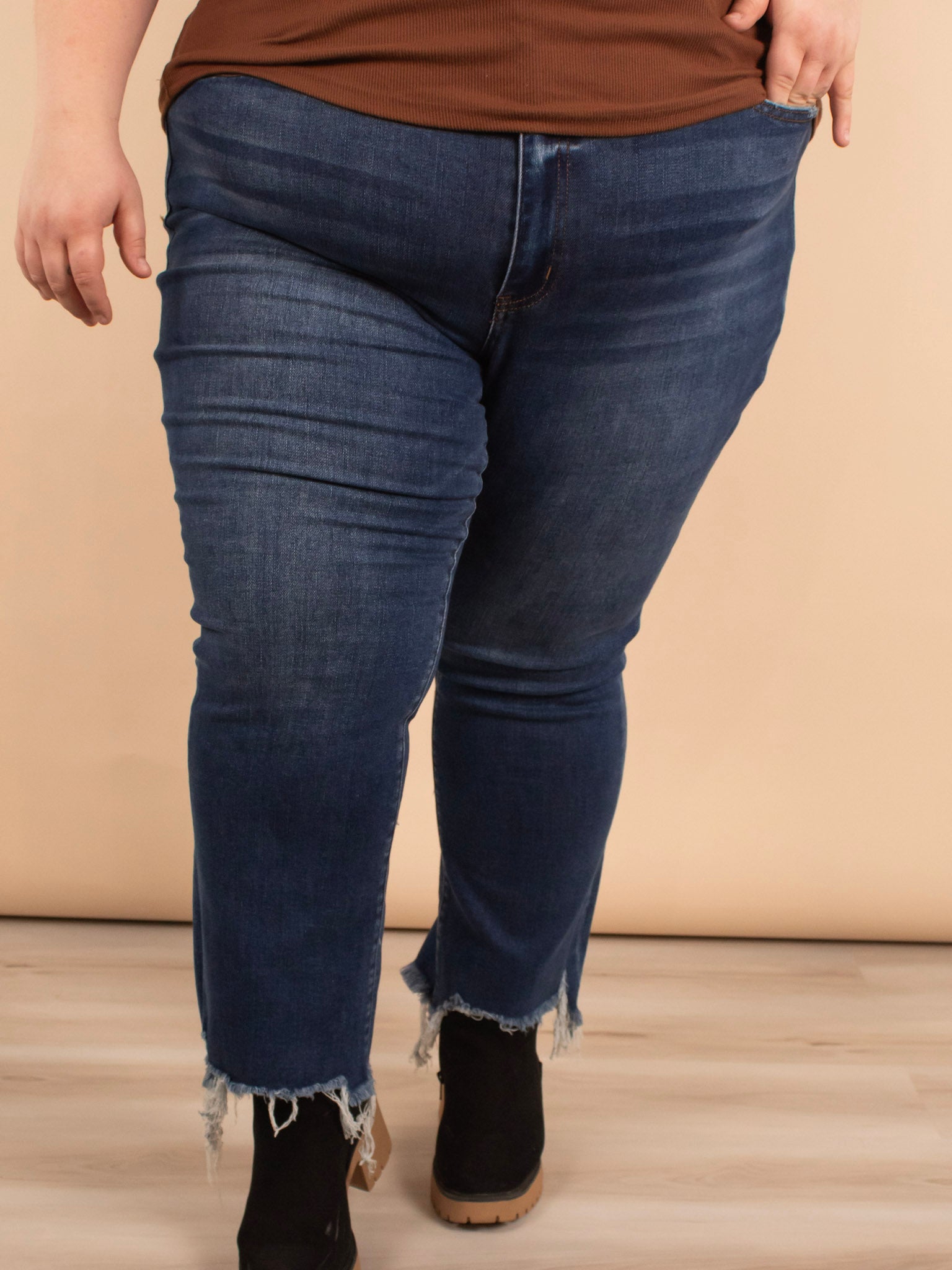 These jeans take the cake! The frayed hem detail adds texture to the classic jean. The flare is the perfect size and is effortlessly flattering. Complete with the prettiest classic dark wash. Pair these with countless looks ranging from sneakers and a shacket to a cute top, cardigan, and booties. Plus, you have to feel how soft these are!